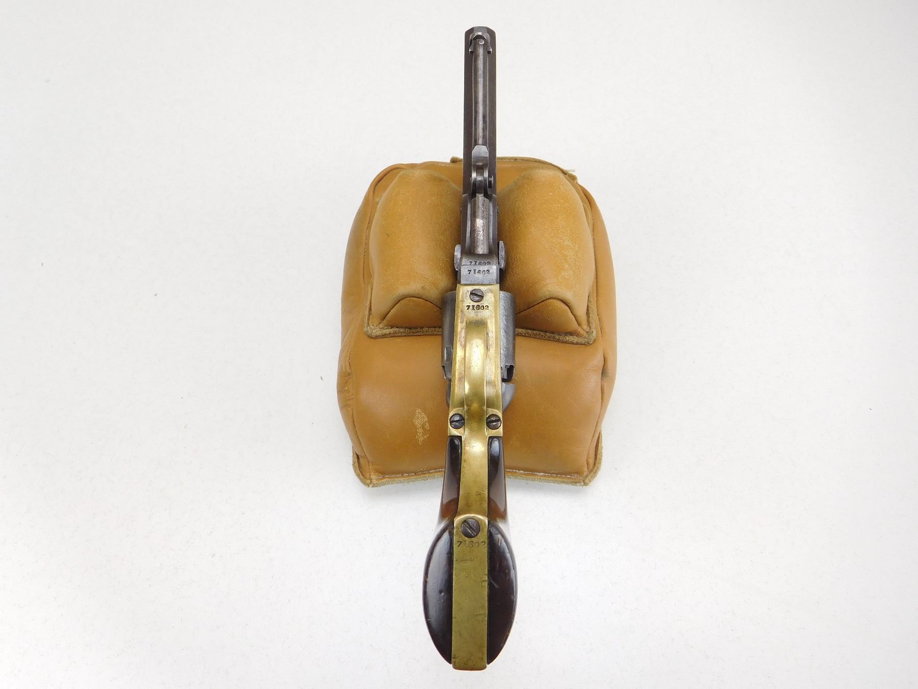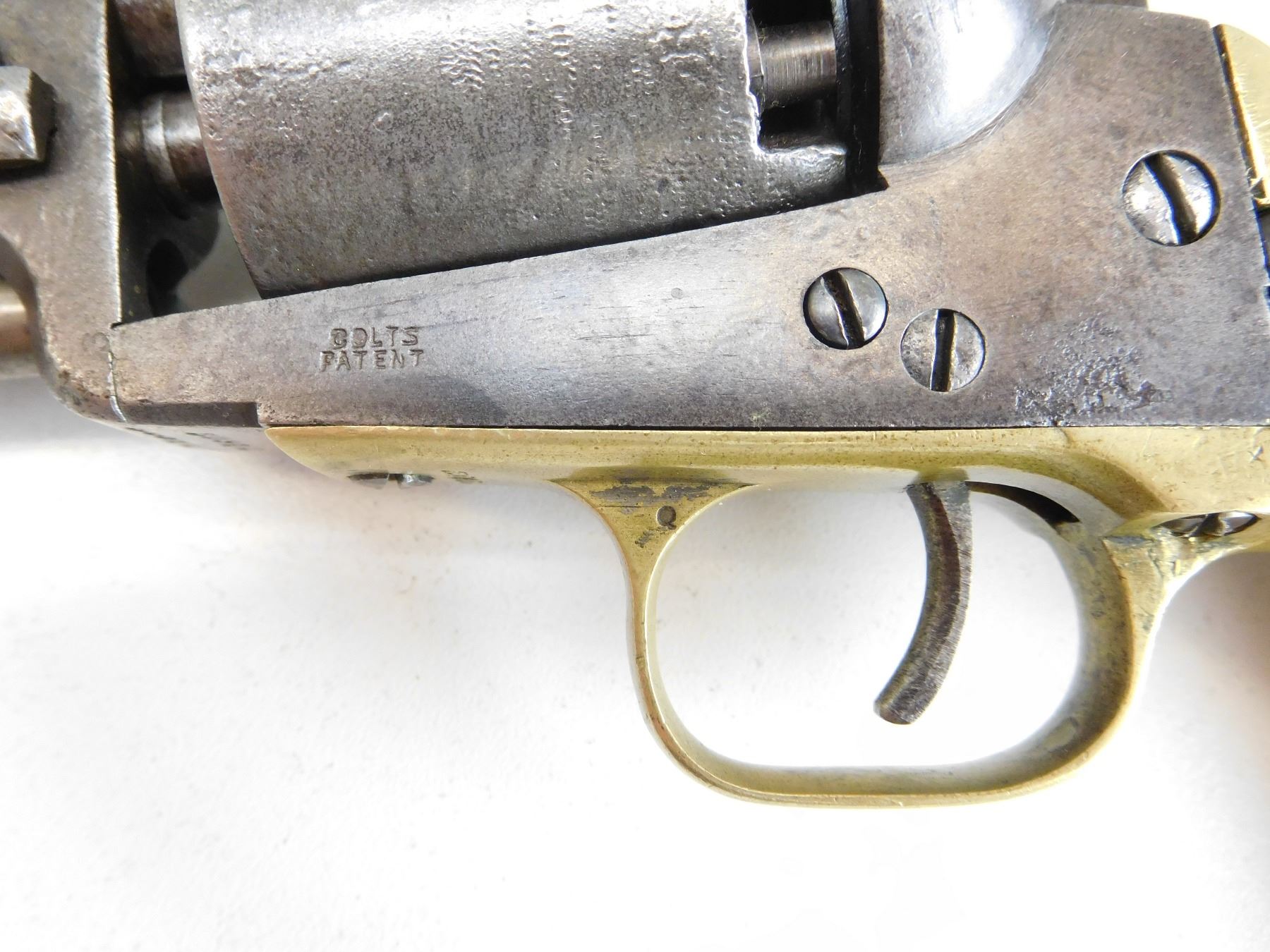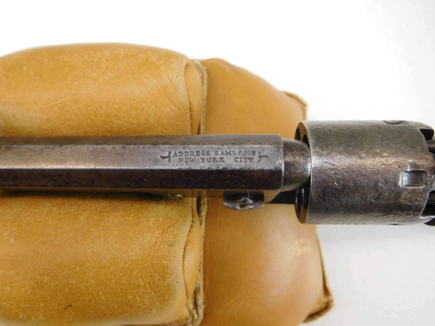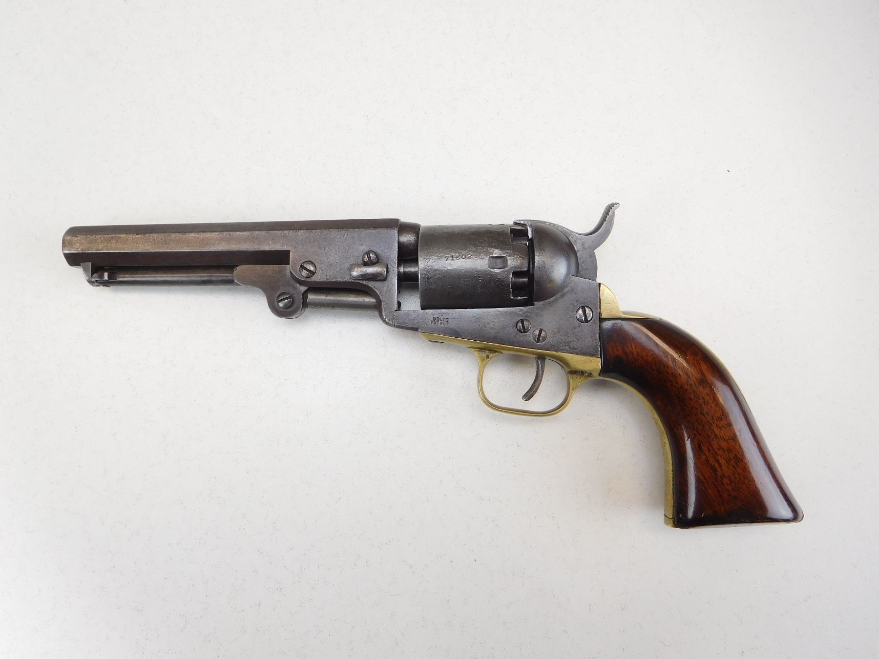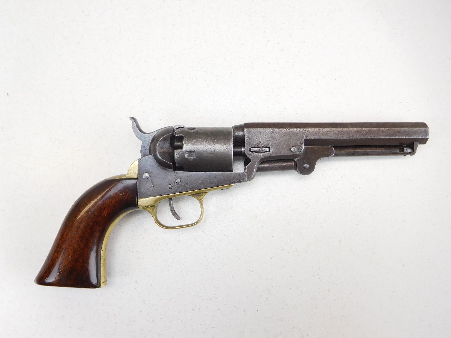MANUFACTURED IN 1853, MATCHING NUMBERS, FADED CYLINDER SCENE, BRASS BEAD FRONT AND HAMMER MOUNTED REAR SIGHT, OCTAGONAL BARREL, LOCKS UP AN INDEXES BORWN FINISH , ACTION: REVOLVER , BARREL LENGTH: 5" , , , CONDITION: ANTIQUE 6/10 , CLASS: CANADIAN ANTIQUE CLASS