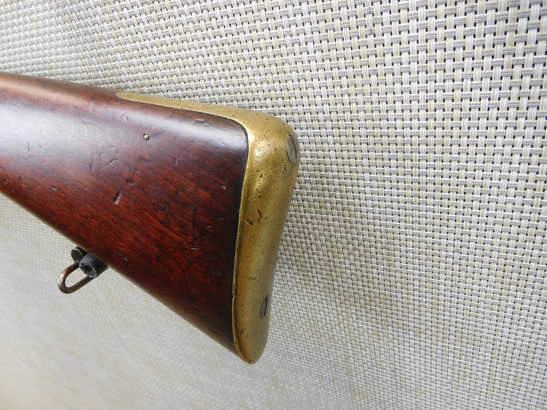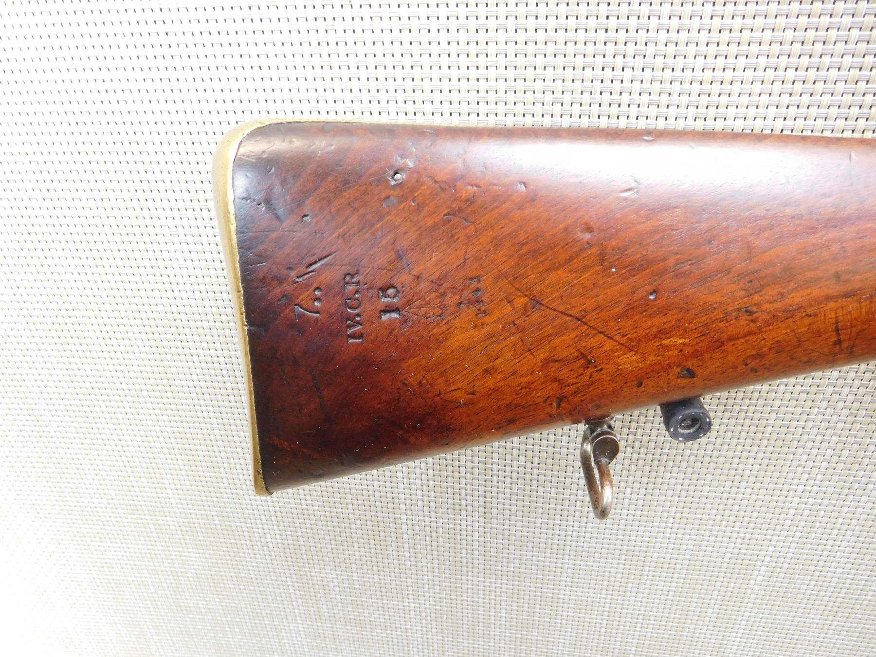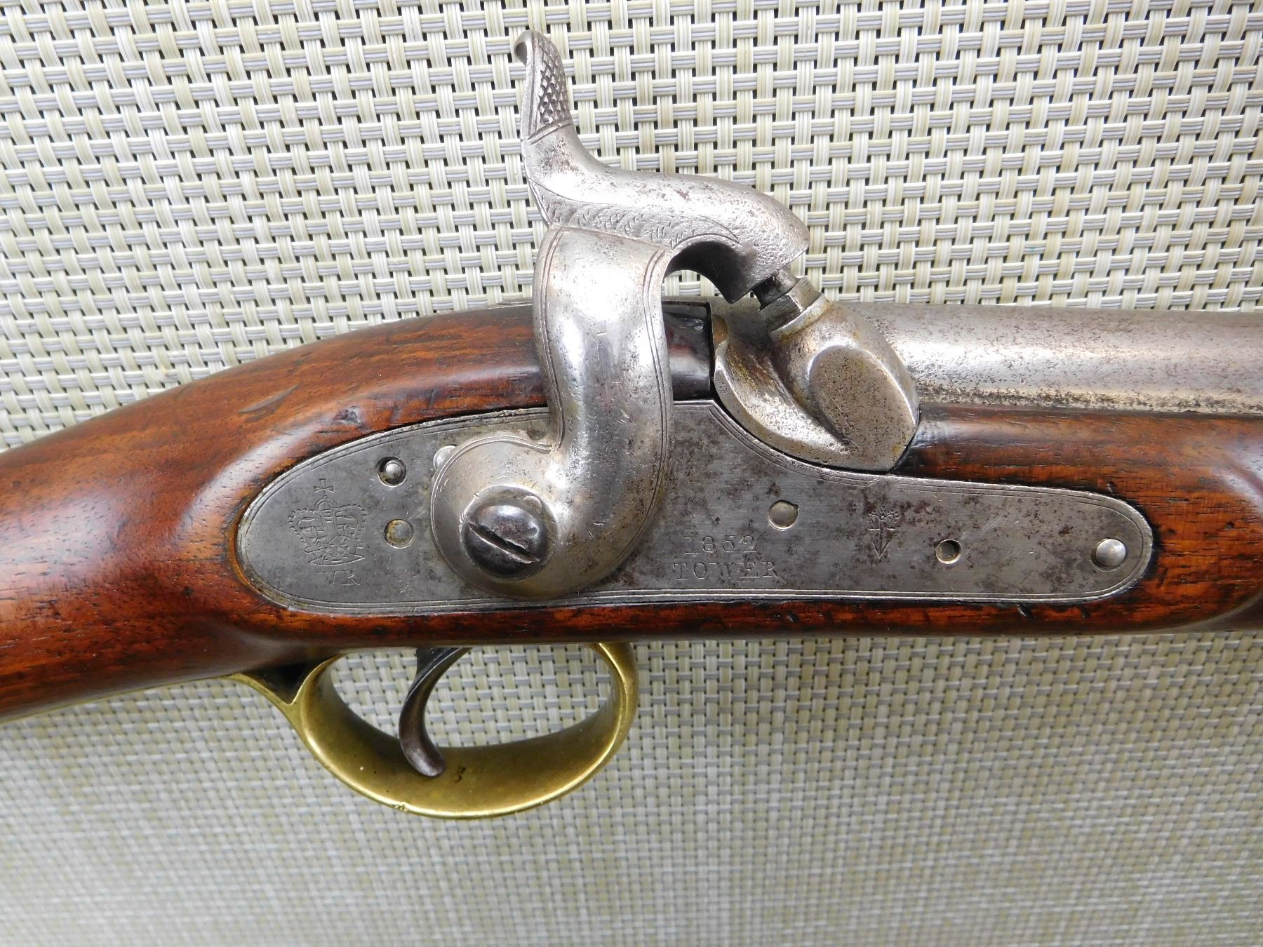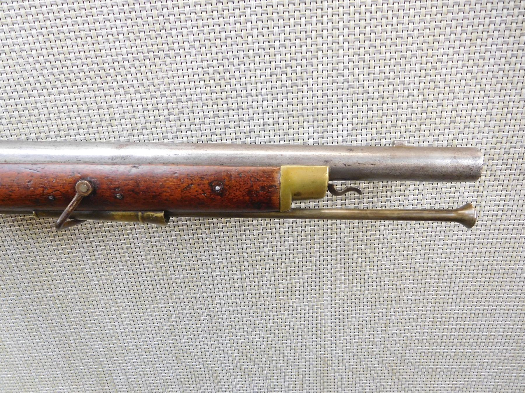 1852 TOWER, REGIMENTAL MARKSC/3692,ORIGINAL RAM ROD, BRASS FURNITURE, FEATUERS THE LOVELL BAYONET CATCH, BLOCK FRONT AND NO REAR SIGHT, SLING LOOPS , ACTION: SINGLE SHOT PERCUSSION , BARREL LENGTH: 26" , , , CONDITION: ANTIQUE 5/10 , CLASS: CANADIAN ANTIQUE CLASS