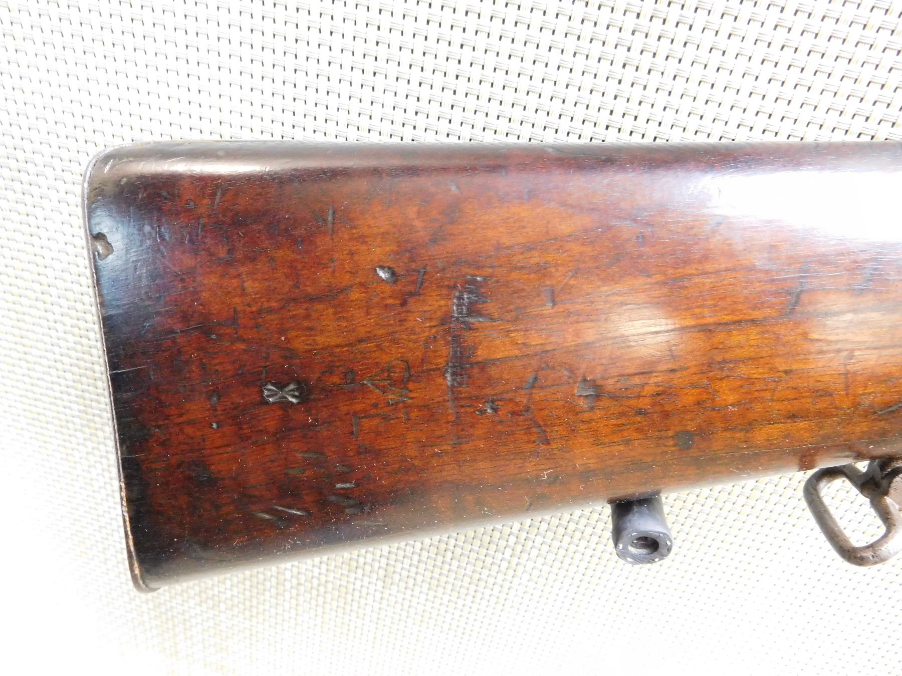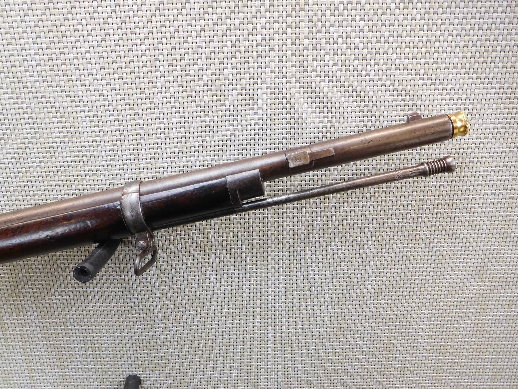 TOWER DATED 1858, STEEL FURNITURE WITH ORIGINAL NIPPLE PROTECTOR AND CHAIN, OUT OF SERVICE MARKINGS, BAYONET LUG, BORE PLUG, CLEANING ROD, GOOD BORE, SLING LOOPS, , ACTION: SINGLE SHOT PERCUSSION , BARREL LENGTH: 32" , , , CONDITION: ANTIQUE 6/10 , CLASS: CANADIAN ANTIQUE CLASS