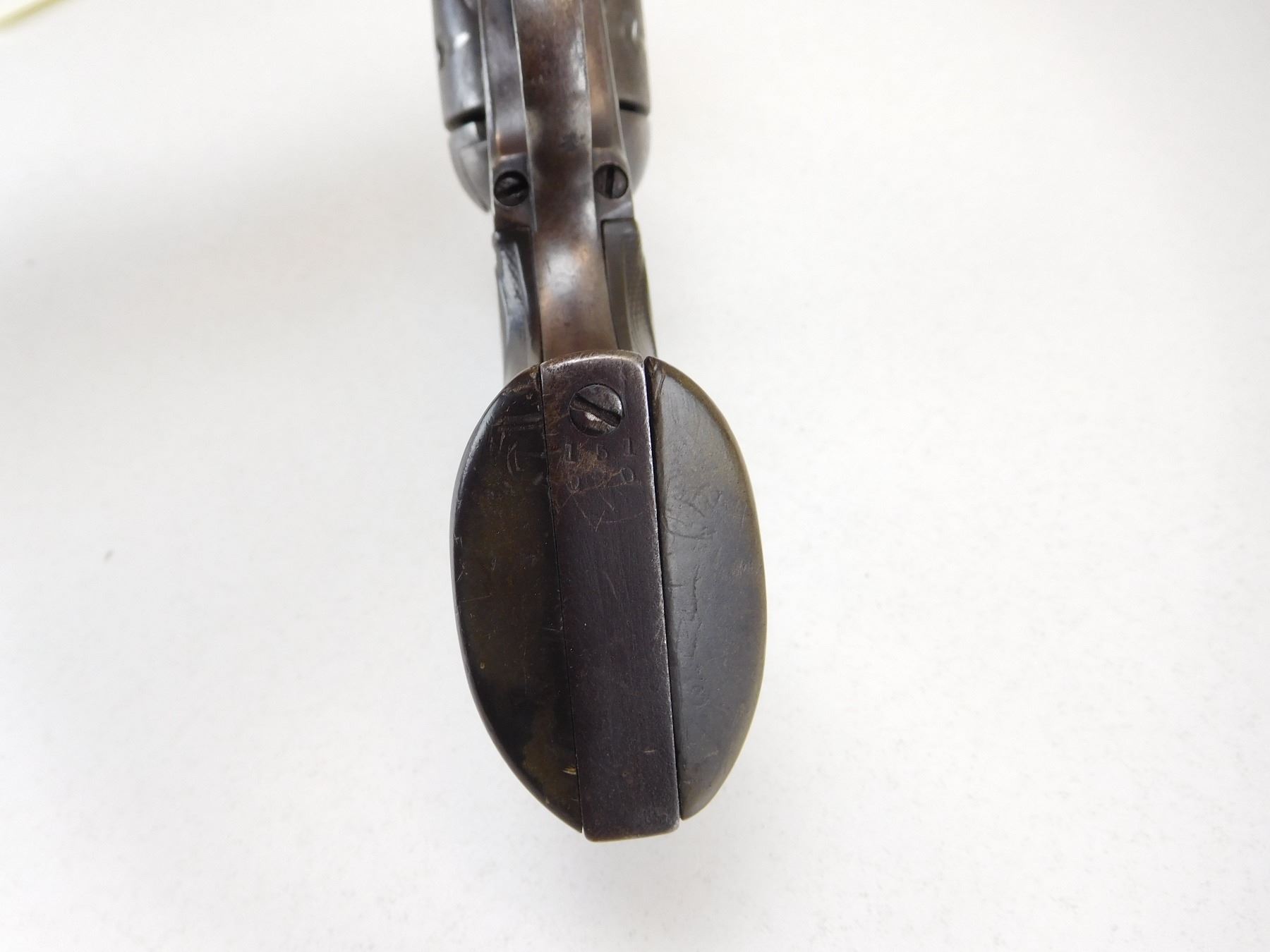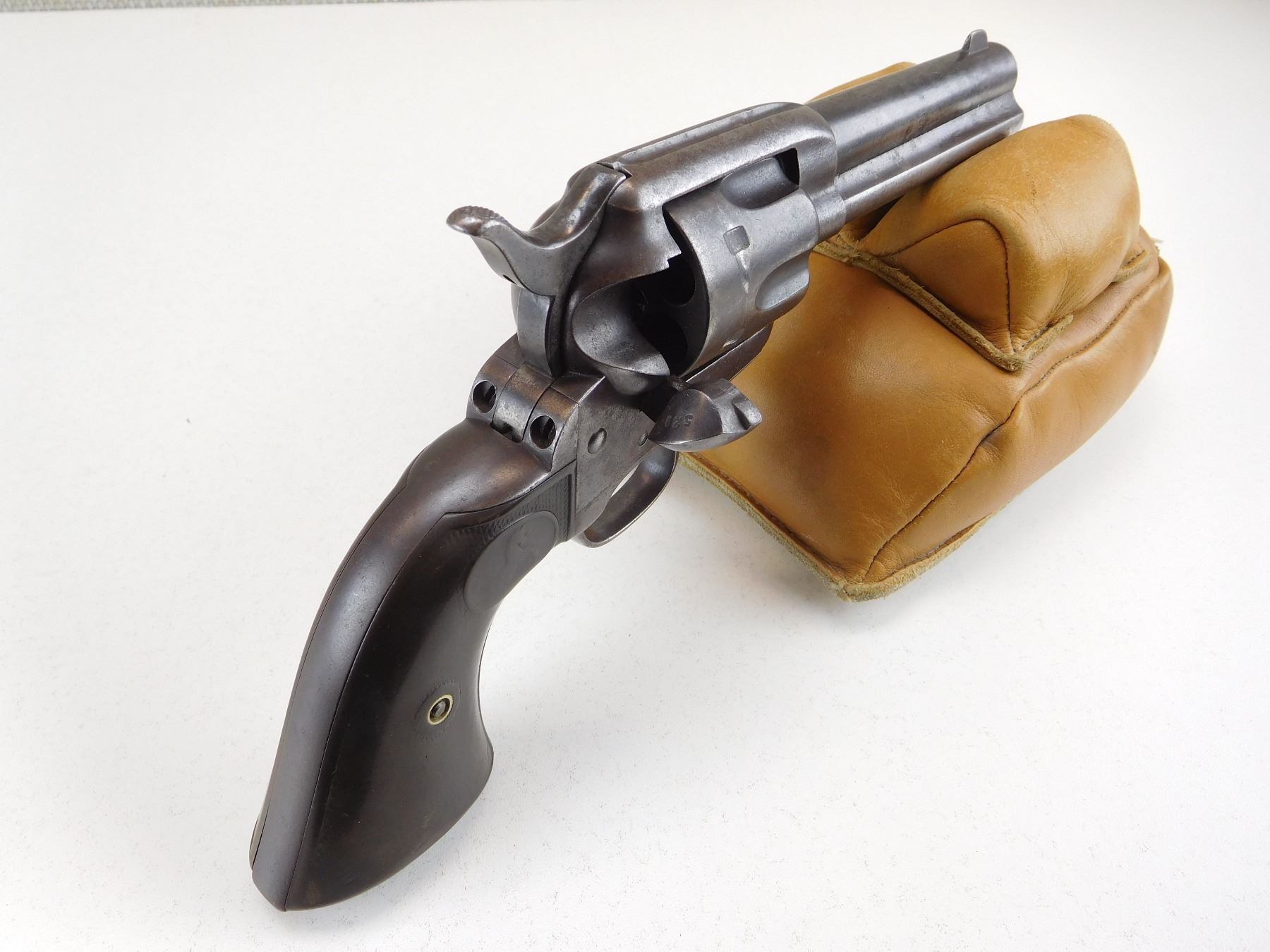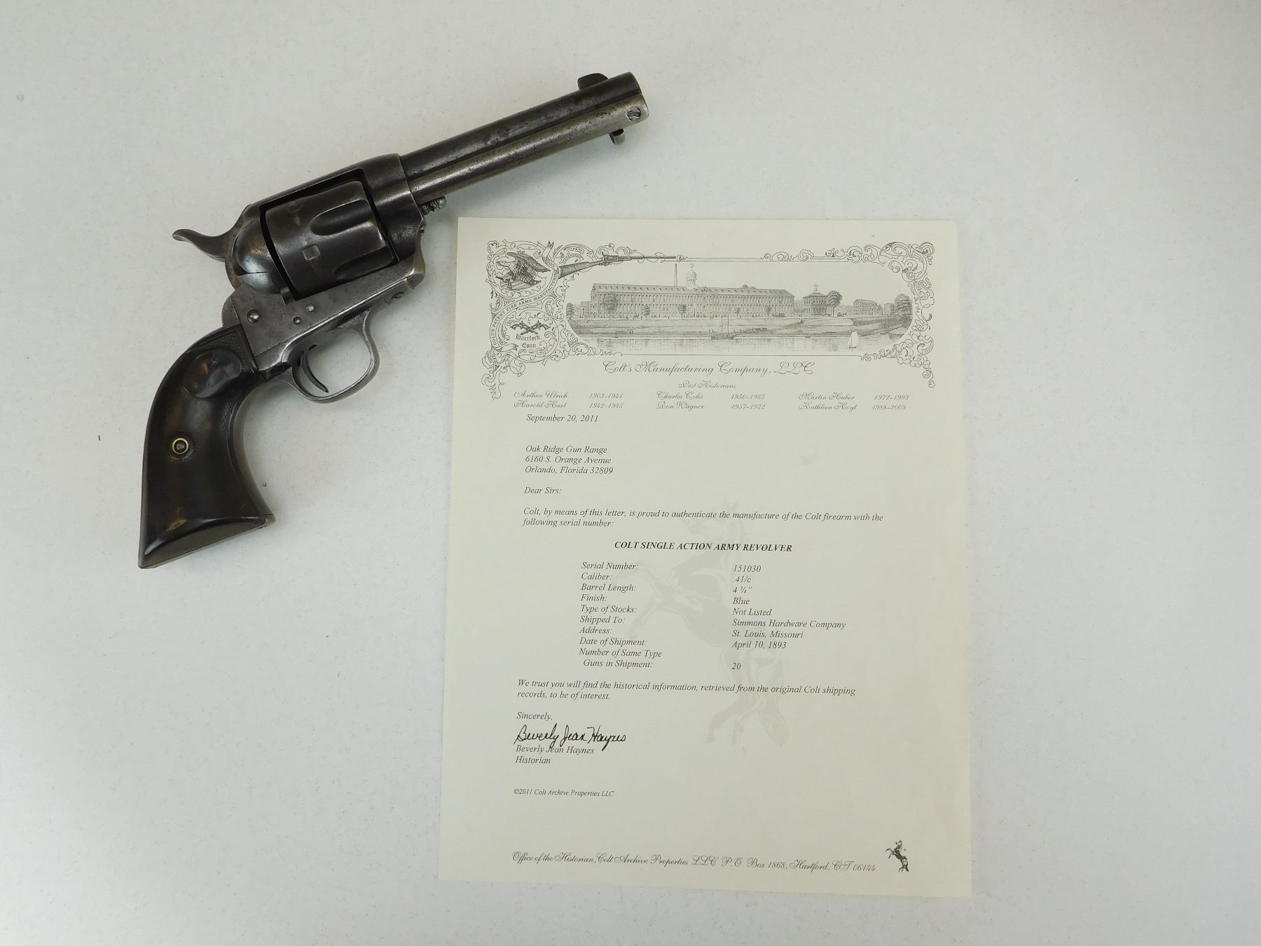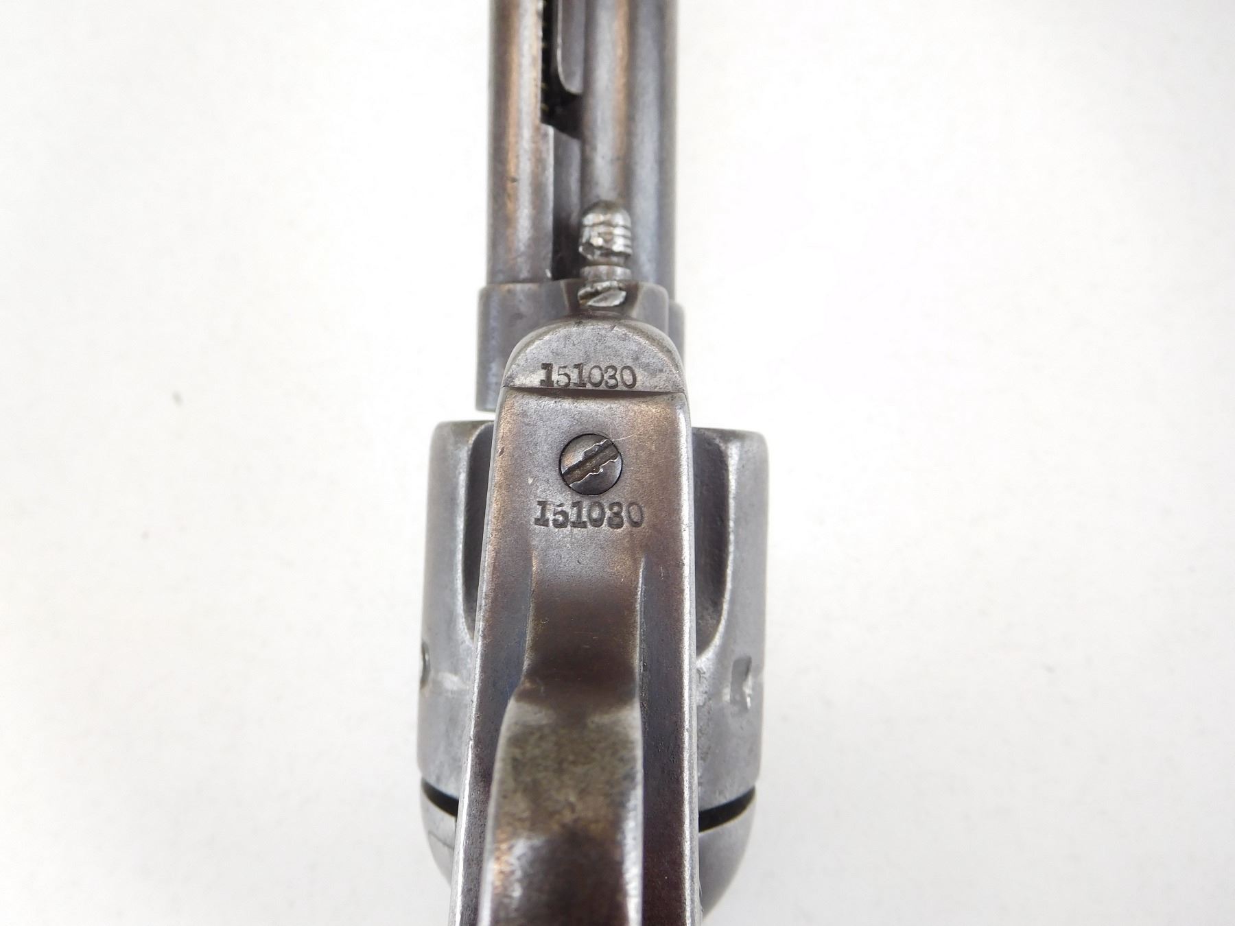 COMES WITH LETTER, MANUFACTURED IN 1893, ALL MATCHING NUMBERS, BLADE FRONT AND V NOTCH REAR, HOLDS COCK, HARD RUBBER GRIPS ARE WELL WORN, GOOD BORE , ACTION: REVOLVER , BARREL LENGTH: 121MM, SER. # 151080, CONDITION: ANTIQUE 6/10 , CLASS: CANADIAN ANTIQUE CLASS