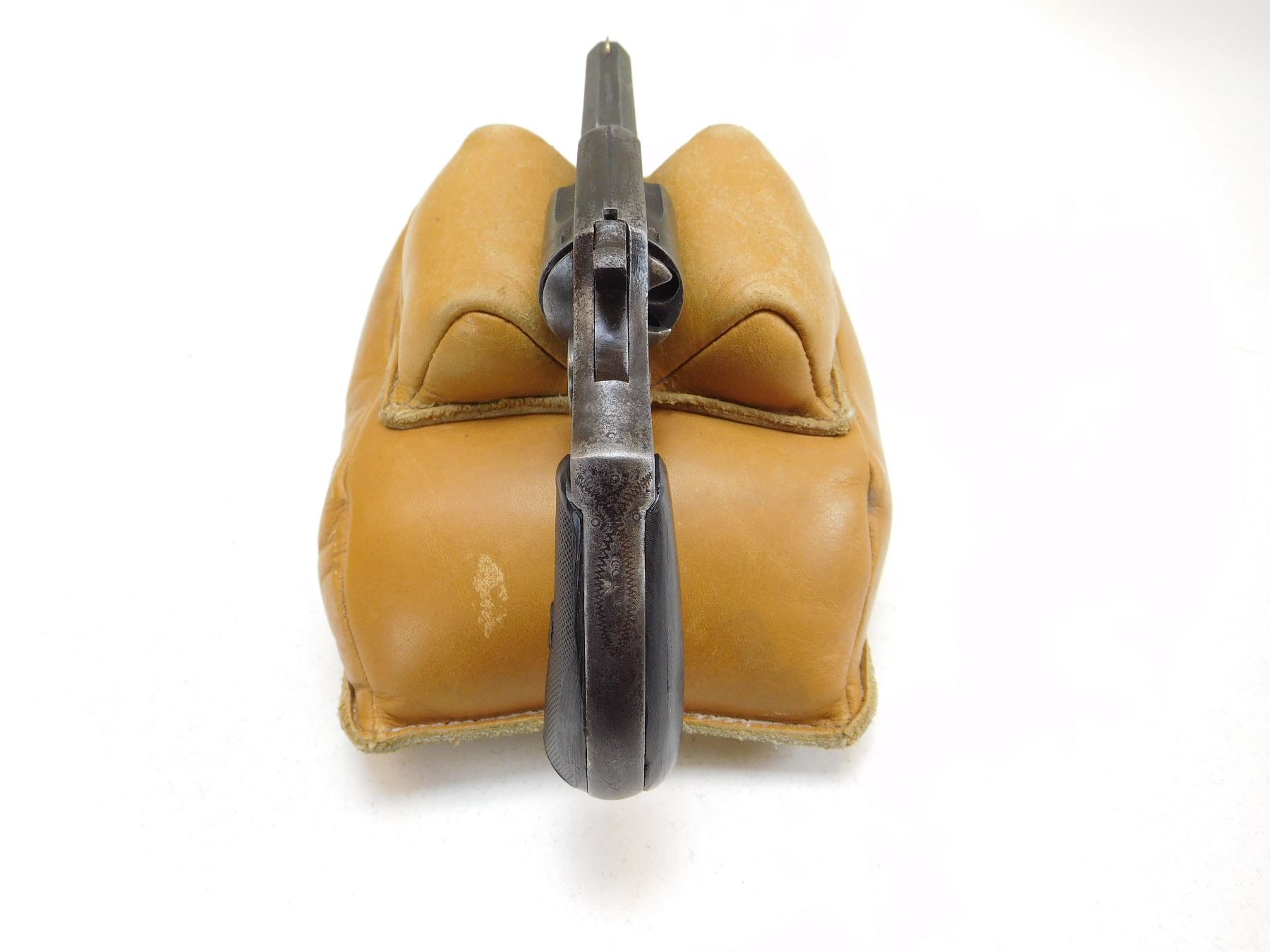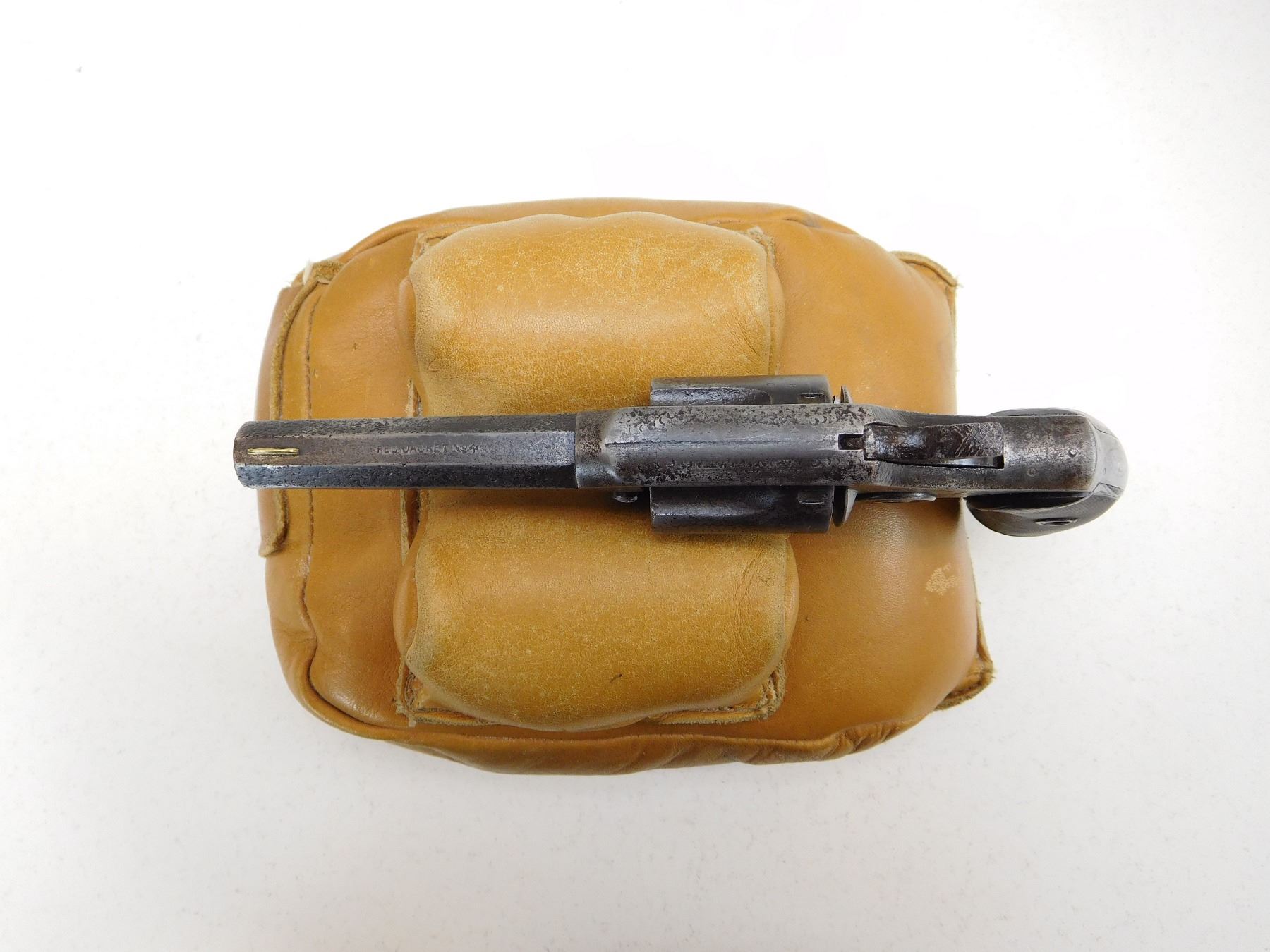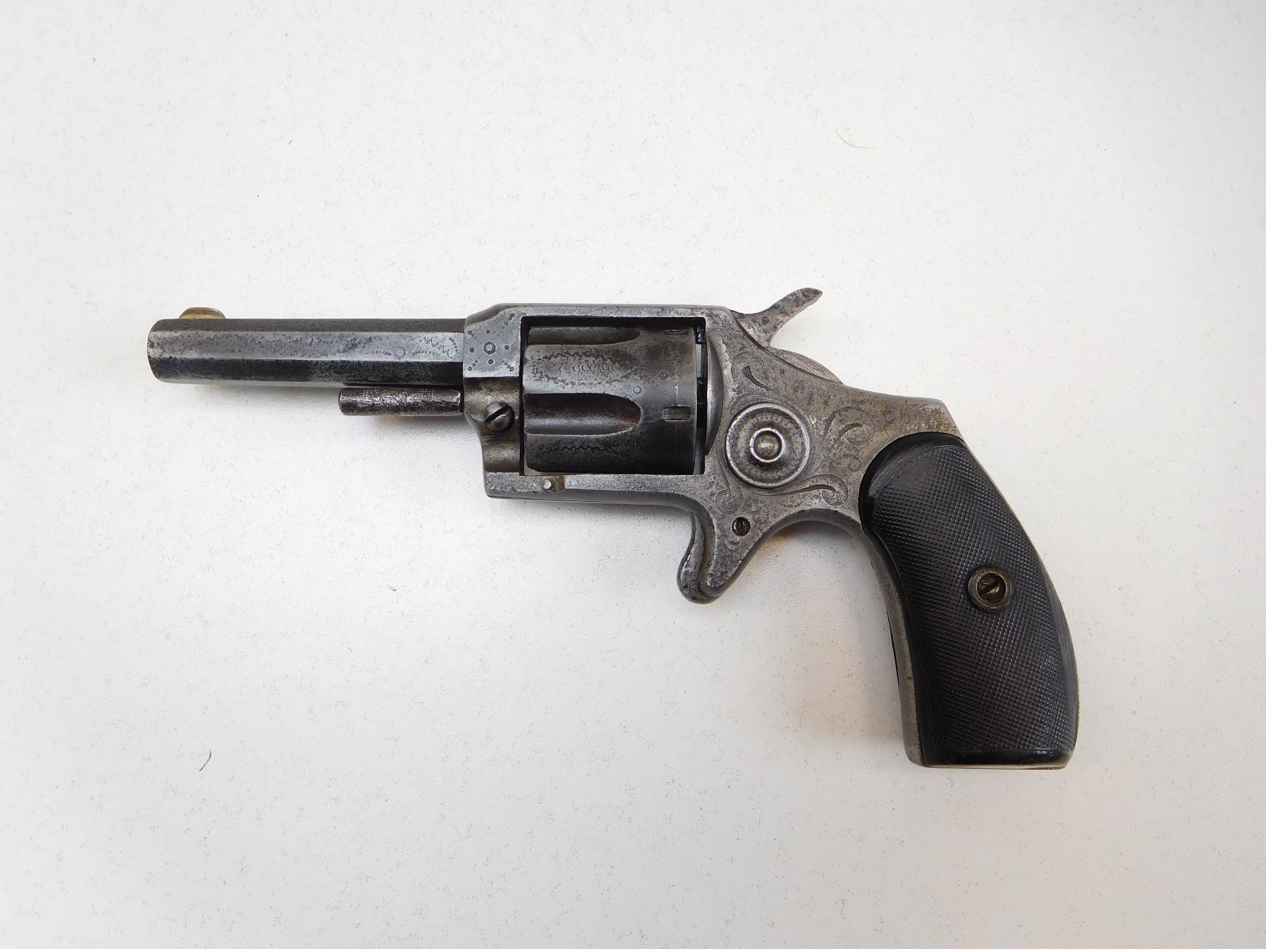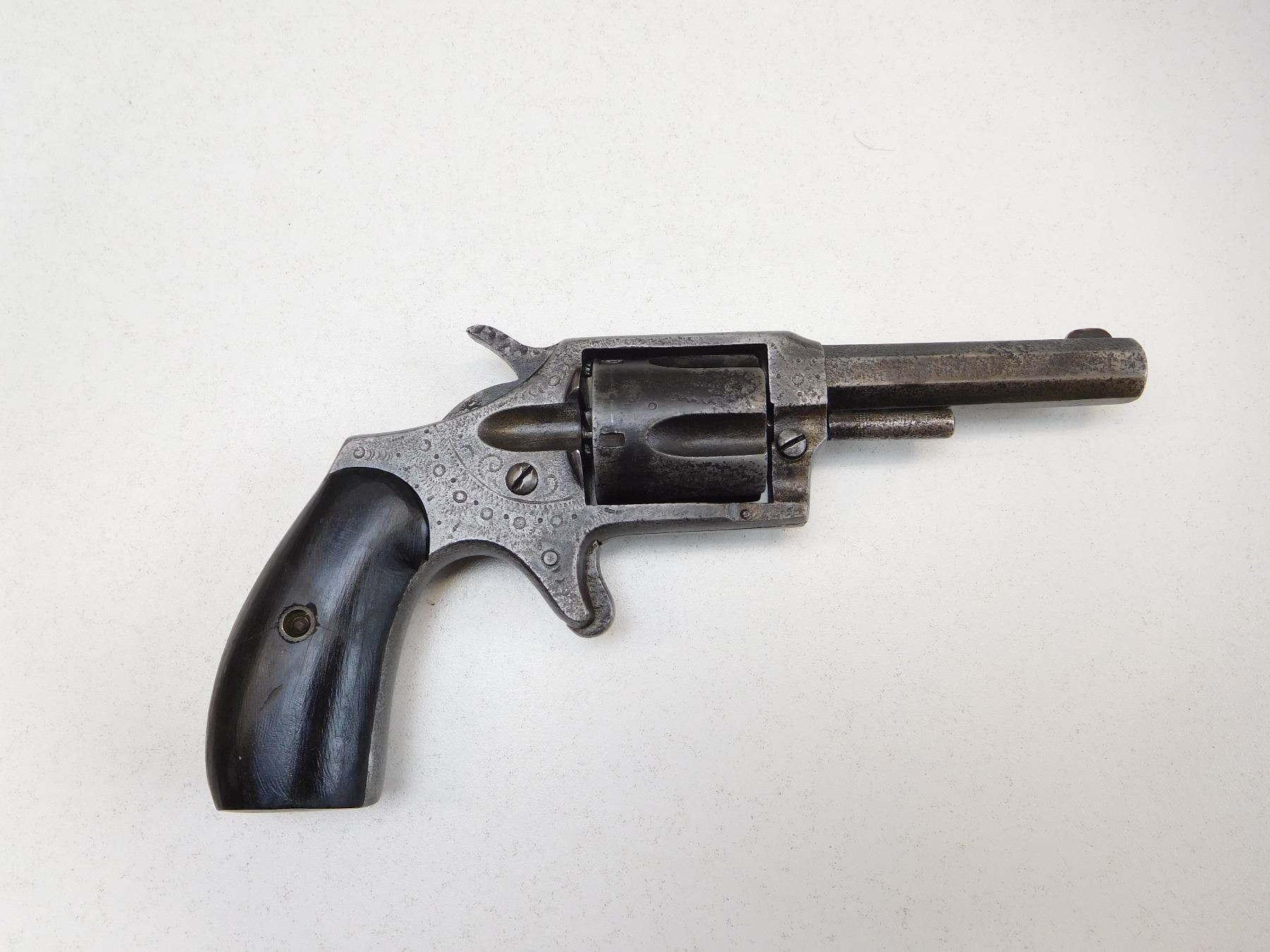 BORE HAS MINOR PITTING WITH LOTS OF RIFLING VISIBLE, 5 SHOT CAPACITY, OCTAGONAL BARREL, MISMATCHED GRIPS WOOD AND RUBBER, NOTCH AND BLADE SIGHT, COCKS HOLDS AND FIRES, GREY PATINA , ACTION: REVOLVER , BARREL LENGTH: 70MM , , , CONDITION: ANTIQUE 6/10 , CLASS: CANADIAN ANTIQUE CLASS