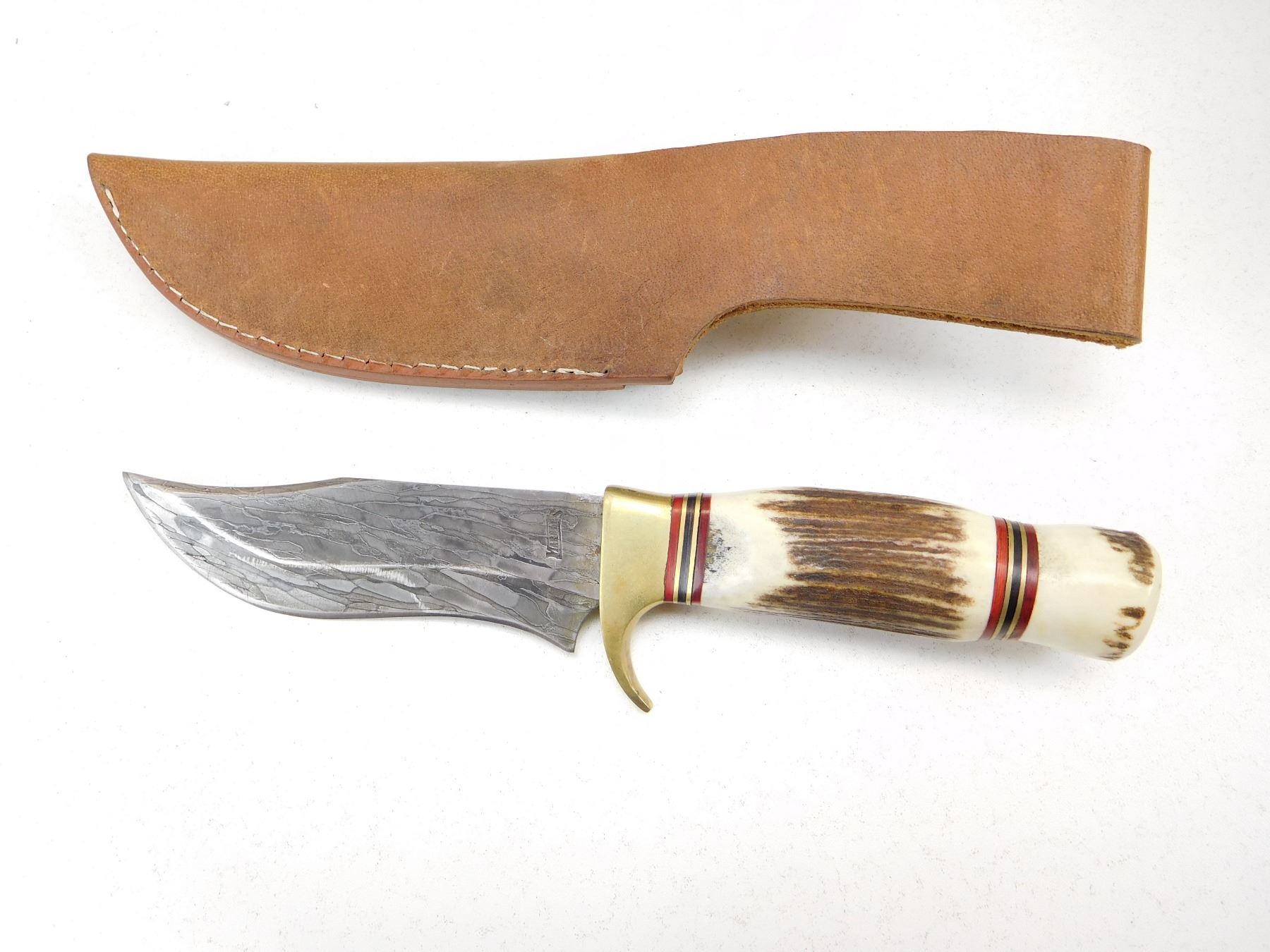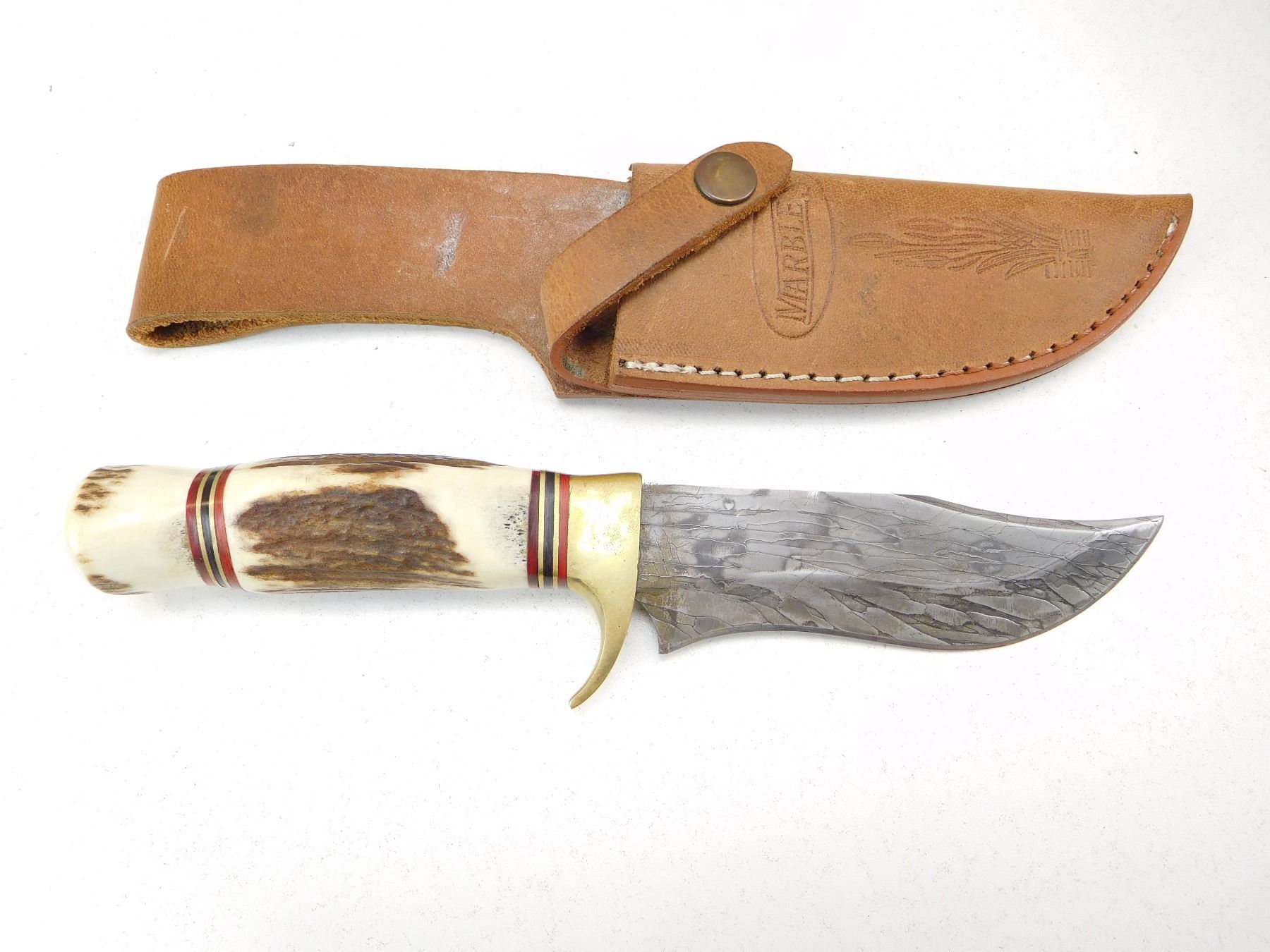 Lot 927 MARBLES STAG HANDLE HUNTING KNIFE DAMASCUS BLADE