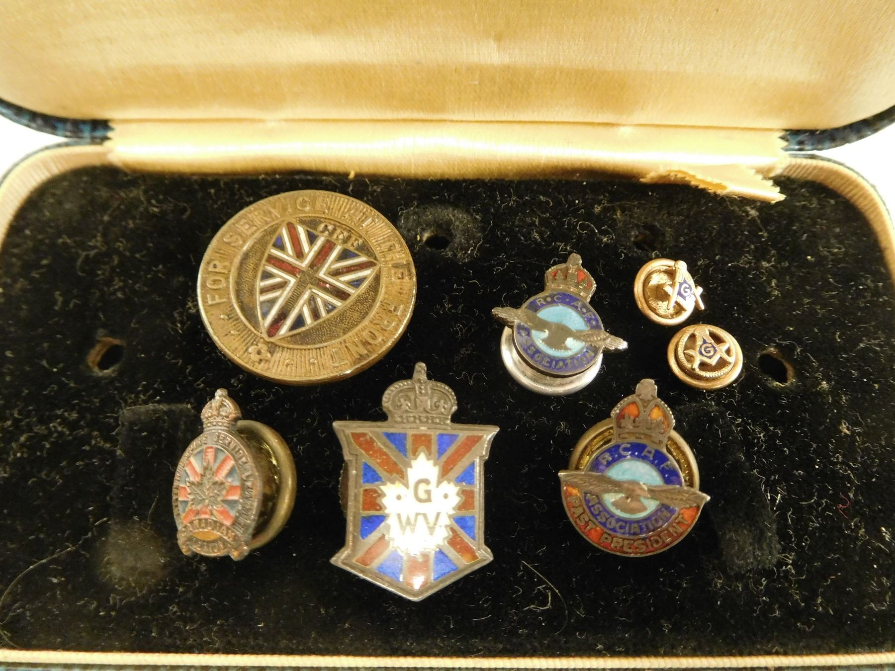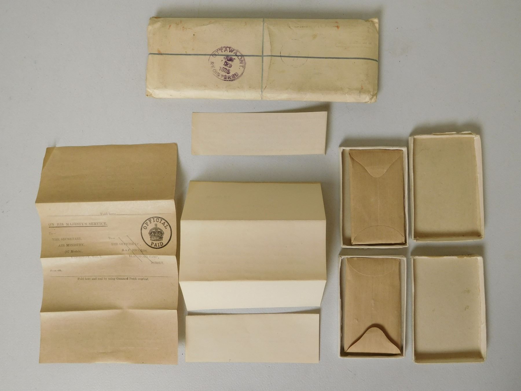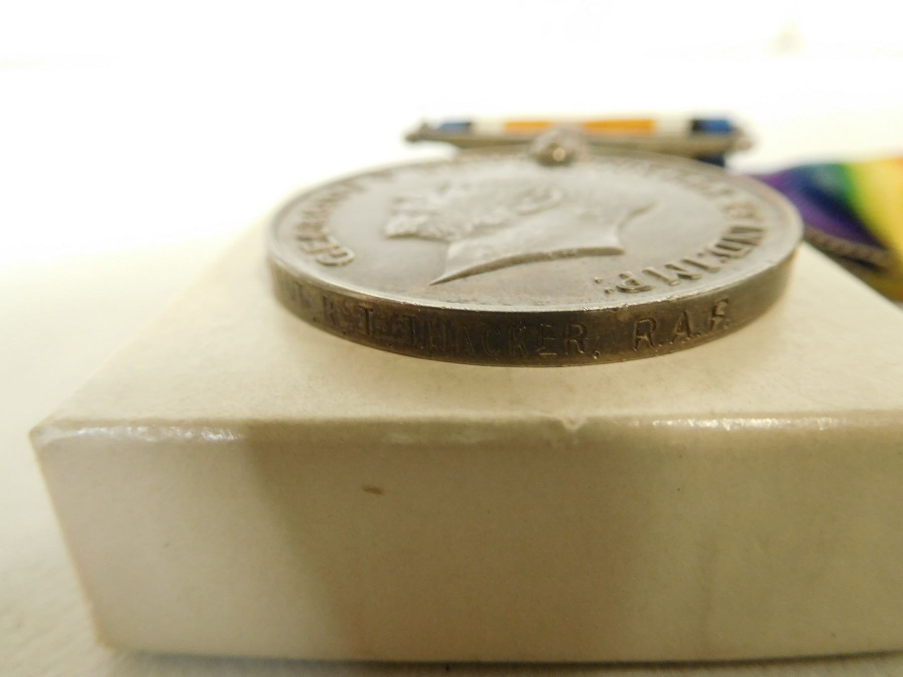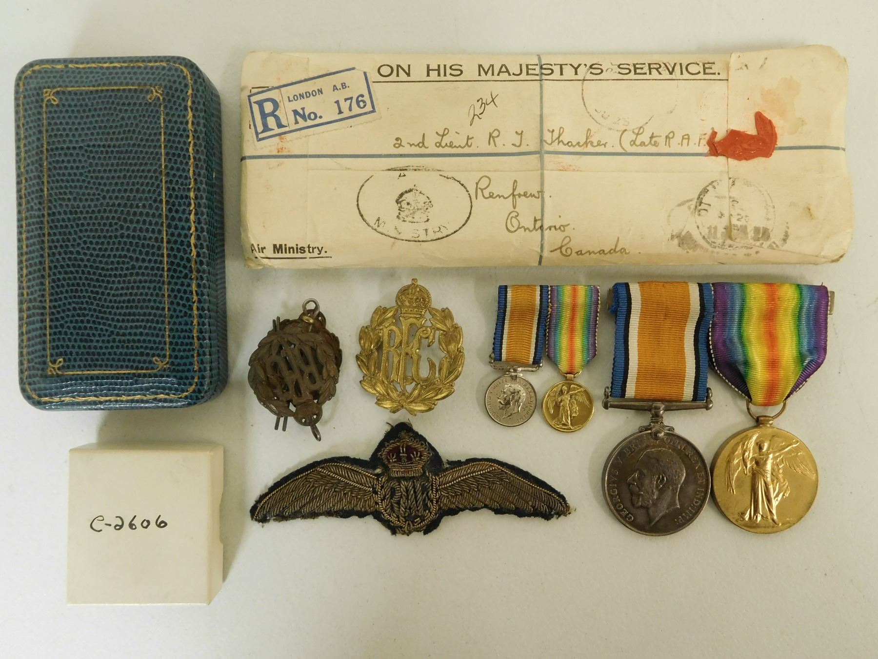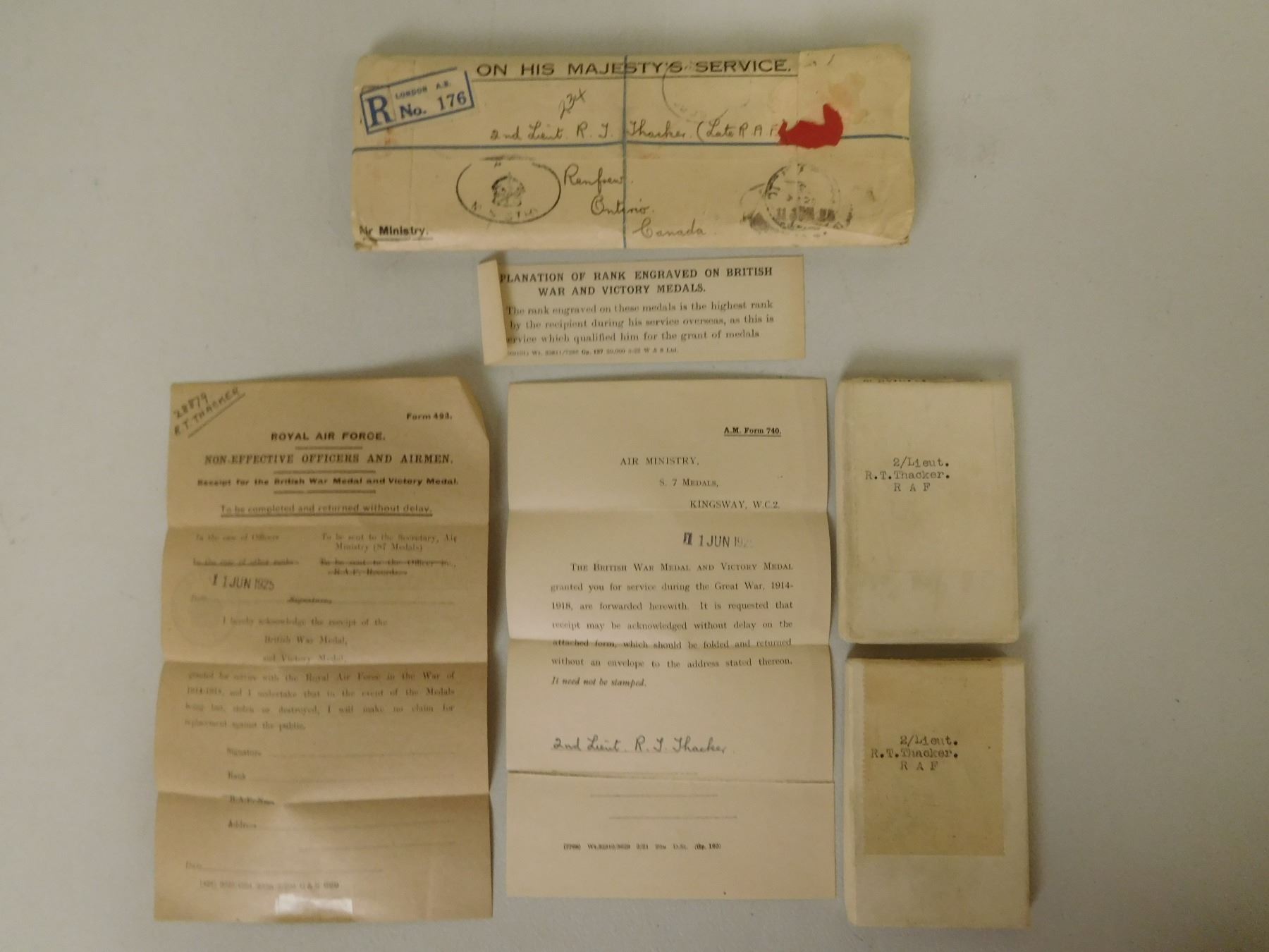 EVELOPE OF MEDAL AWARDS, CAP & COLLAR BADGES, WWI VICTORY & WAR MEDAL ENGRAVED 2/LIEUT. R. T. THACKER. RAF WITH RIBBONS ON BAR, MATCHING MINITURE MEDAL BAR, & ROYAL FLYING CORPS BADGE WITH GOLD THREAD