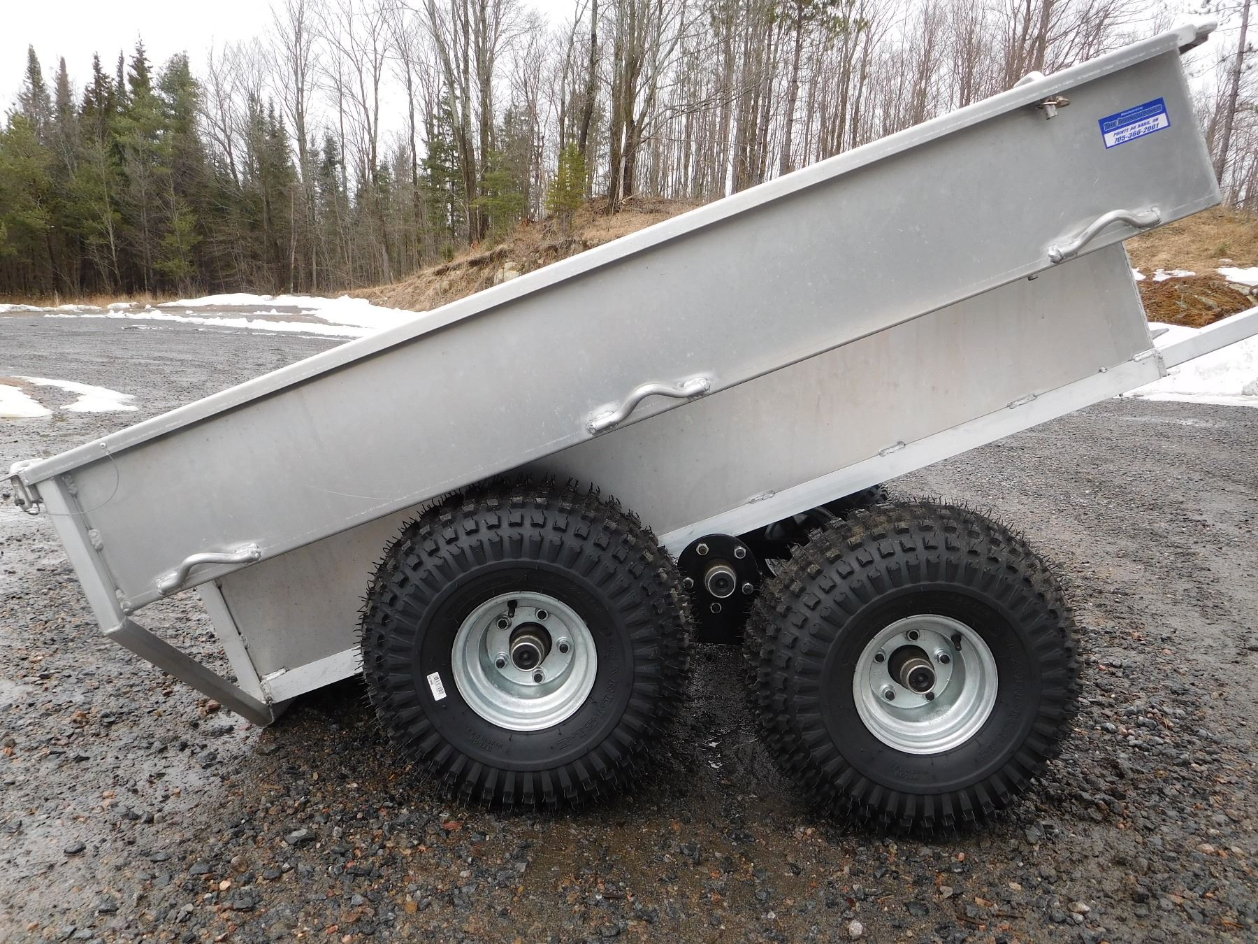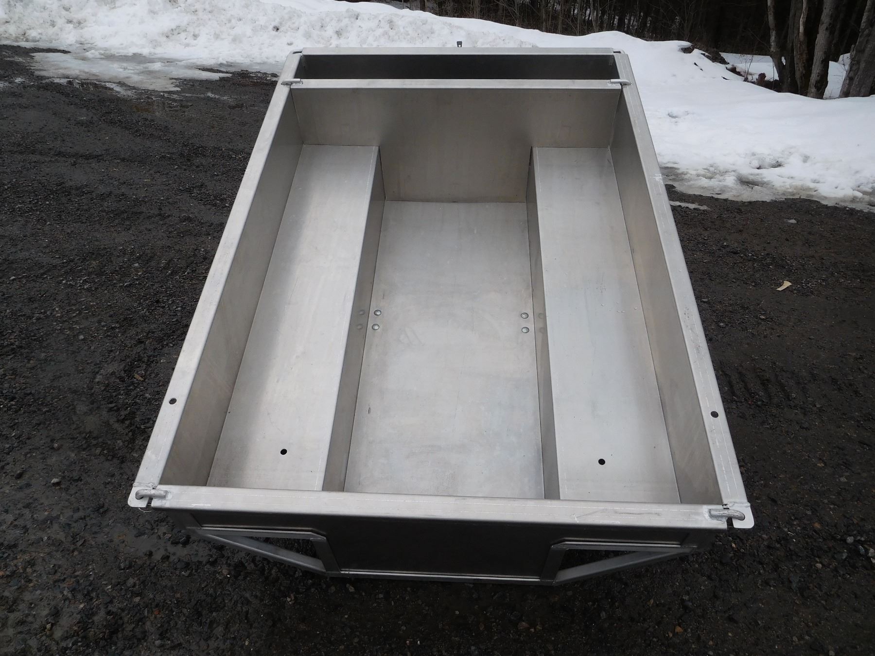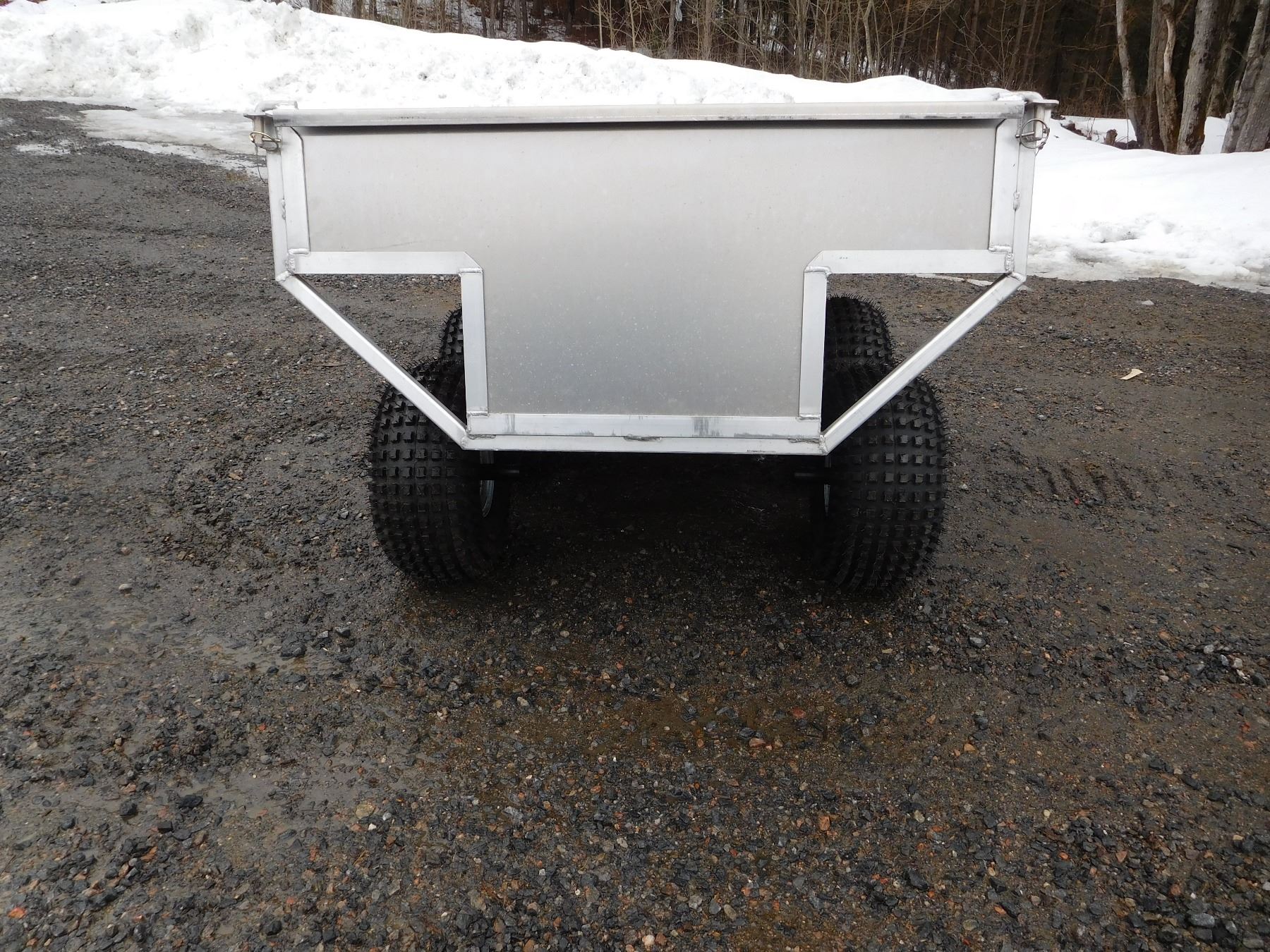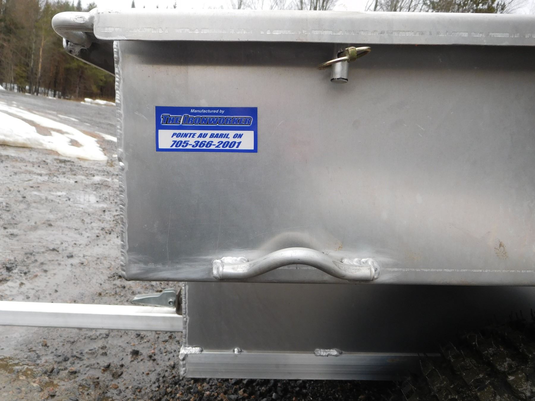 ALL ALUMINIUM CONSTRUCTION, TANDEM WALKING BEAM SUSPENSION, INTERIOR DIMENSIONS: 6FT. X 4 FT., TRAILER HAS A REMOVABLE BULKHEAD FOR STORAGE, REMOVABLE TAILGATE AND TILT FEATURE FOR DUMPING, VALUE NEW OVER $3000.00, MFG. BY IRONWORKER. NO SHIPPING