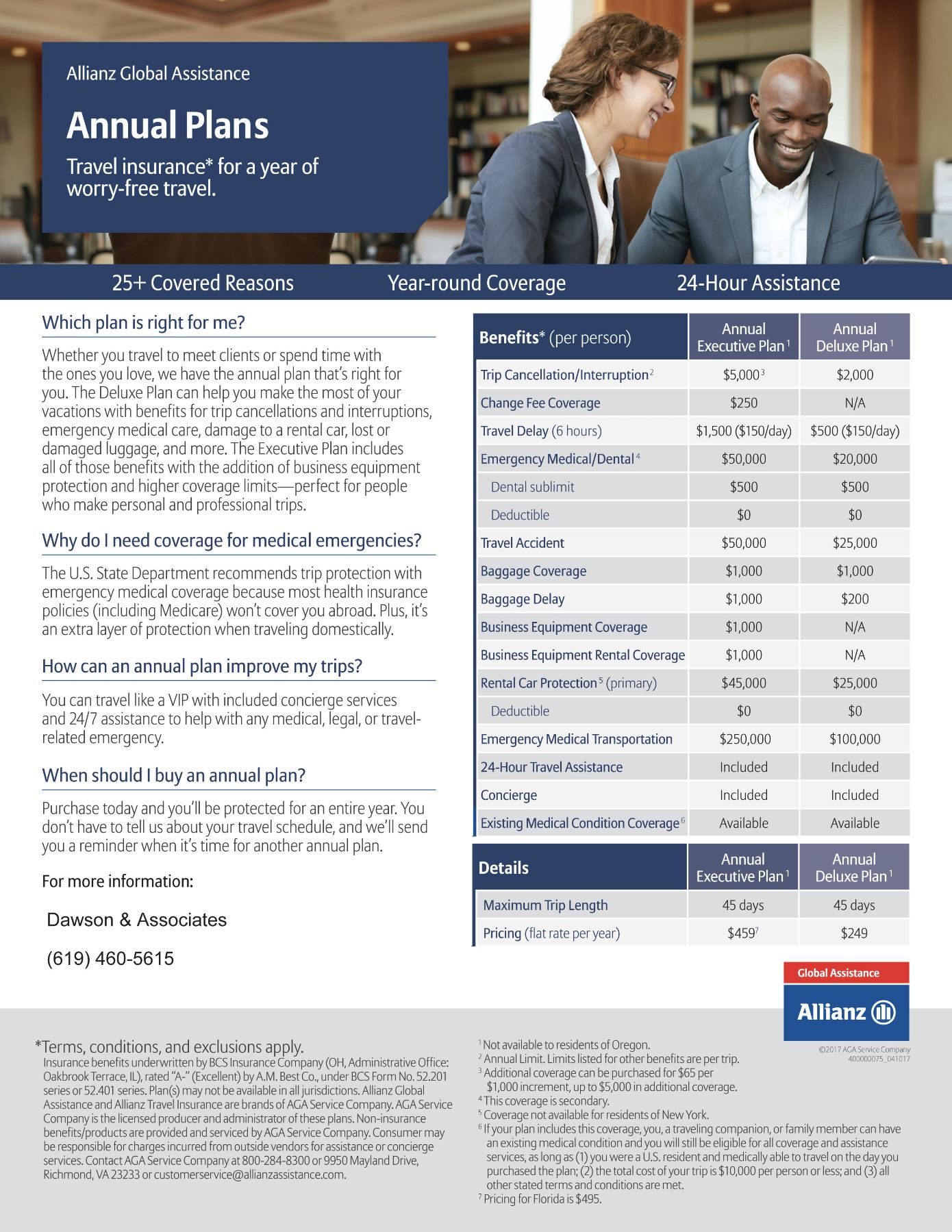 Also includes Global Travel Insurance for trip cancellations and interruptions, emergency medical care, damage to a rental car, lost or damaged luggage, and more. Plan includes a maximum of $10,000.00 Trip Cancellation insurance on an “Annual Plan”, MedEvac Helicopter rescue for $250,000, Pre-Existing Medical Condition, $50,000 Worldwide Medical, Baggage Loss, Ages 18-100 included etc. (see Dawson website for more details). Must be started within 90 days and good for a year from start date. Additional plans can be added at cost. http://www.safariglobaltravel.com