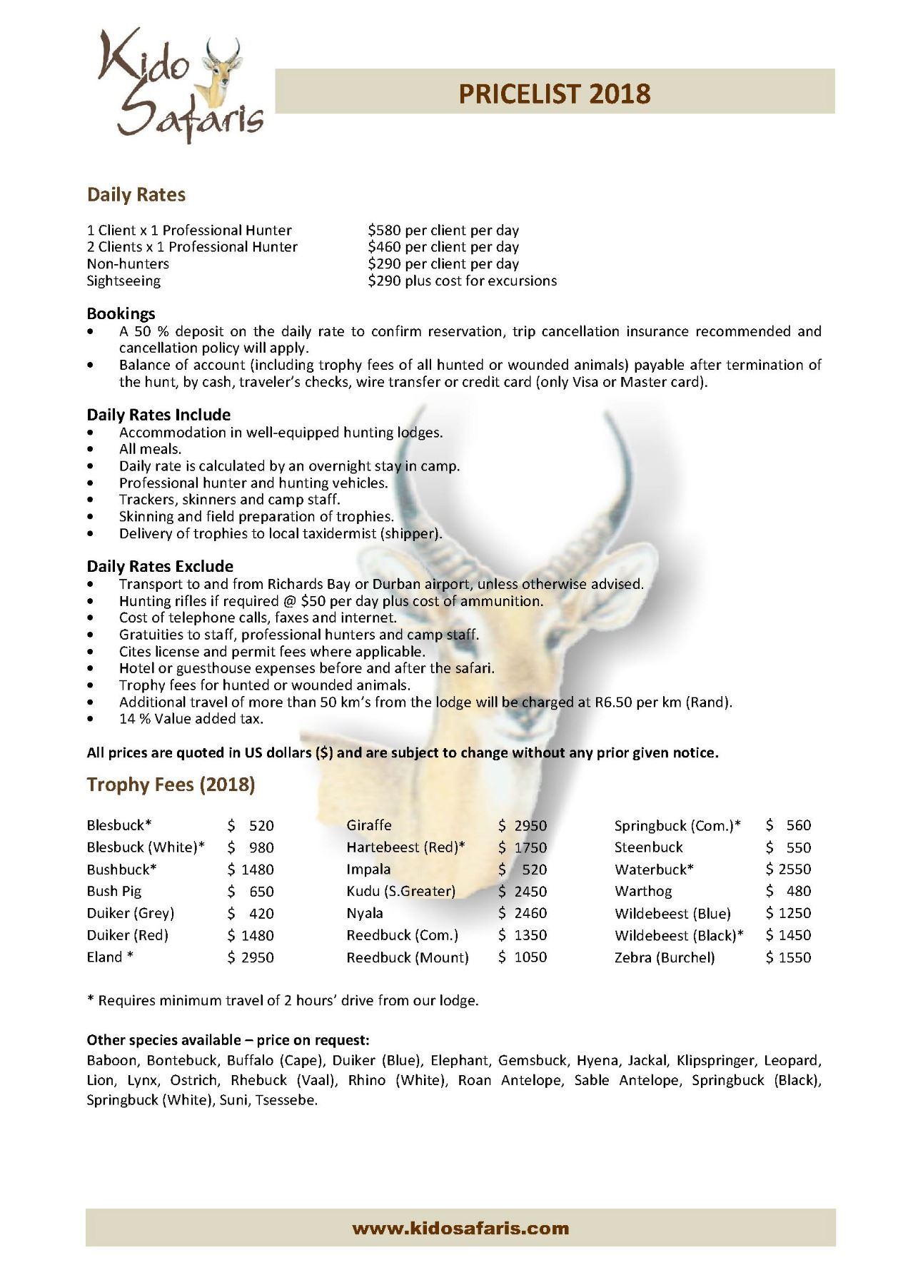 Excludes: Trophy fees as on the attached price list. The cost price of an overnight stay at a location other than our lodge, if required.