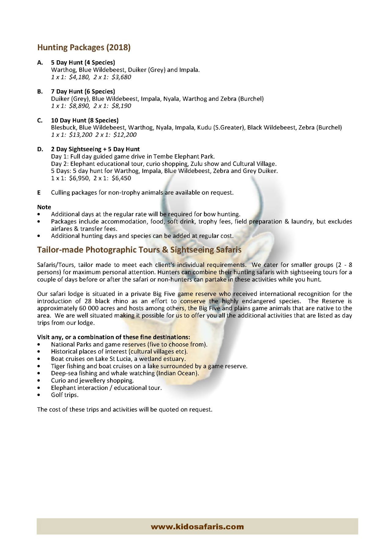 Includes: Professional Hunter, vehicle, tracker, skinning and field prep of trophies.