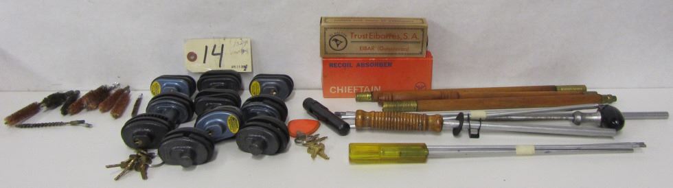 4 DIFFERENT CLEANING RODS, SKS CLEANING KIT, 9 BRUSHES, 10 TRIGGER LOCKS WITH KEYS, 2 RECOIL PADS, 2 UNKOWN 22 CAL MAGS, SET OF SIGHTS,