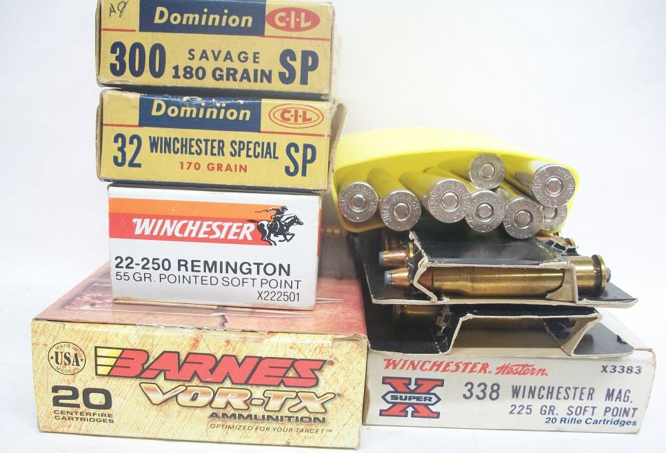 20 RNDS BARNES 7MM REM MAG, 20 RNDS WINCHESTER 22-250 REM, 19 RNDS WINCHESTER 307 WIN, 20 RNDS DOMINION 32 WIN IN VINTAGE BOX, 15 RNDS DOMINION 300 SAVAGE SP IN VINTAGE BOX, 1 RND WINCHESTER 338 WIN MAG AND 19