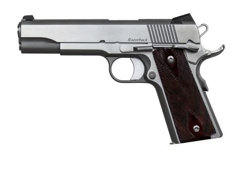 Chambered in the powerful 10mm cartridge, the Razorback is a very versatile 1911 package suitable for defensive use, target shooting and handgun hunting of medium-sized game up to deer or wild boar.