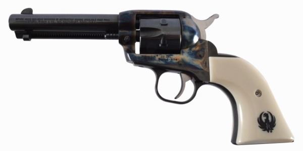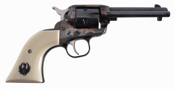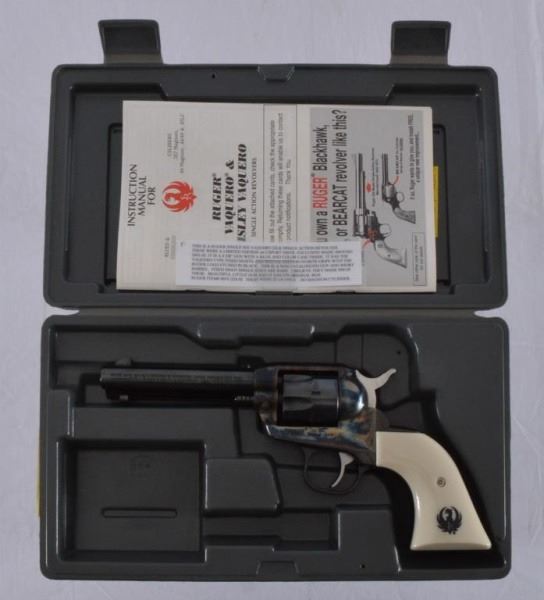 Limited Ed Acusport distributor made circa 2001-02. It is a 4-5/8" gun with a blue and color case finish. Vaquero type fixed sights and special edition Ivorite grips with Ruger logo etched in black. Non-catalogued gun and short barrel. With original box and paperwork. Serial #268-23395.