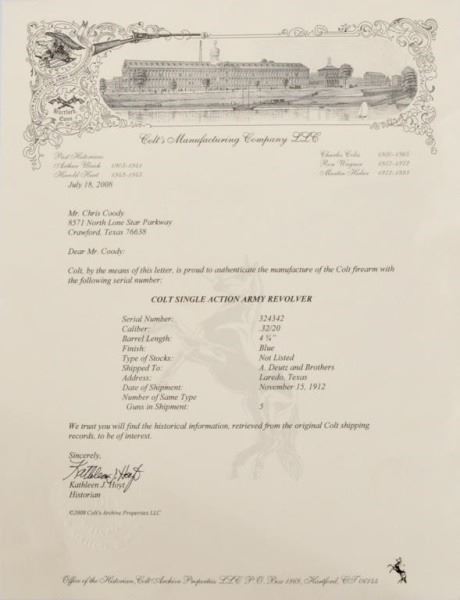 * Shipped to Laredo, TX 1912 during the Mexican Revolution. Silver on grips with Mexican coin & eagle. Comes with factory letter. S/N 324342.