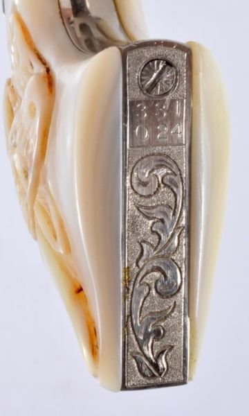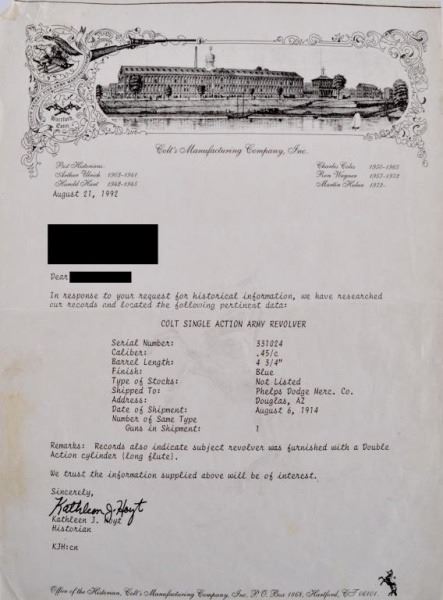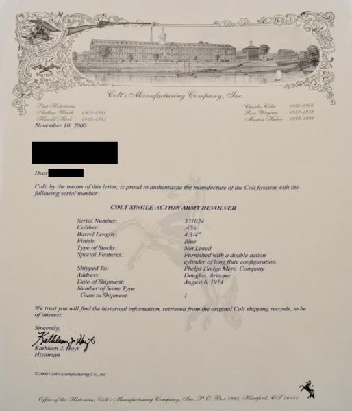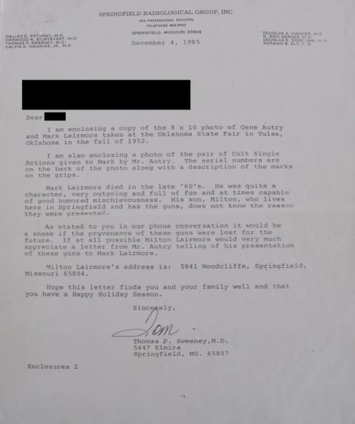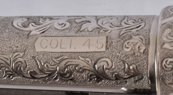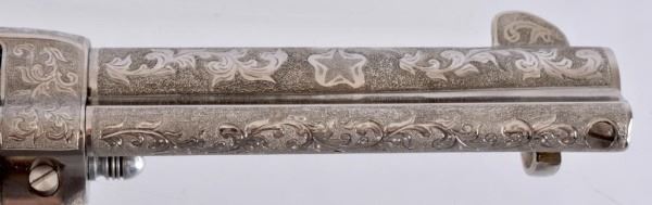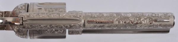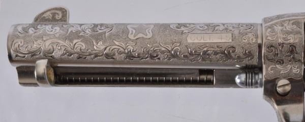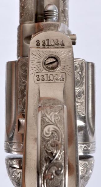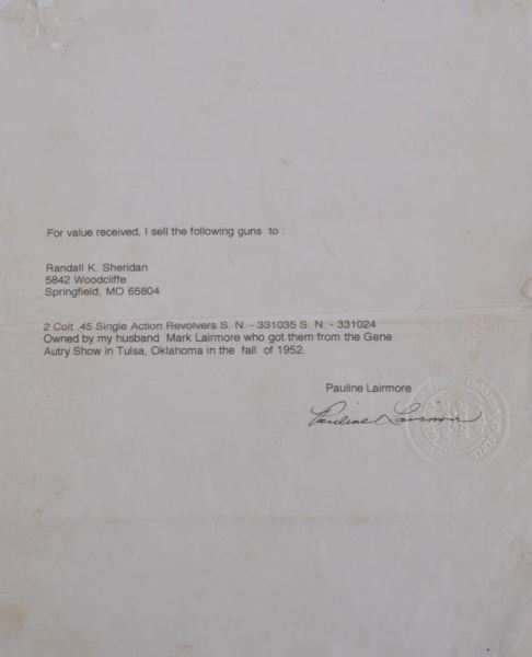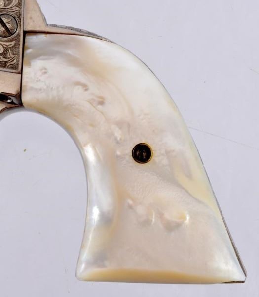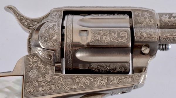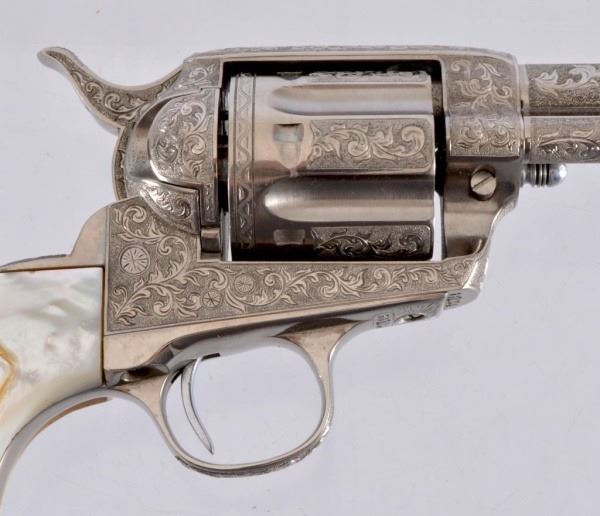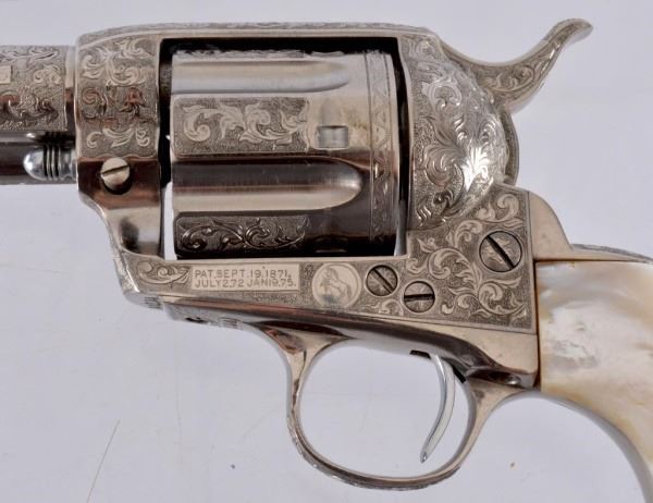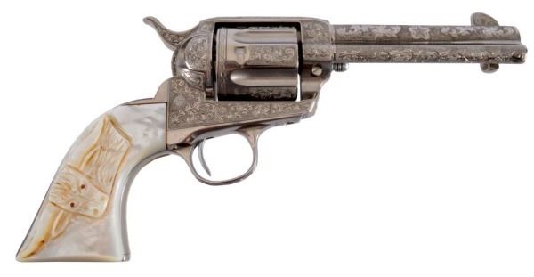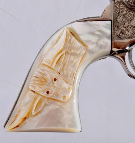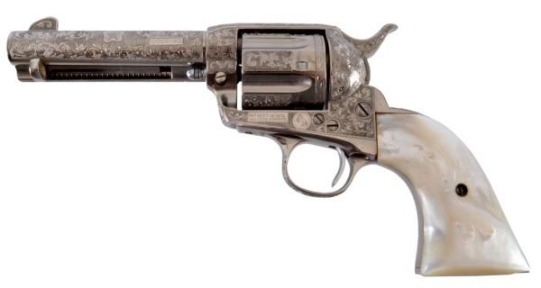 Fully Engraved. With Mother of Pearl steer head grips. Comes with letter from the wife of Mark Lairmore, who received the gun from Gene Autry in Tulsa, OK in 1952. Gene Autry had a ranch in South Arizona near where the gun was shipped. Very rare to see a gun shipped to Douglas, Arizona. Also comes with factory letter. S/N 331024.