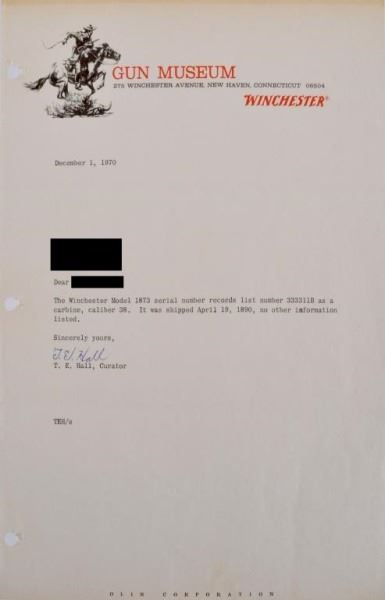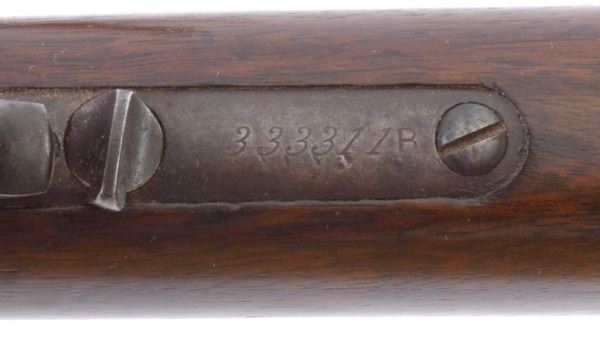 Still traces of original finish on the receiver. Shipped April 19, 1890. Comes with Factory letter. S/N 333311B