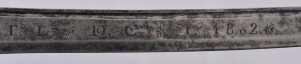 Spanish light Cavalry sabre used in the Spanish colonies/ Mexico and dates as marked 1802 and King Carlos IV. Also marked “TS.LS*D*CA*T 1802 (Tropas Ligeras De Caballeria – Toledo). Reverse marked “R(crowned0CS IV”. The hilt is that of the model 1815.