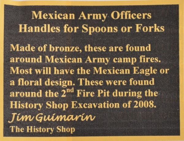 Made of bronze, these were found around Mexican Army camp fire. Most will have the Mexican Eagle or floral design. These were found around the 2nd fire pit during the history shop excavation of 2008. With provenance letter detailing the excavation of the relic from a well documented dig on the North East section of the Alamo battleground. During the battle, the third column of Santa Anna's Army attempted to breach the Northeast section, along with Mexican cavalry. They failed to breach the wall as the Texas defenders repulsed both waves. This section of the battlefield would have seen heavy cannon & musket fire, and likely heavy casualties on the Mexican side in this area of the battlefield.