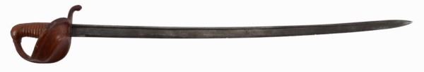 Leather wrapped Mexican mounted officer’s sword which dates from the late 19th to early 20th century. The blade is slightly curved measuring 313/4 inches in length. The multi-branch guard is fully leather wrapped. All stitching remains intact. Overall 37-¼ inches. (Listed page 67 in book “MEXICAN SWORDS” by Jan E. Culbertson).