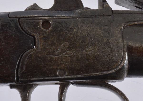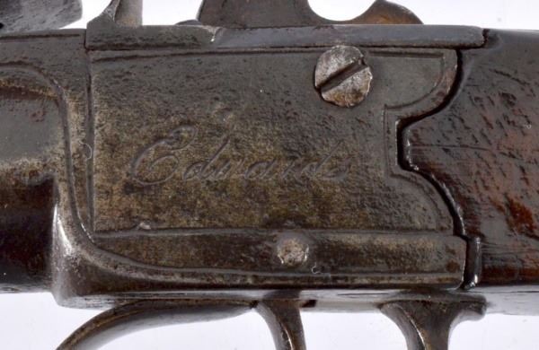 Marked London on right side of lock plate, Edwards on left side of lock. Good condition. Pocket pistol with removable barrel and safety catch back of hammer.