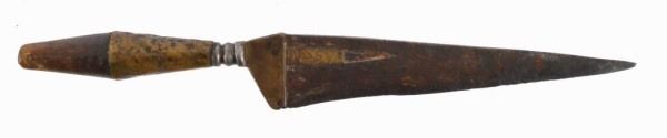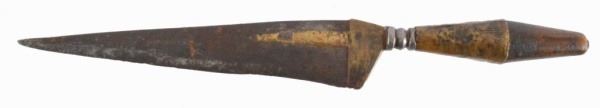 9" blade. Fair condition. Wood grip 1/2 brass covered, usable as a plug bayonet, brass before Ricasso area with 2-1/2" brass inlayed on blade.