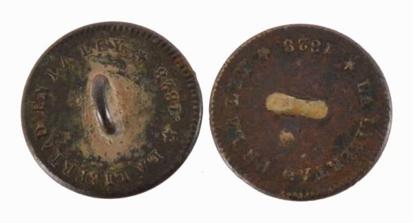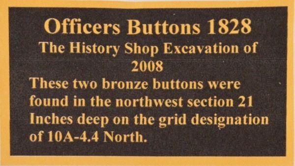 Officers Buttons 1828 From teh Battle of the Alamo. From The History Shop Excavation of 2008. These two bronze buttons were found in the northwest section, 21 inches deep on the grid designation of 10A-4.4 North.