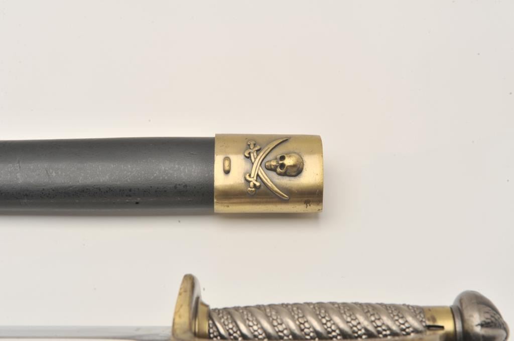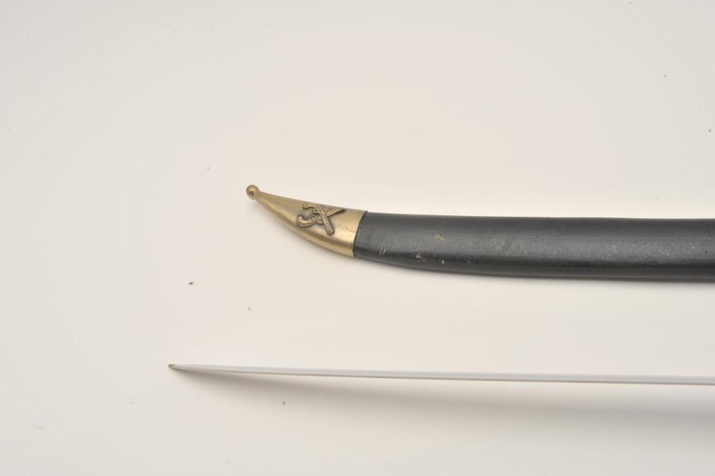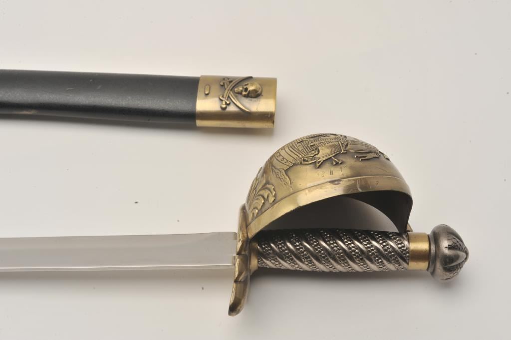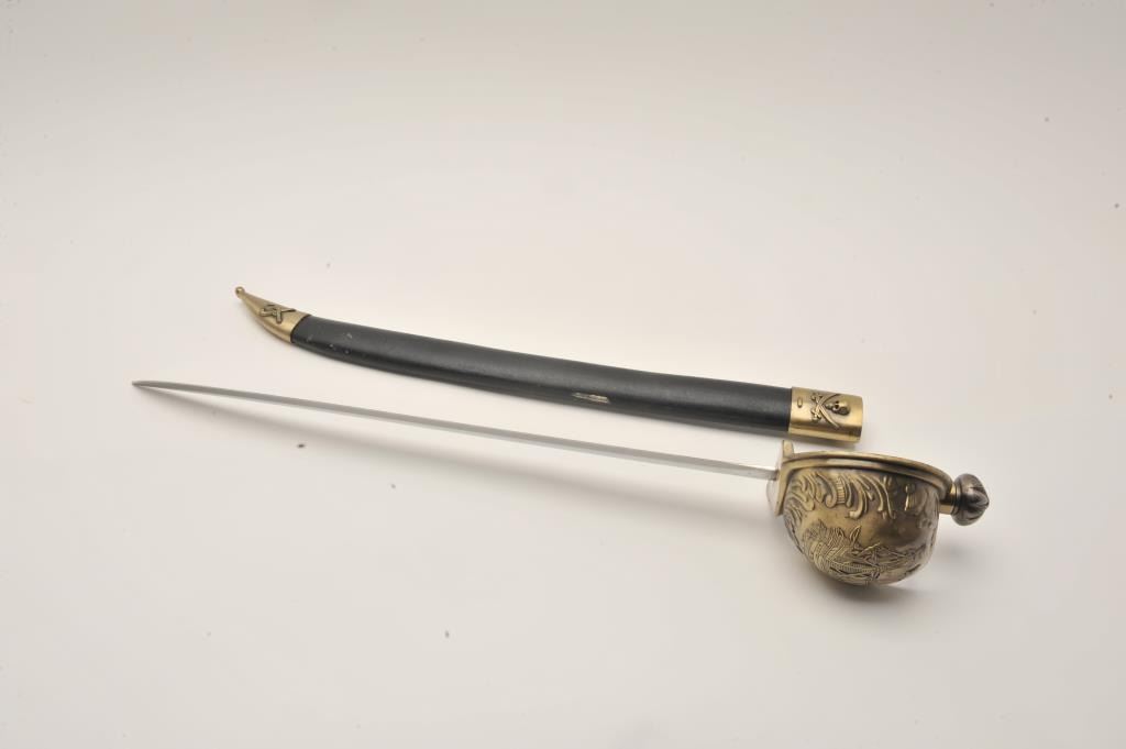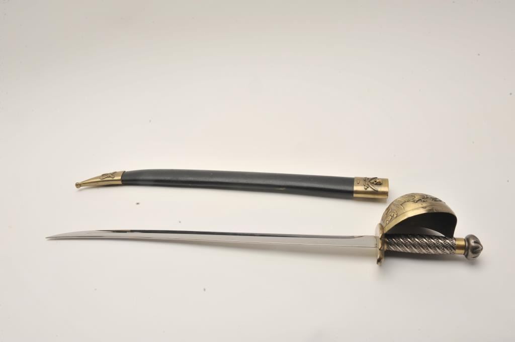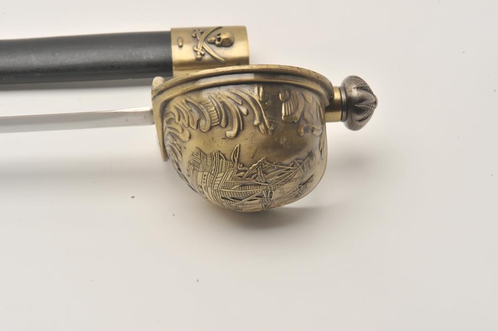 Replica pirate sword with brass handguard and scabbard. The sword is 28” in overall length with a 22” blade. The blade does not appear to have been sharpened. The brass handguard depicts a pirate ship and protects Lot Title the cast metal handle. The lot includes a wooden scabbard with brass ornamentation. Est.: $50-$100.