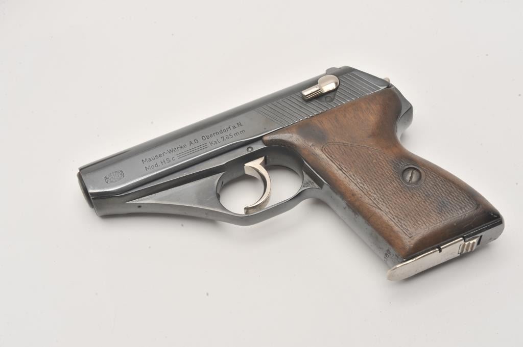 Mauser Hsc semi-automatic pistol, 7.65mm caliber, re-finished, checkered wood grips, nazi era in overall good condition as re-finished; with modern basket weave leather holster. (C&R/PPT). Est.: Lot Title $300-$600.