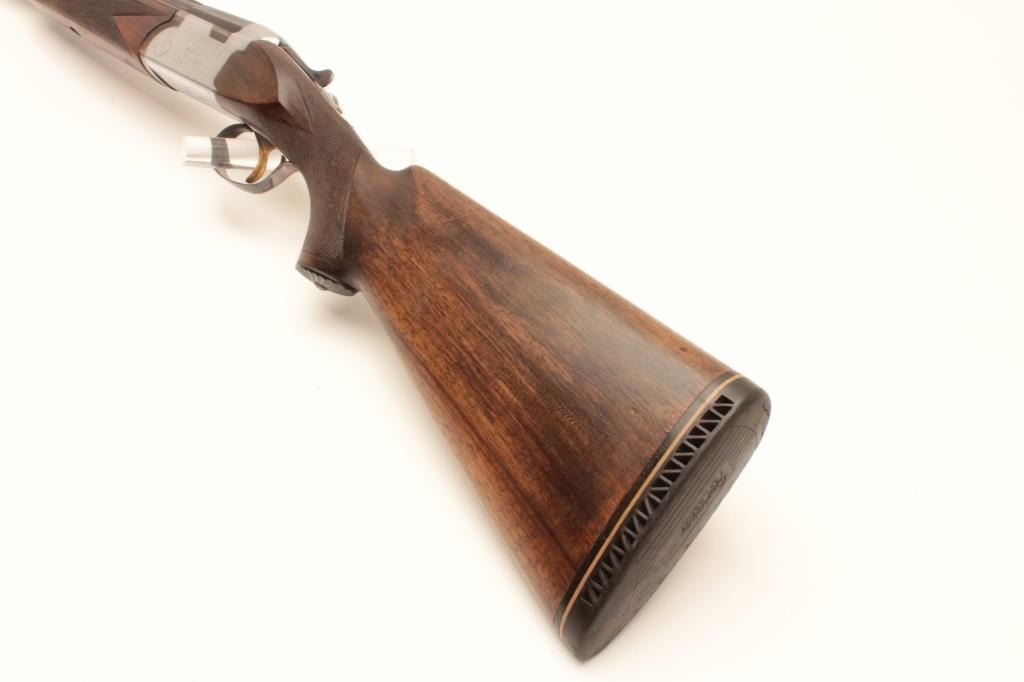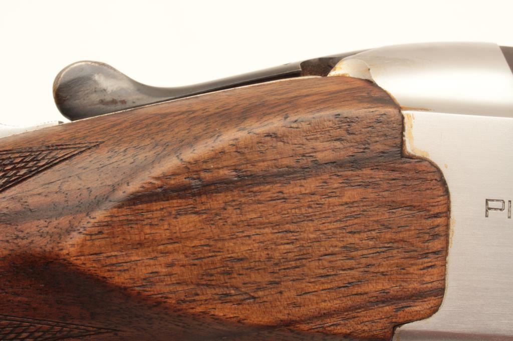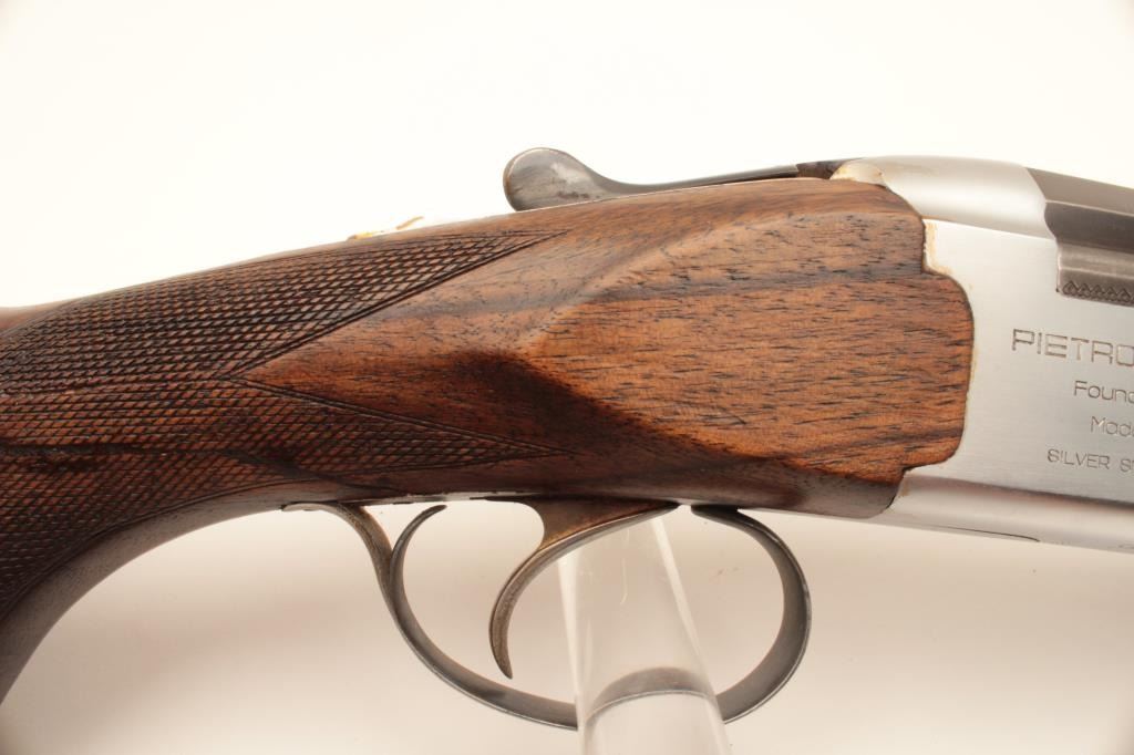 Pietro Beretta Silver Snipe O/U shotgun, 12 gauge, Serial #14620. The shotgun is in good overall condition with 27 ½” barrels with a steel bead front sight and full-length ventilated rib. The barrels retain the Lot Title majority of their blue finish with muzzle wear and a slight bulge evident in the bottom barrel at the muzzle. The receiver is matte finished stainless with a Social Security number and the initials MW, engraved into the Lot Title bottom of the action in electric pencil. The checkered wood stocks show moderate use with mars and compressions. The butt stock ends with a Pachmayr ventilated rubber pad providing a 14” LOP to the single trigger. Lot Title The bores are good, the action crisp and the markings are legible. Est.: $500-$1,000. (Modern).
