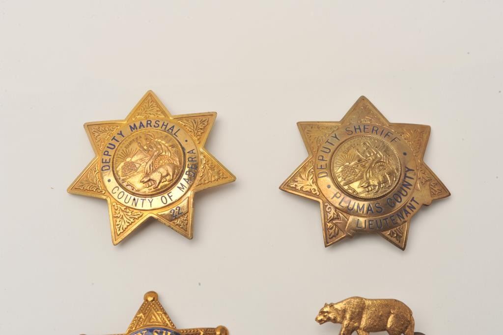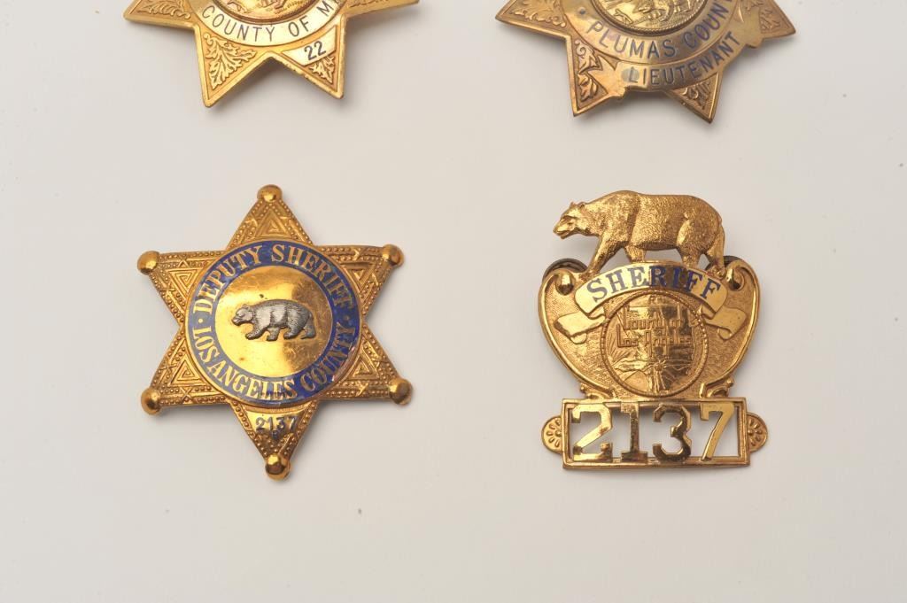 Lot of 4 badges including a Los Angeles County Deputy Sheriff 6 point star badge (2137R/hallmark Entenmann, Los Angeles), a 7 point star for Lieutenant, Plumas County, CA (hallmark Irvine & Jachens, S.F.), a 7 point Lot Title star for Deputy Marshal, Madera County, CA (22/hallmark Entenmann, Los Angeles) and an LA County, CA Sheriff cap badge (2137/hallmark Entenmann). Est.: $250-$500.