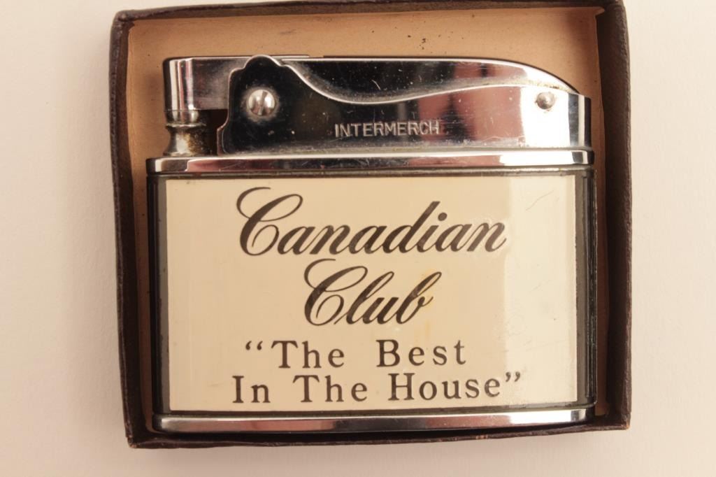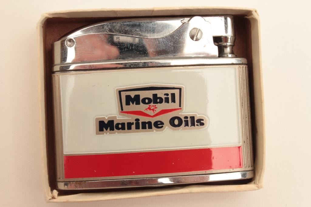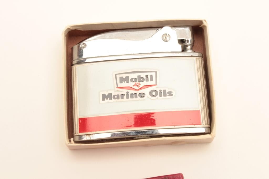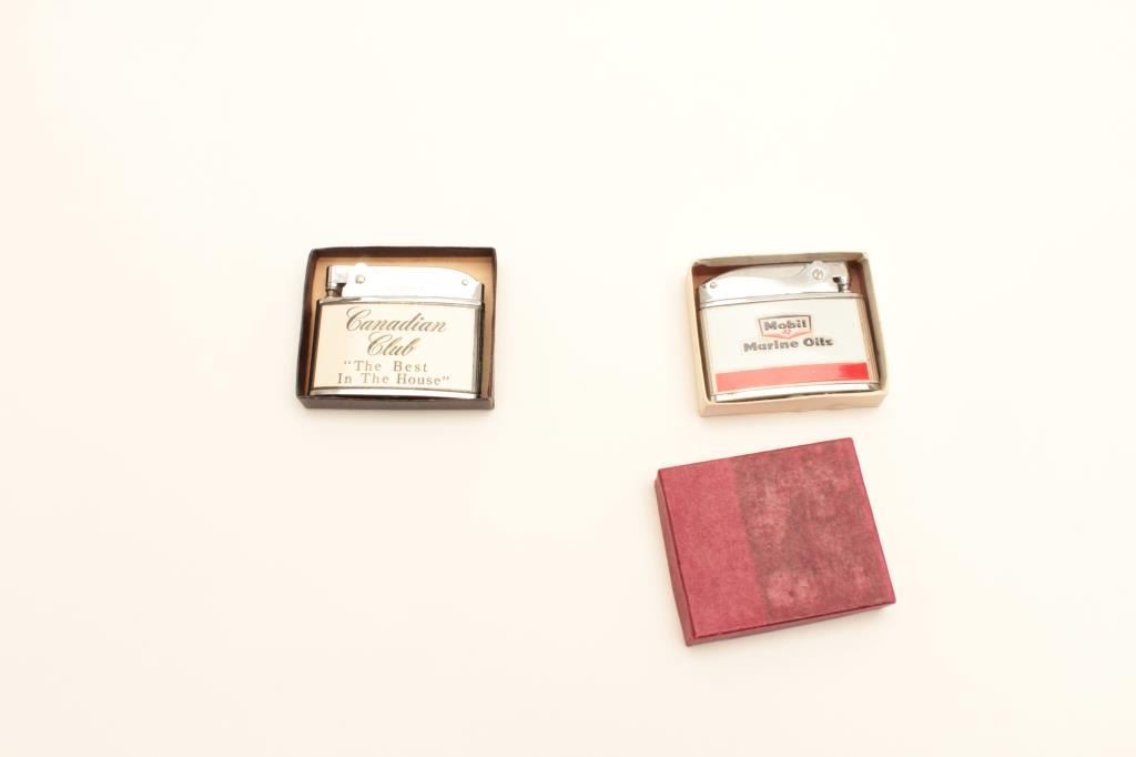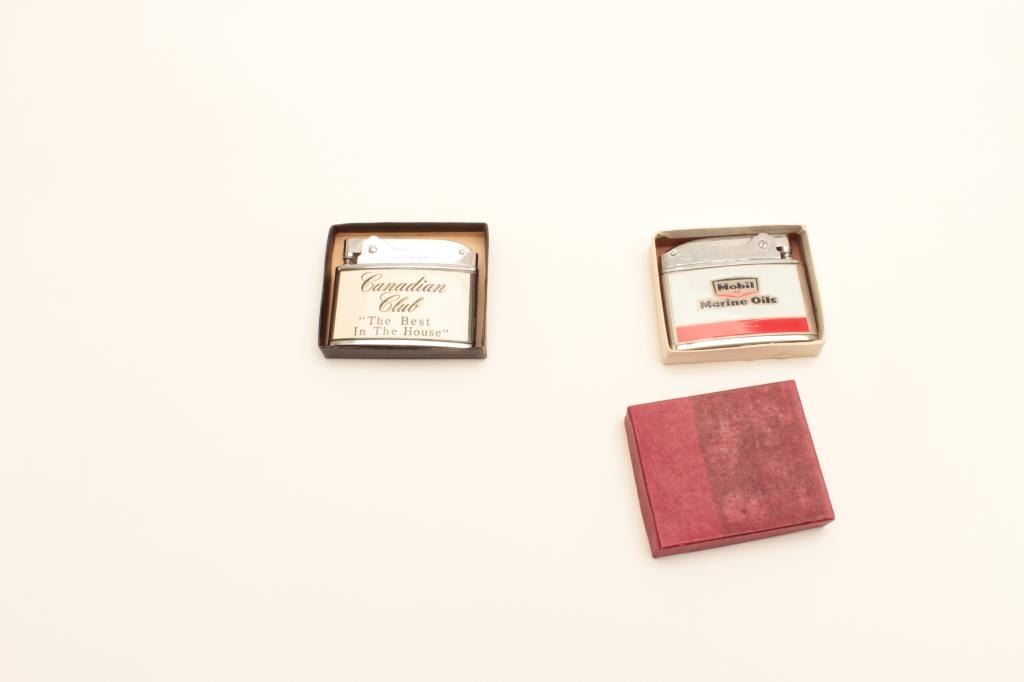 Two vintage advertising lighters in cardboard boxes, one is Mobil Marine Oils; the other is Canadian Club “The Best In The House”. Est.: $25-$50.