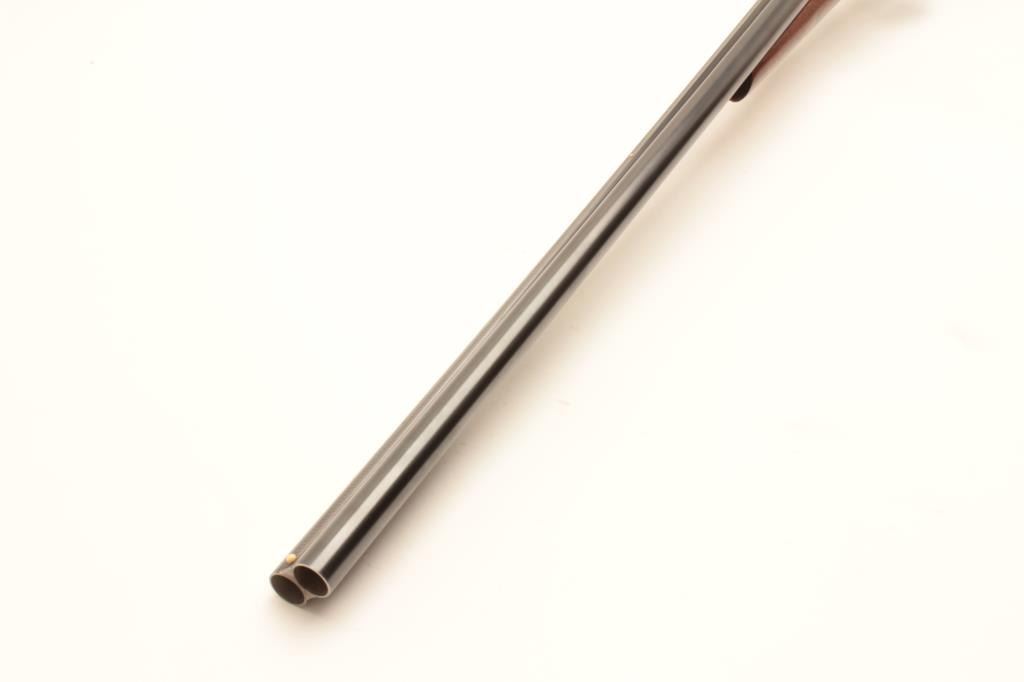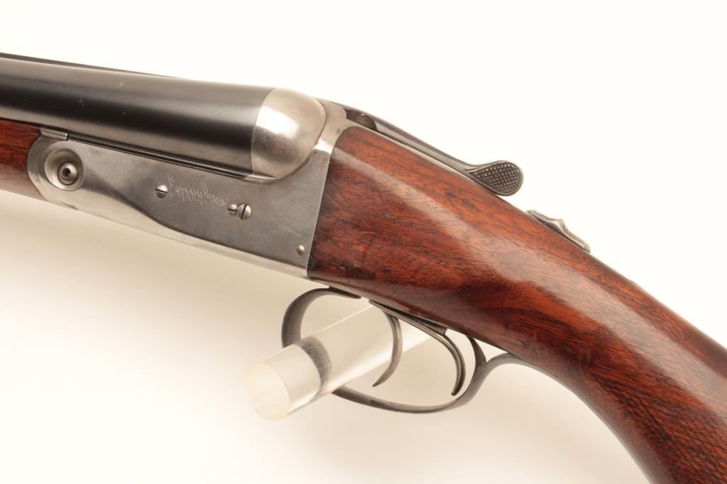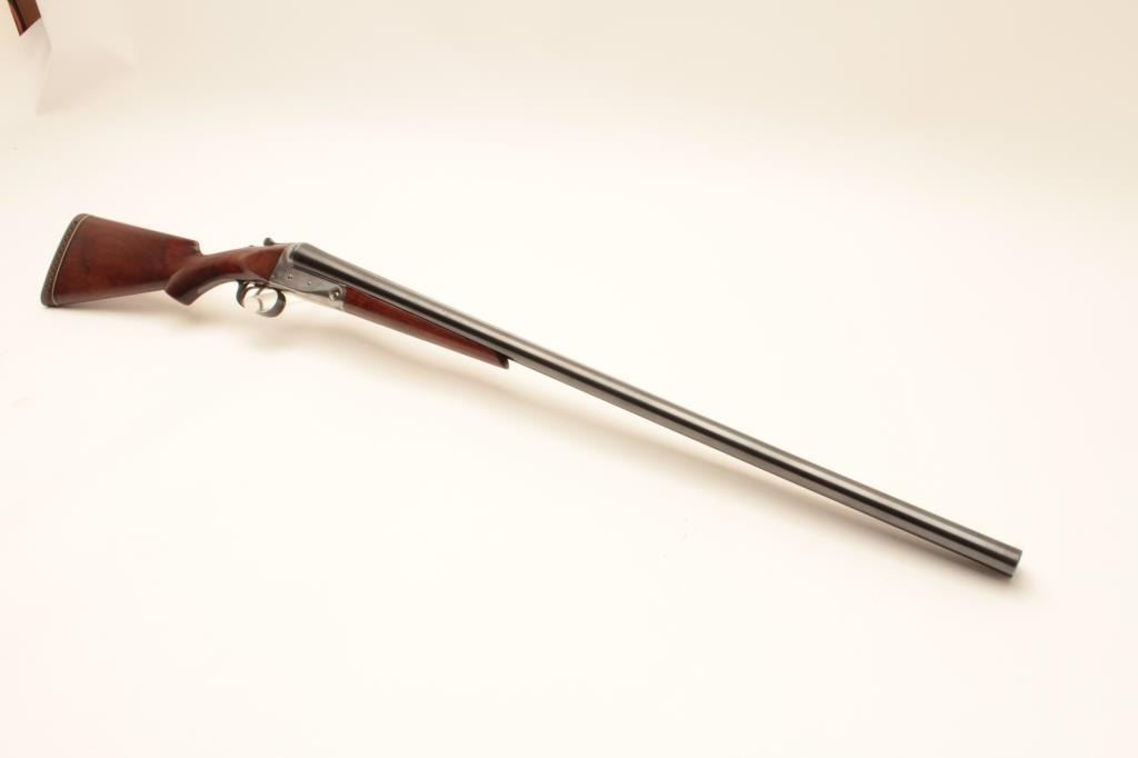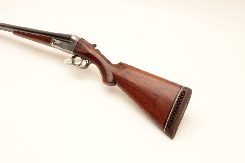 Parker Bros. V Grade S X S shotgun, 12 gauge, Serial #173416. The shotgun is in very good to nearly fine overall condition with 30” barrels with full-length filed rib and ivory bead front sight. The barrels retain nearly Lot Title all their blue finish with small mars and a dent on the underside of the left barrel. The receiver is in the white with a tang mounted safety and double triggers. The smooth wood stock features a splinter fore Lot Title end and has been sanded and a coat of varnish added but is in good overall condition. The butt stock ends with a White Line ventilated rubber pad and a 14” LOP. The bores are good, the action crisp and markings are sharp Lot Title on this desirable Parker Bros. shotgun. Est.: $700-$1,400. (C+R).