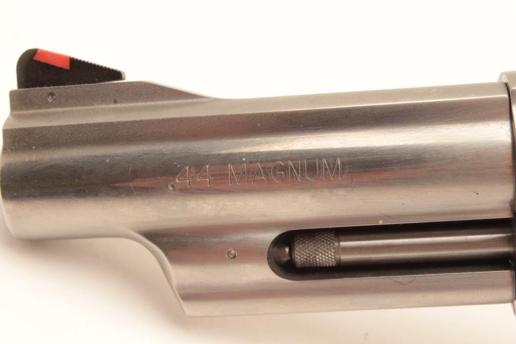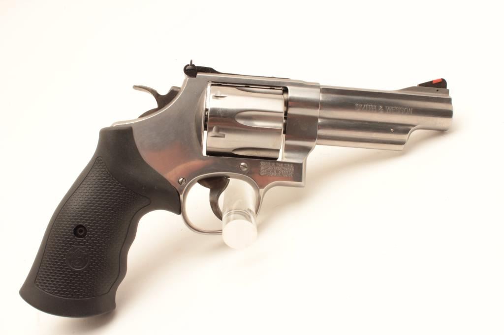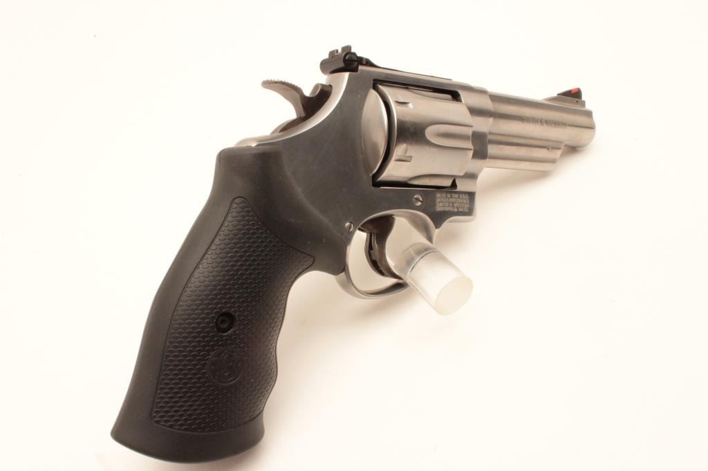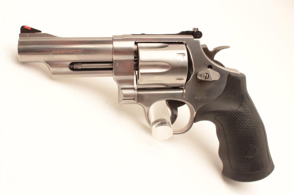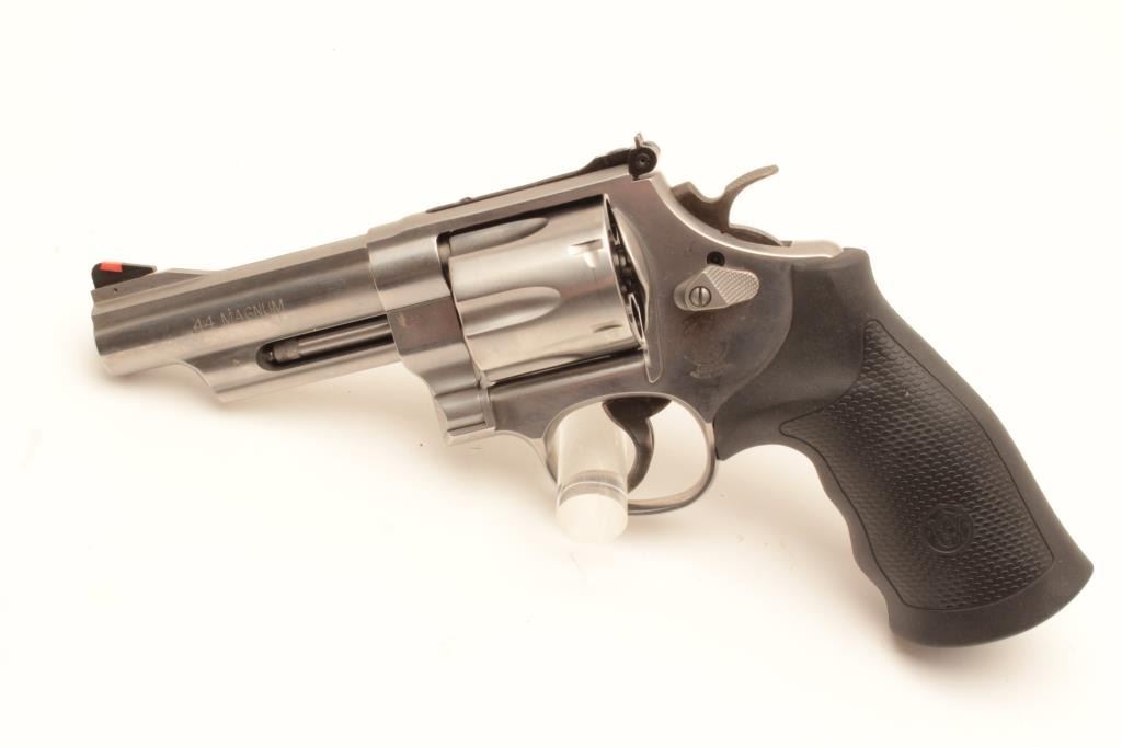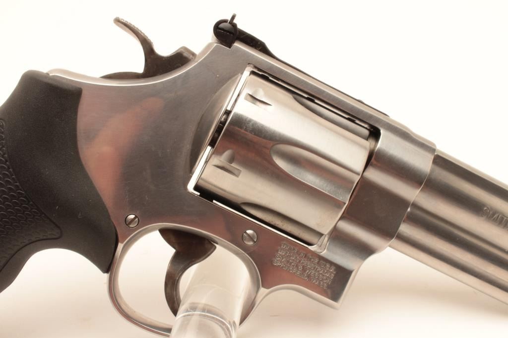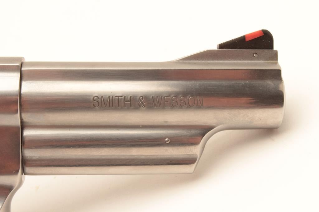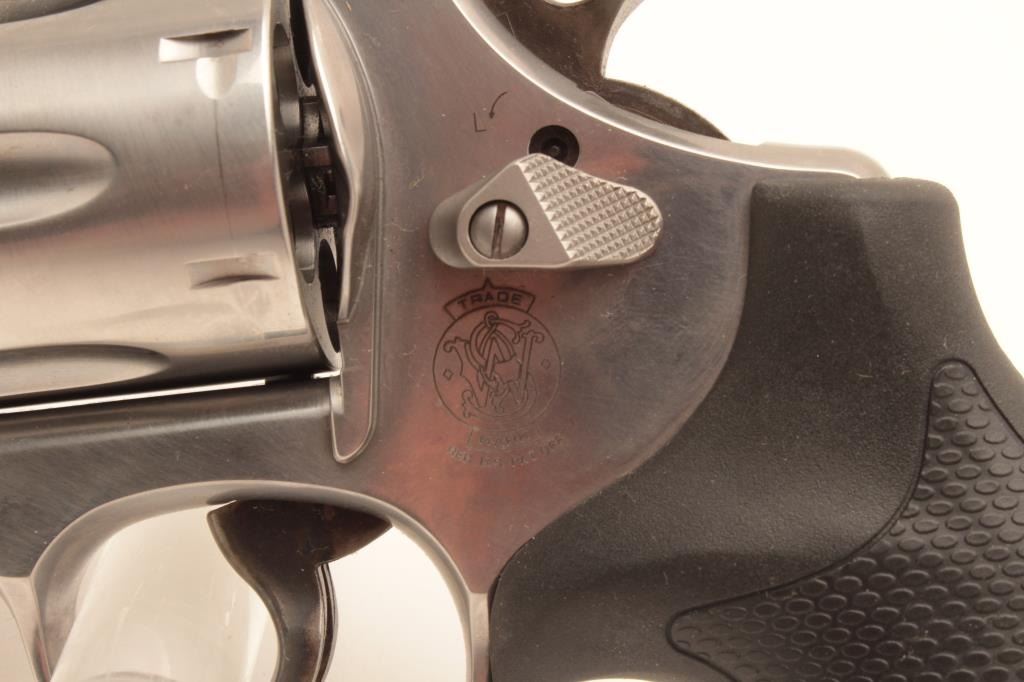 Smith and Wesson Model 629 revolver, .44 Rem. Magnum caliber, Serial #CTR8590. The pistol is in very good overall condition with a 4” barrel with a red ramp front and adjustable rear sights. The pistol retains the majority Lot Title of its matte stainless finish. The textured rubber S&W marked grips are in very good condition showing light wear from carry and use. The bore is good, the action crisp and markings are sharp. The pistol comes in the Lot Title original S&W factory hard case with all associated packaging materials. Est.: $600-$1,200. (Modern).