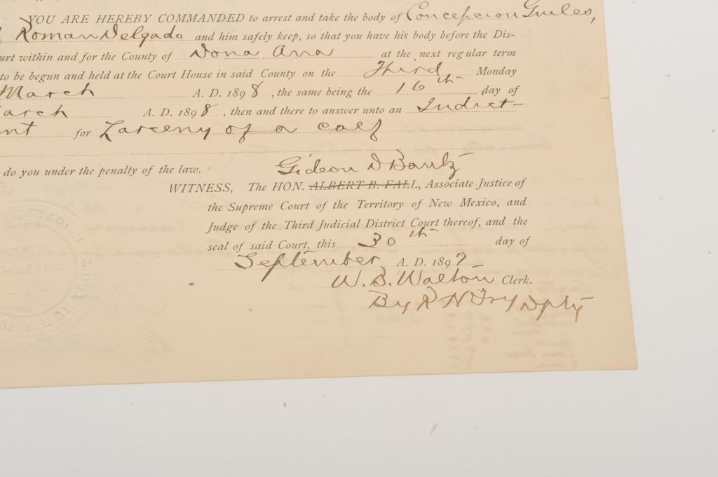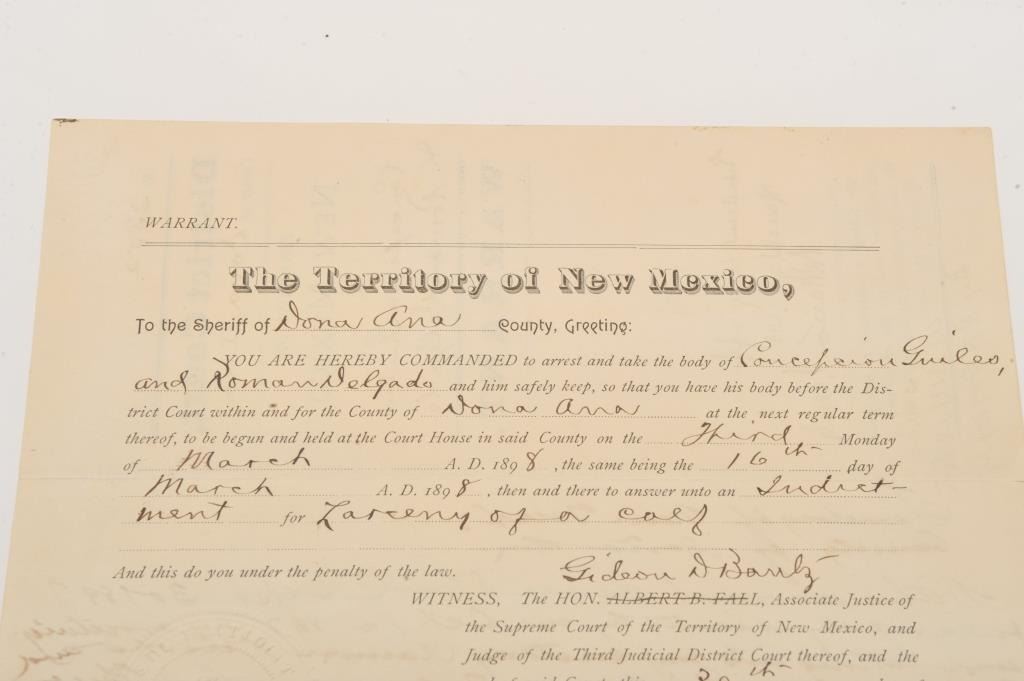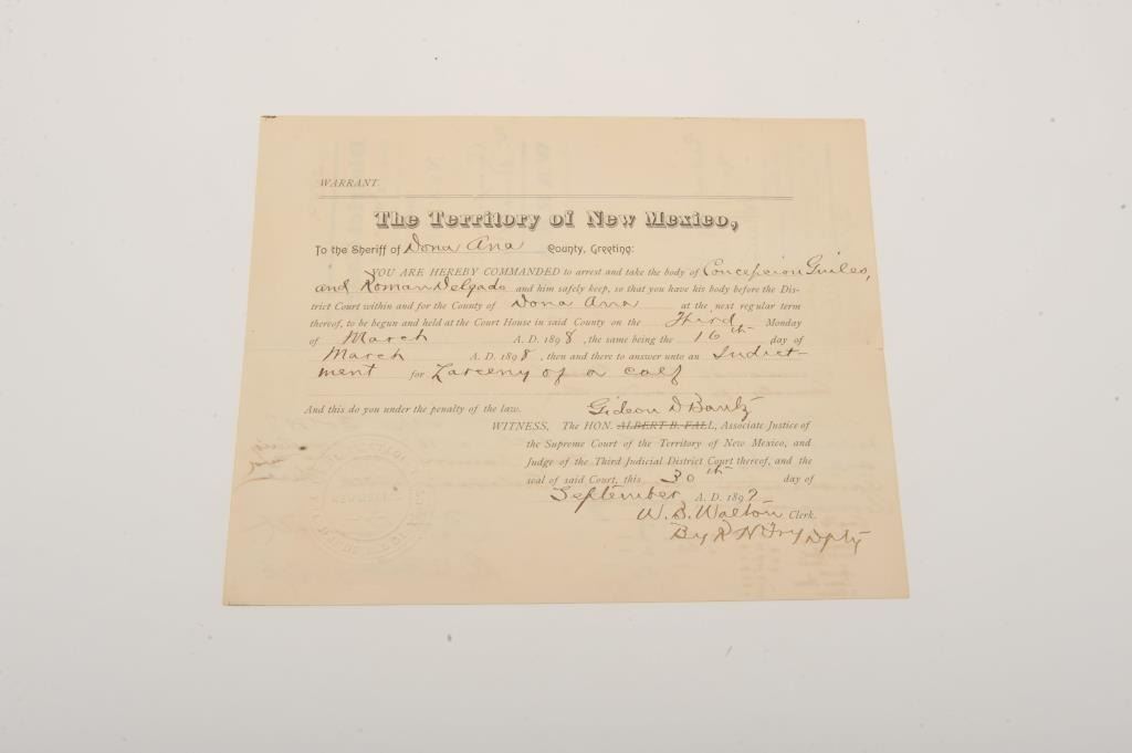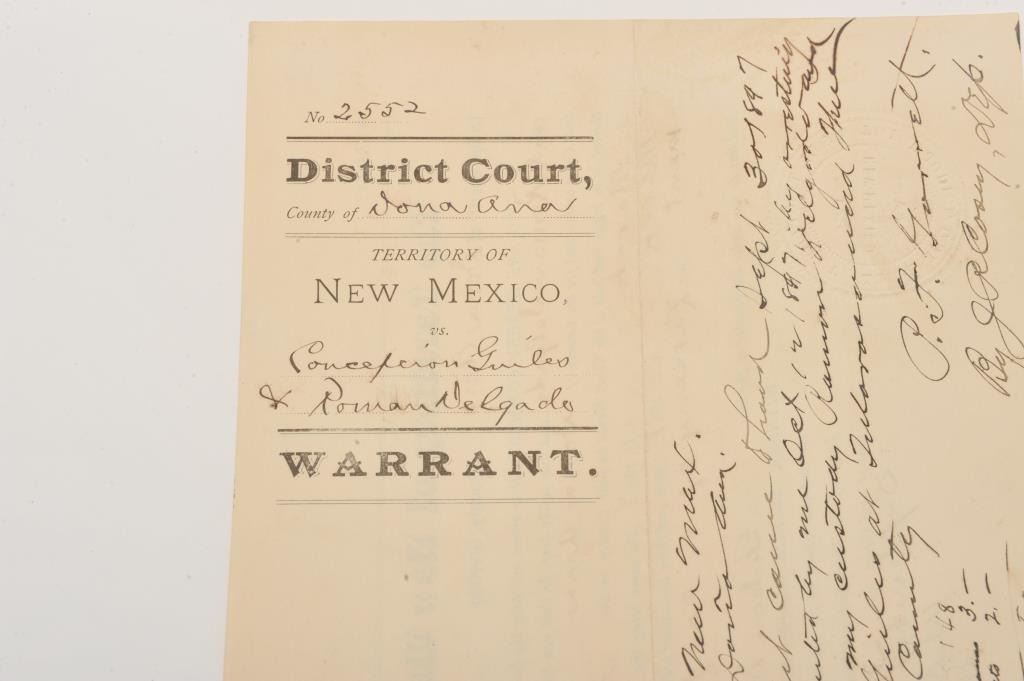 Original Warrant for the arrest of Concepcion Guiles and Roman Delgado, dated Sept. 30, 1897, from the District Court of Dona Ana County, New Mexico Territory with Court seal, signed P. (Pat) F. Garrett, famous Western Lot Title lawman and the man who ended Billy the Kid’s outlaw career. Est.: $750-$1,500.