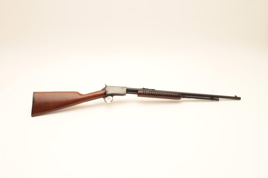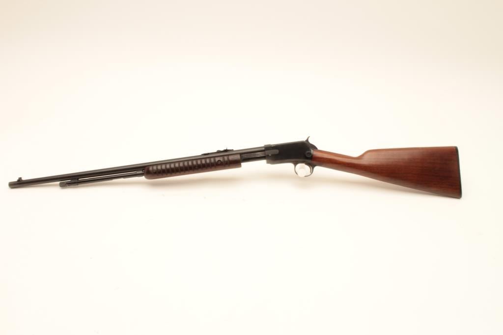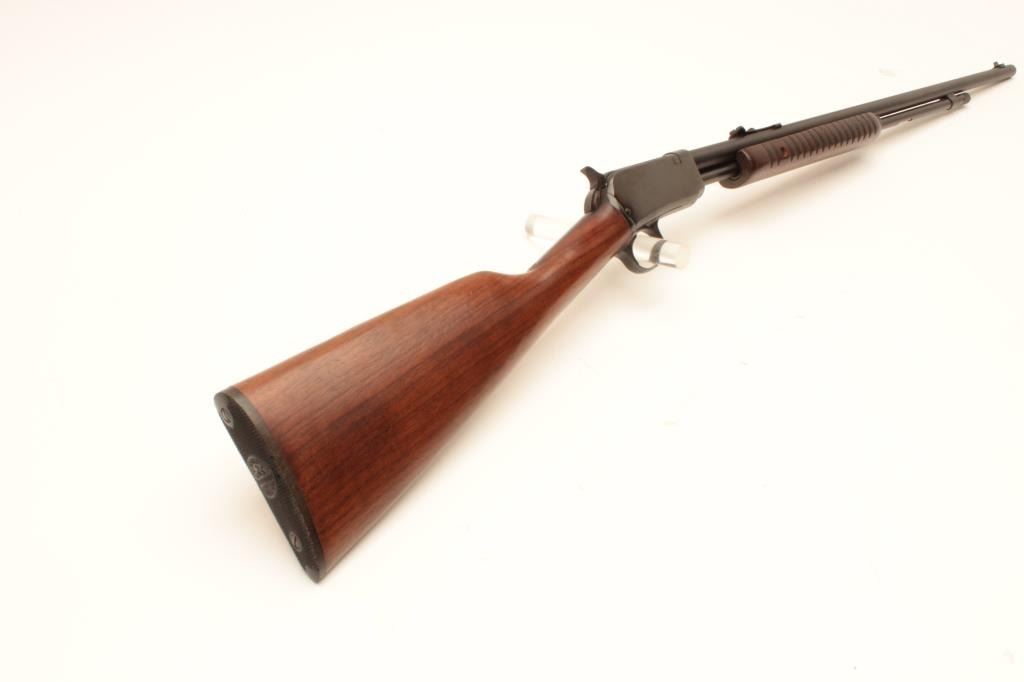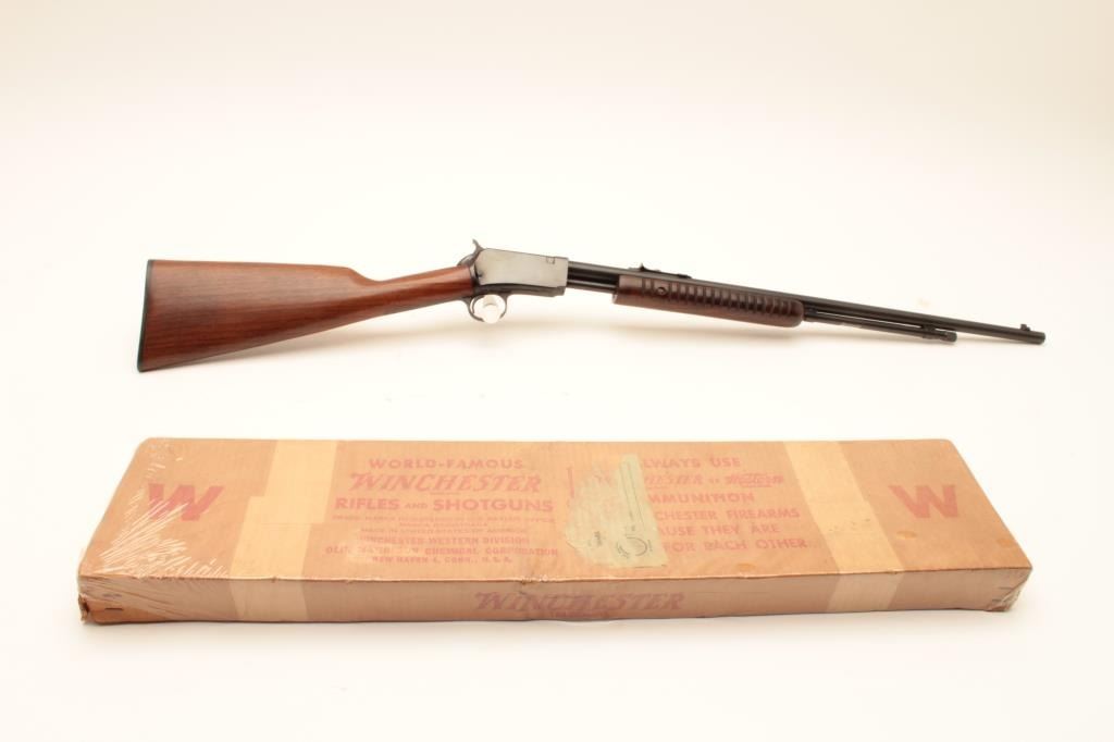 Winchester Model 62A pump action rifle, .22 short, long or LR caliber, 23” round barrel, blued finish, wood stocks, S/N 409758, accompanied by factory cardboard box, in overall fine to excellent condition showing Lot Title little handling or use; box is overall very good. (Modern). Est.: $750-$1,500.