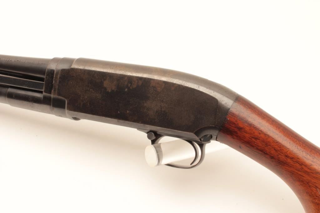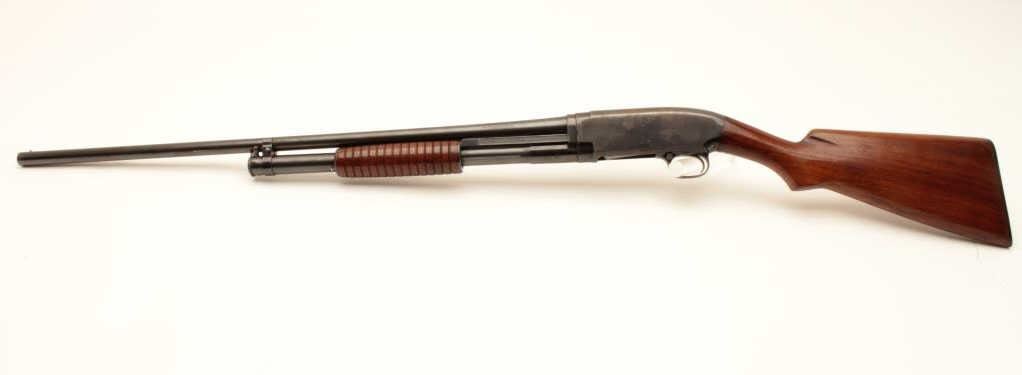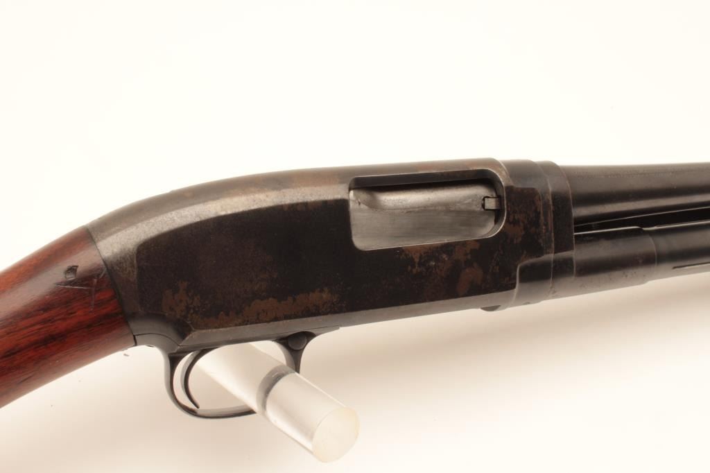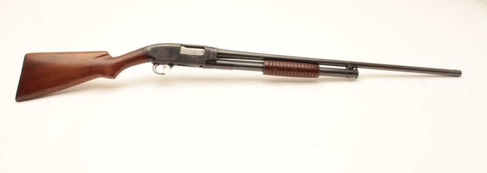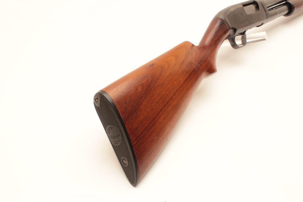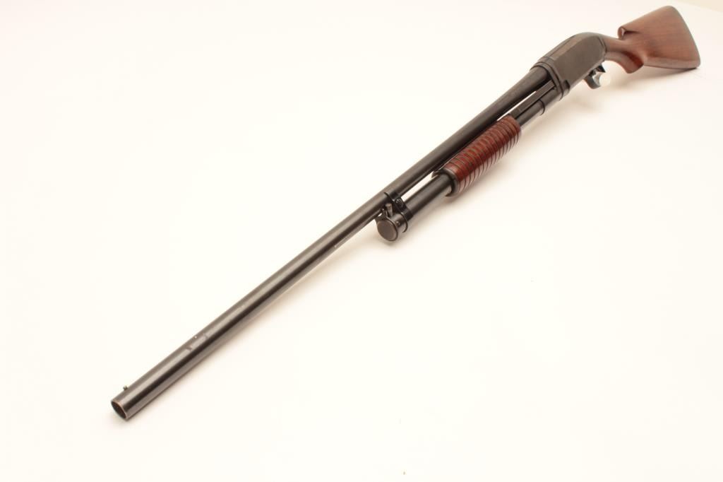 Winchester Model 12 pump action shotgun, 20 gauge, Serial #471533. The shotgun is in good overall condition with a 28” barrel with a steel bead front sight. The barrel and magazine retain the majority of their Lot Title original blue finish with wear at the muzzle, small scrapes and some light surface erosion noted. The receiver retains a significant amount of its flaking blue finish. The smooth wood stocks are in good condition with Lot Title mars and compressions consistent with carry and use. The butt ends with a Winchester marked plastic butt plate providing a 13 ½” LOP. The bore is good, the action crisp and markings are sharp. Est.: $250-$500. Lot Title (Modern).