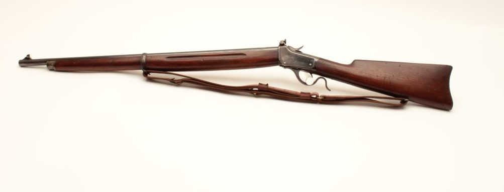 U.S. marked Winchester Low Wall single shot rifle, .22 Short caliber, Serial #127045. The rifle is in very good overall condition with a 27” barrel. The “Winder Musket” is a blade front sight and a Lyman aperture sight Lot Title added at the tang. The barrel and receiver retain a significant amount of their blue finish with the remainder going to a grey patina. The rifle is martially marked, U.S. at the tang with the flaming bomb emblem. Lot Title The smooth wood stock is in good condition showing moderate use and wear with mars and compressions. The butt ends with a smooth steel butt plate. The bore is fair, the action crisp and markings are sharp on this Lot Title martially marked low wall. The lot includes a period leather military style sling. Est.: $500-$1,000. (C+R).