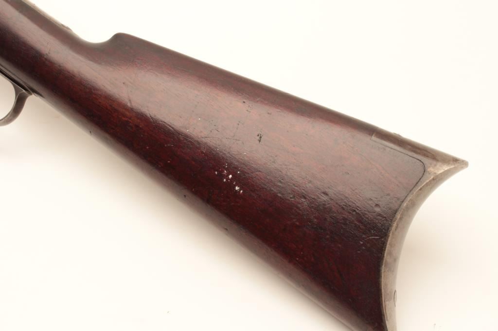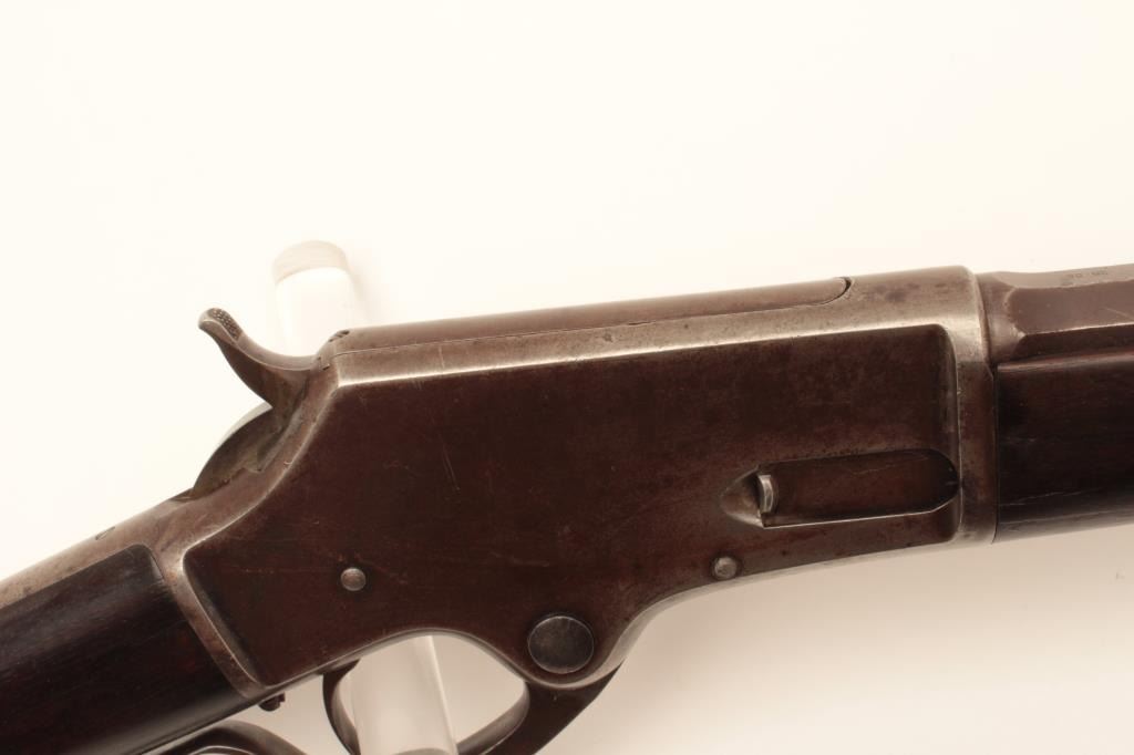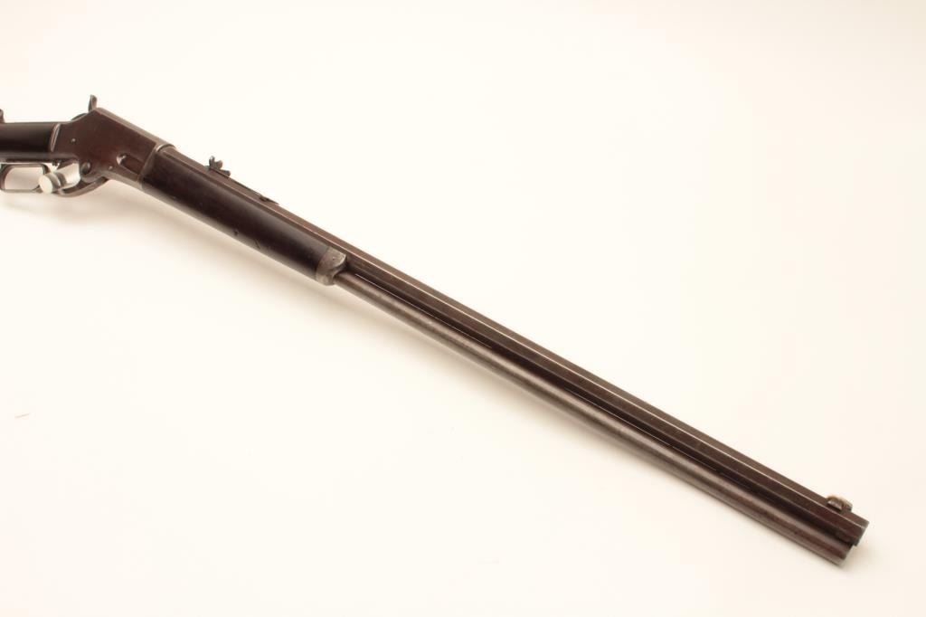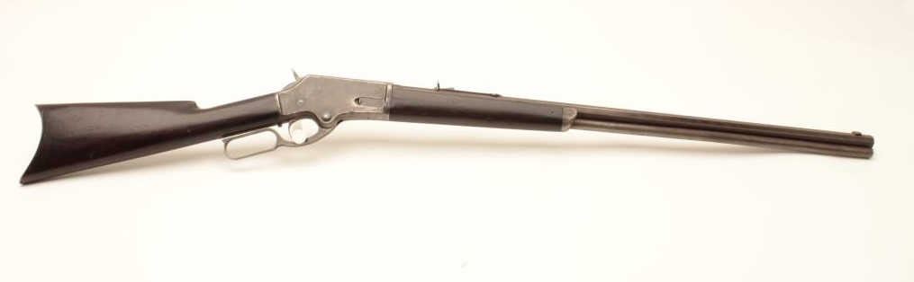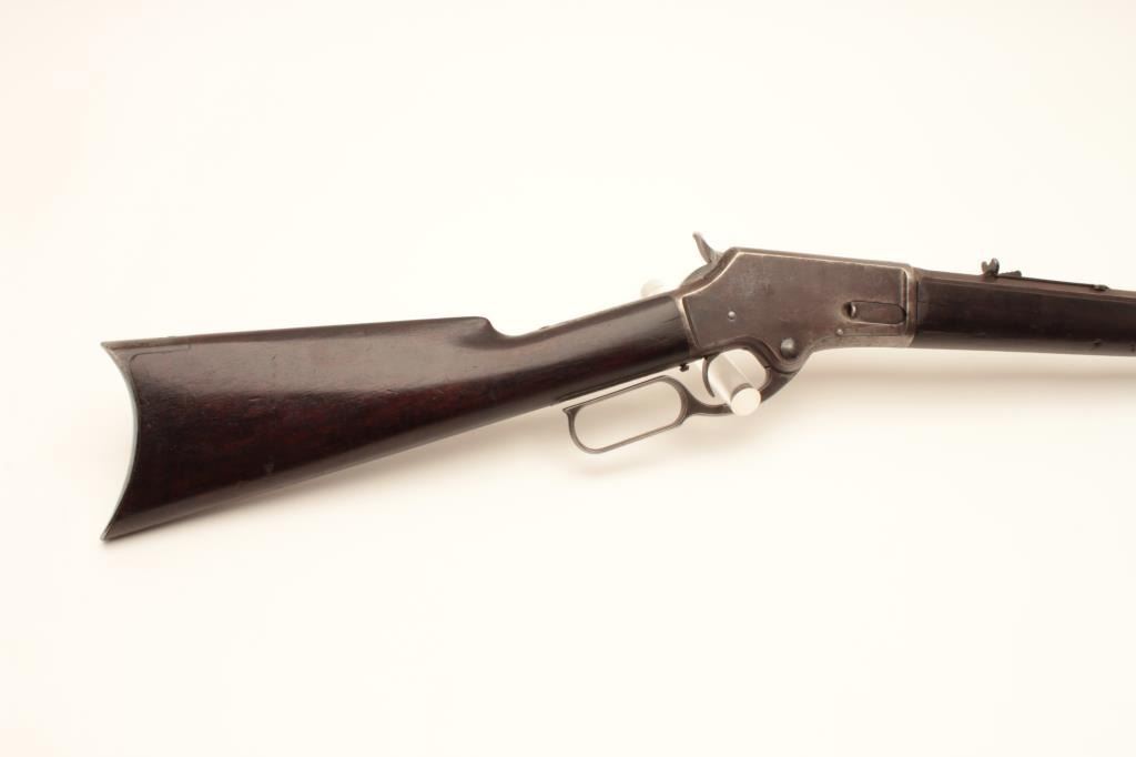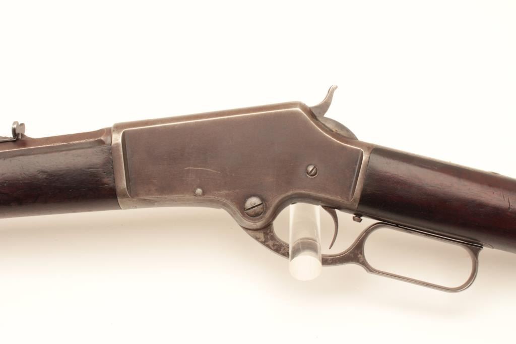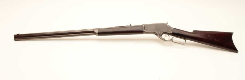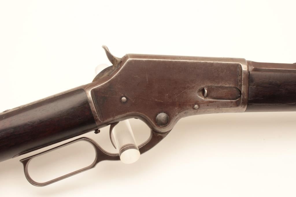 Marlin Model 1881 lever action rifle, .38-55 caliber, Serial #20690. The rifle is in good overall condition with a 28” octagon barrel with a silver knife blade front and standard rear sights. The barrel and full-length Lot Title magazine retain a significant amount of muted blue finish with the remainder going to plum patina. The barrel features sharp edges with high point edge wear and small mars noted. The receiver has gone to a plum Lot Title patina with some original blue in protected areas. The lever and hammer show old, toned case hardening. The smooth wood stock is in good condition with mars, compressions and an old coat of varnish added. The butt stock Lot Title ends with a smooth, steel crescent butt plate. The bore is fair, the markings are sharp and action is crisp on this early Model 1881 circa 1888. $700-$1,700. (Antique).