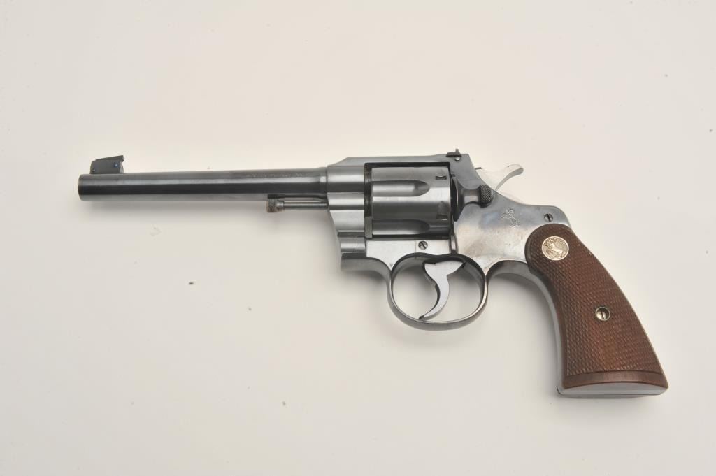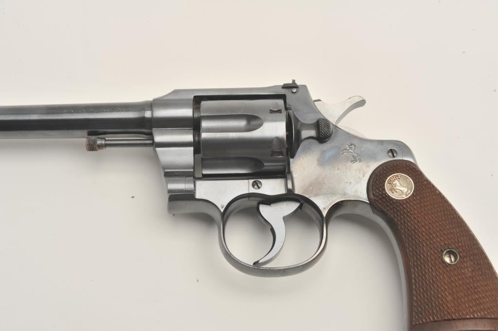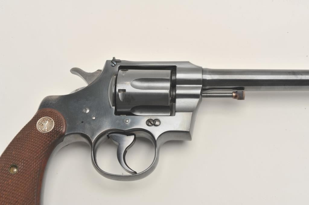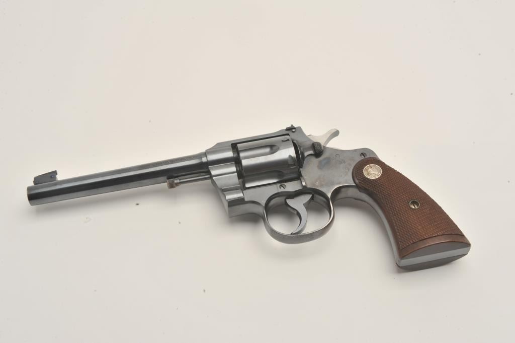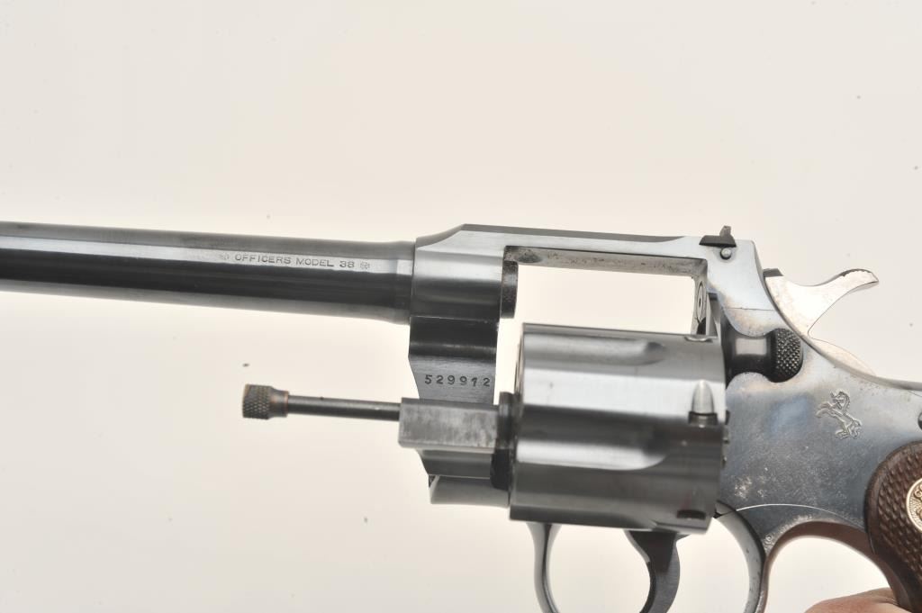 Colt Officers Model double action revolver, .38 caliber, Serial #529912. The pistol is in fine overall condition with a 6” barrel. The pistol retains nearly all of its blue finish with light wear at the muzzle and Lot Title storage marks. The checkered wood silver medallion grips are in very good condition with sharp checkering and the grip strap is checkered. The bore is good, the action is crisp and the markings are sharp on this Lot Title desirable flat top Officers Model Colt. Est.: $600-$1,200. (C+R).