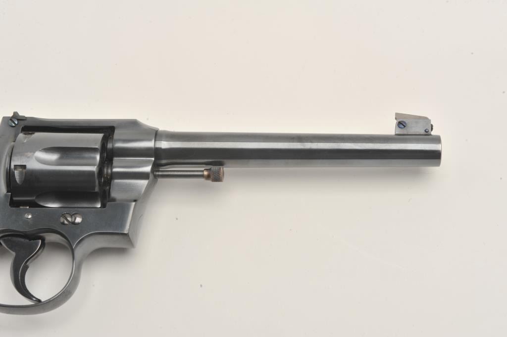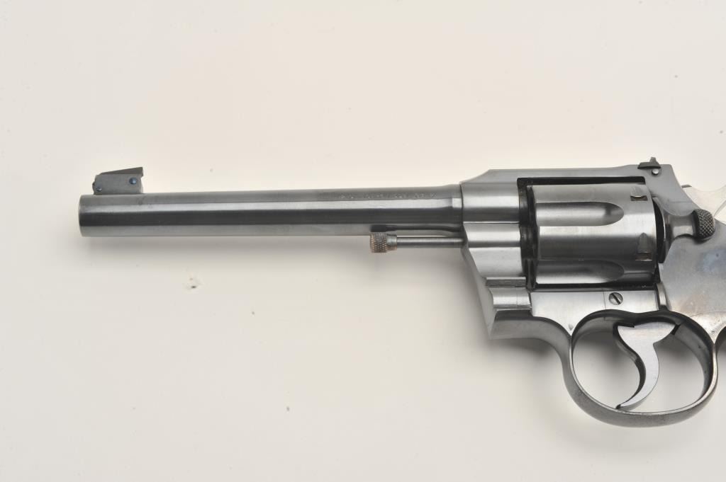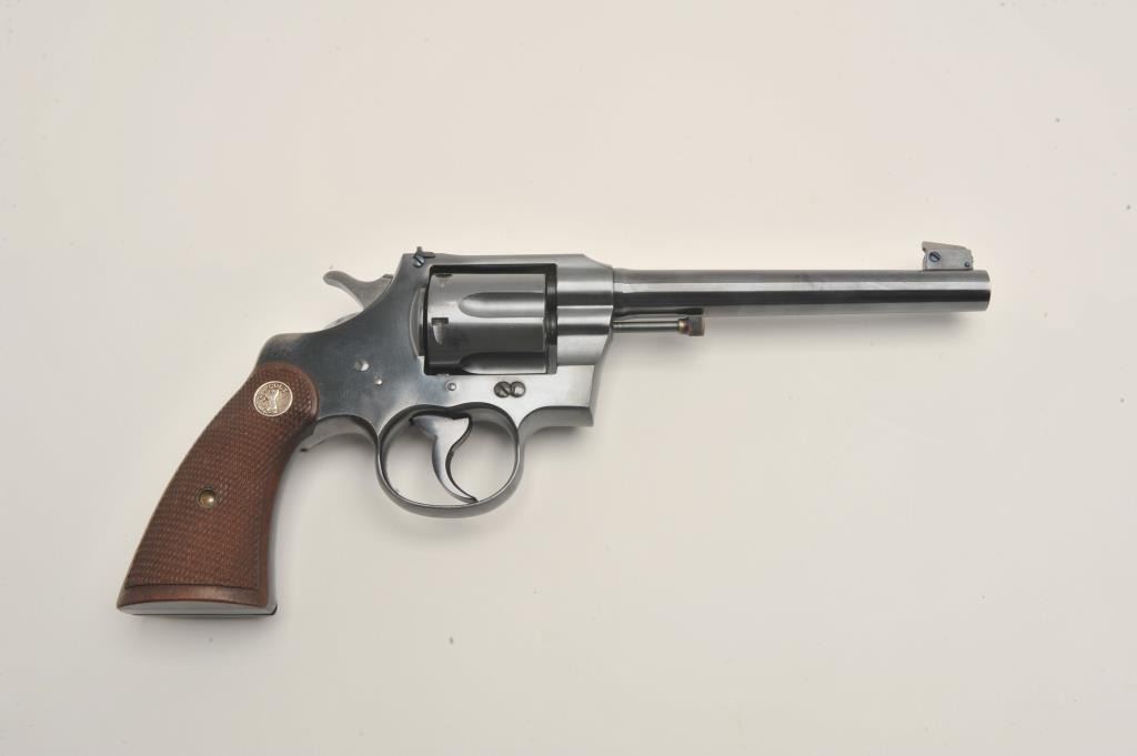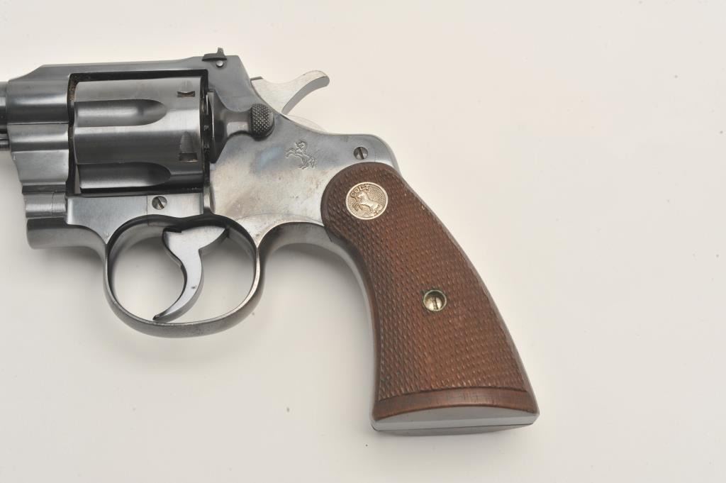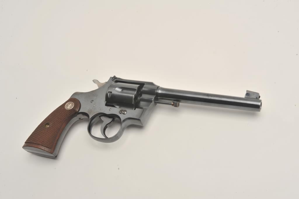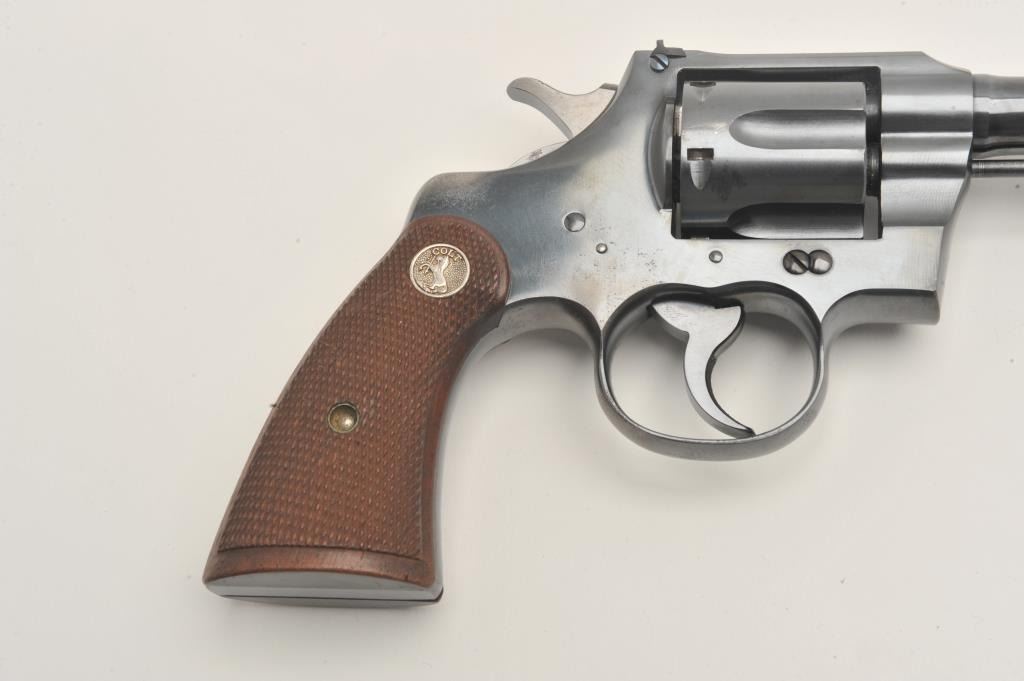 Colt Officers Model double action revolver, .38 caliber, Serial #529912. The pistol is in fine overall condition with a 6” barrel. The pistol retains nearly all of its blue finish with light wear at the muzzle and Lot Title storage marks. The checkered wood silver medallion grips are in very good condition with sharp checkering and the grip strap is checkered. The bore is good, the action is crisp and the markings are sharp on this Lot Title desirable flat top Officers Model Colt. Est.: $600-$1,200. (C+R).