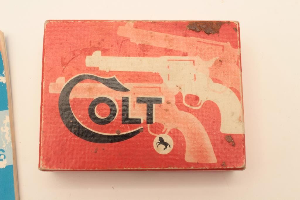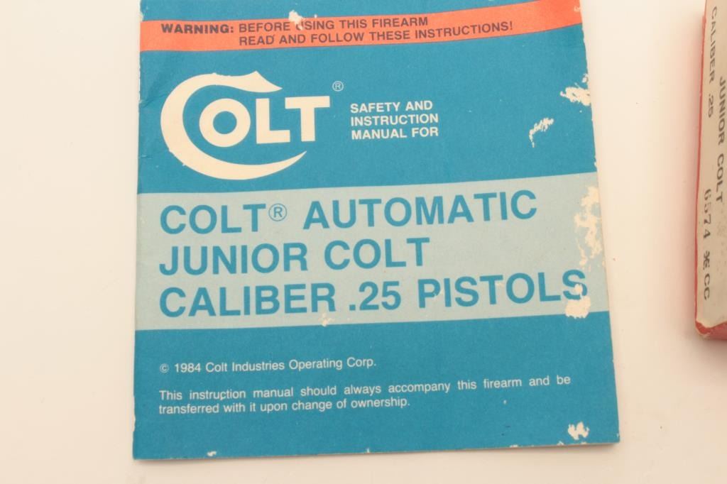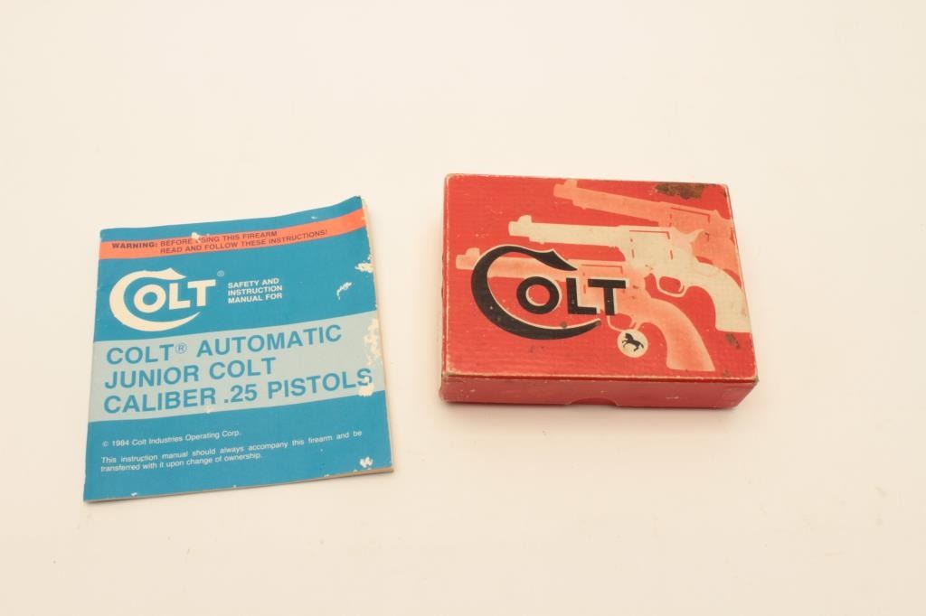 Colt Junior Model pocket semi-automatic pistol, .25 caliber, 2.25” barrel, blued finish, checkered black grips, S/N 6574CC, in overall very good condition with some scattered light spots of erosion, very good Lot Title bore, crisp action, sharp markings and very good grips; accompanied by factory two piece cardboard box with end label numbered to this gun and instructions manual. (Modern). Est.: $150-$300.