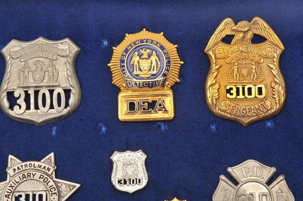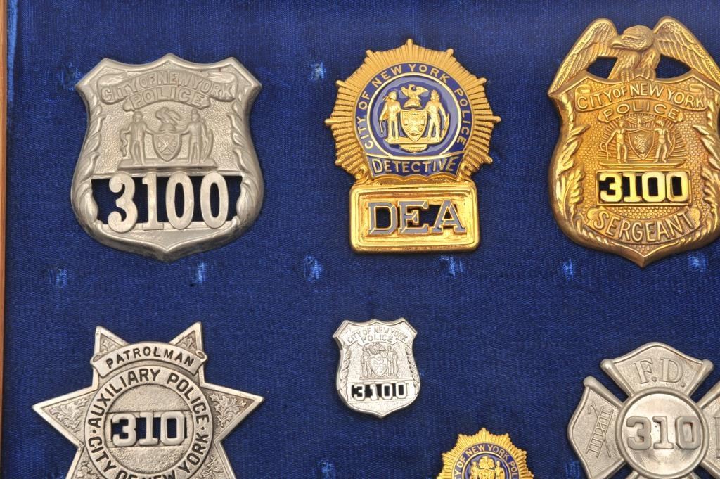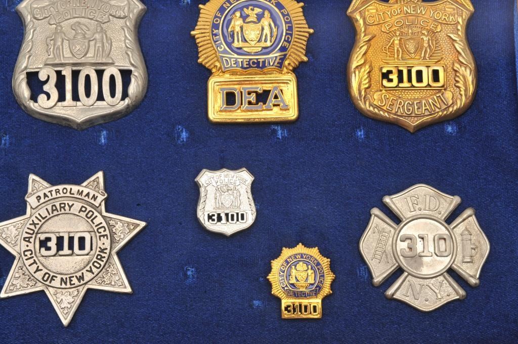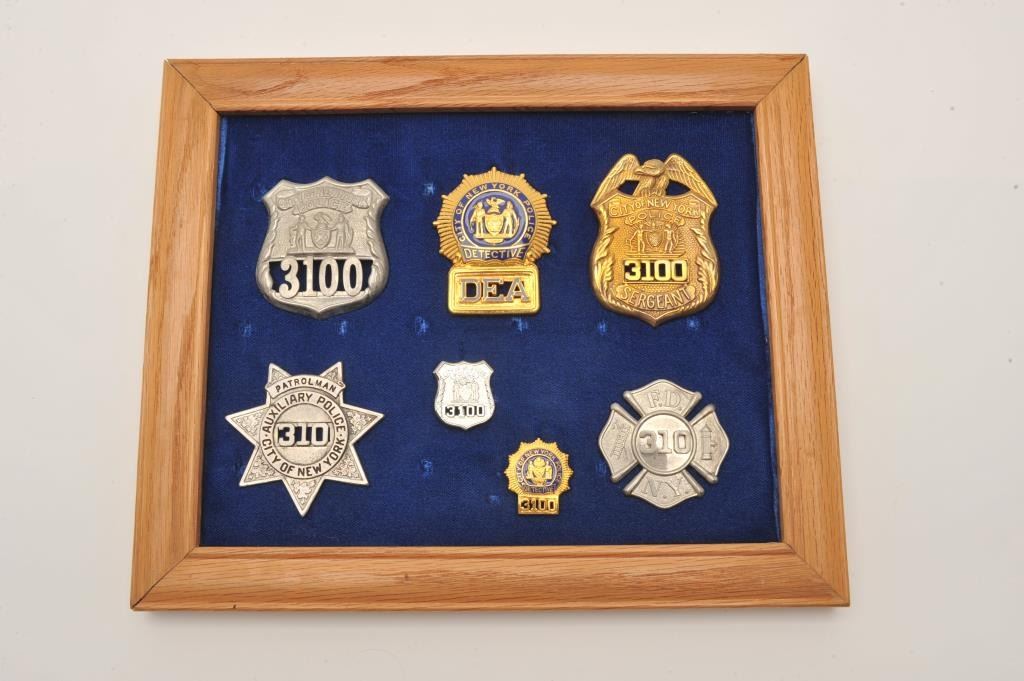 Wood framed display with 7 badges including City of New York Police, City of New York Police Detective, City of new York Sergeant, City of New York Auxiliary Patrolman, N.Y.F.D. plus a City of New York Patrolman Lot Title lapel pin and City of New York Detective lapel pin. Est.: $350-$700.