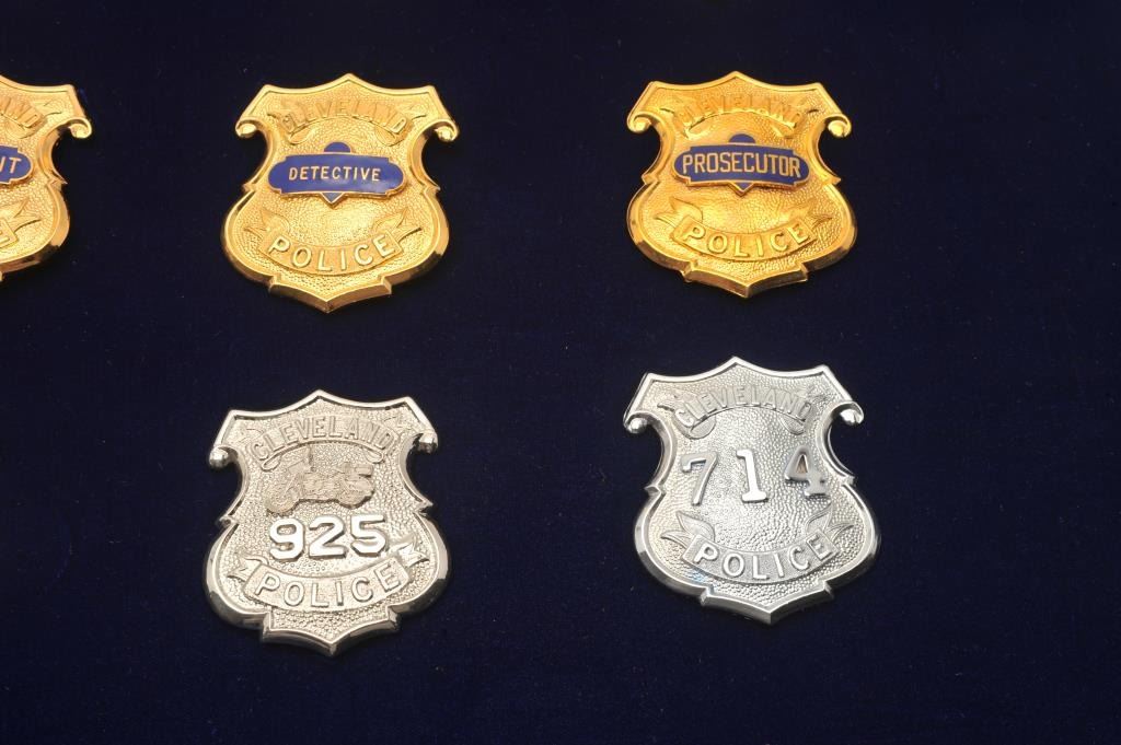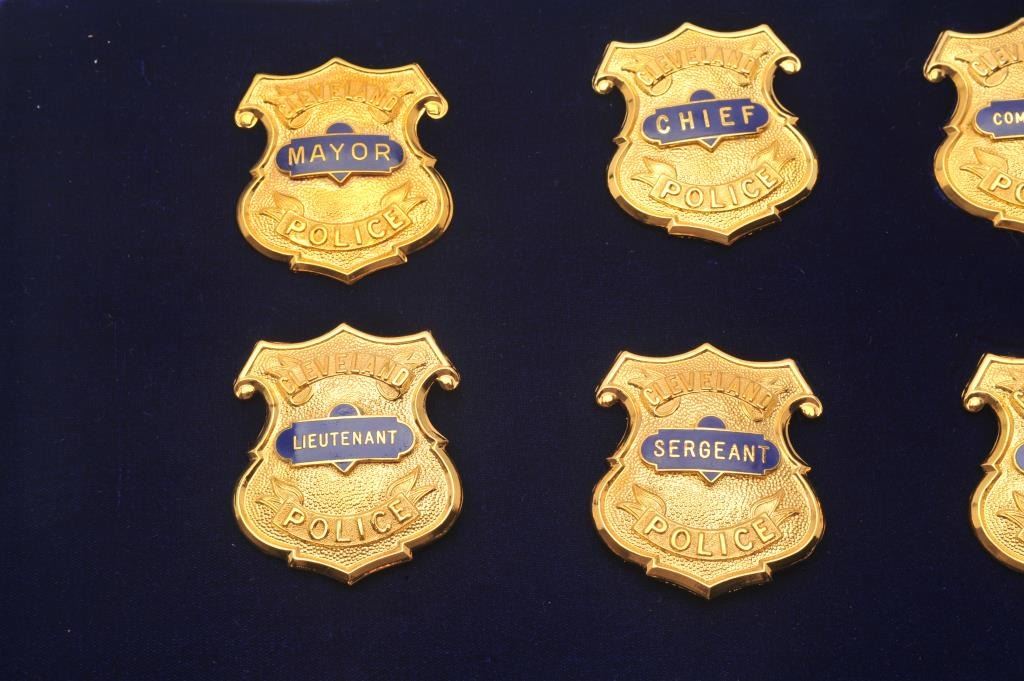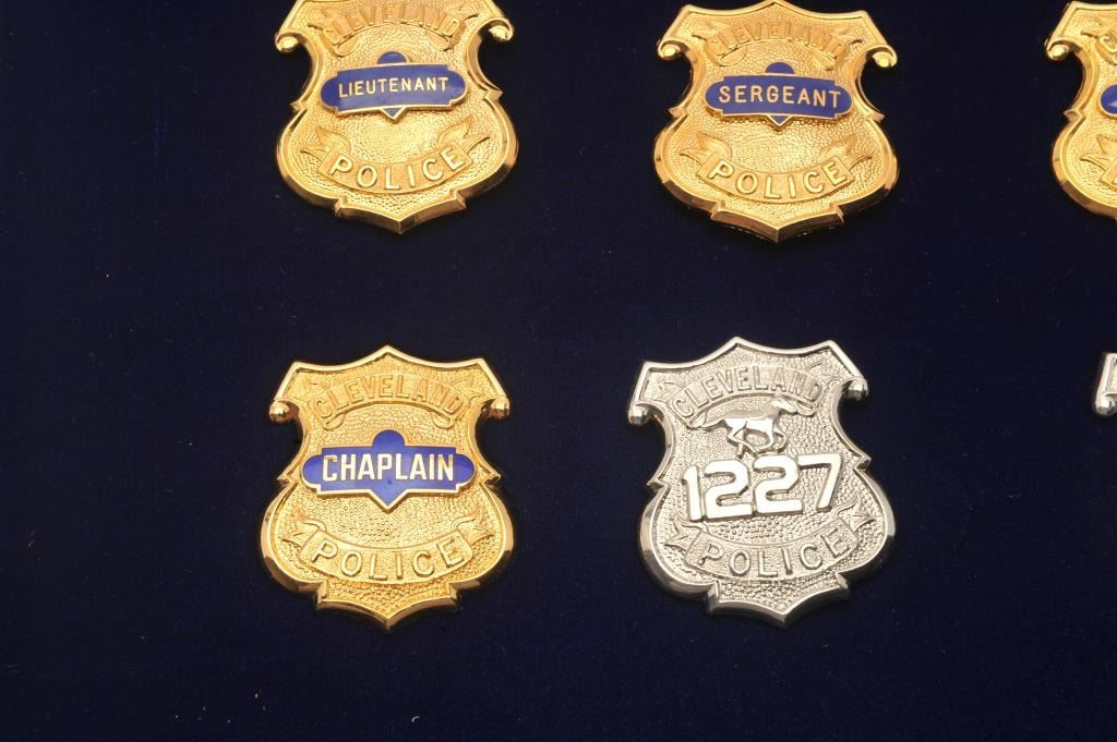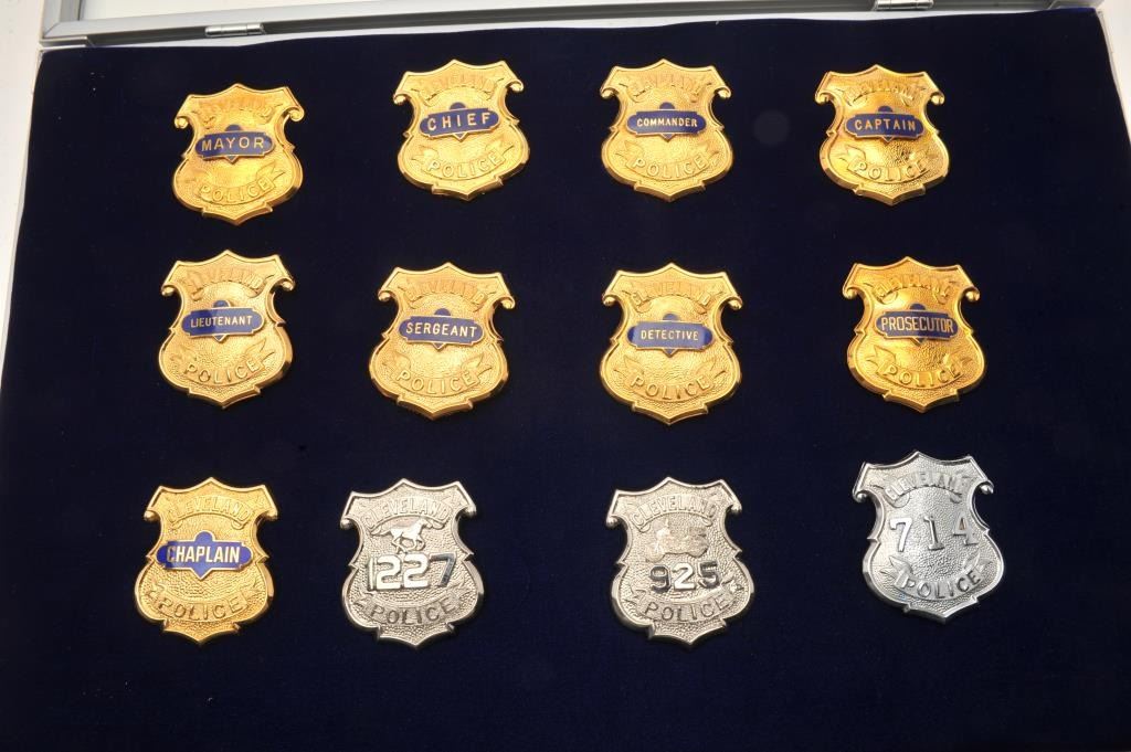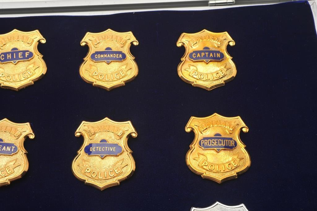 Aluminum and glass display case of 12 Cleveland Police badges including Mayor, Chief Commander, Captain, Lieutenant, Sergeant, Detective, Prosecutor, Chaplain, Patrolman, Motor Officer and Horse Patrol; Lot Title most maker marked “Dawson Co. Mfrs./Cleveland, OH/44114-4167. Est.: $400-$800.