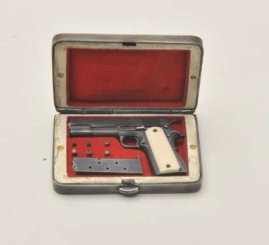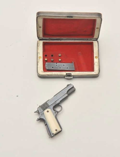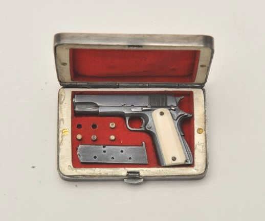 Miniature .45 semi-automatic 1911 A-1 style pistol, finely made and in beautiful silver jeweler made casing! Est.: $600-$1,200.