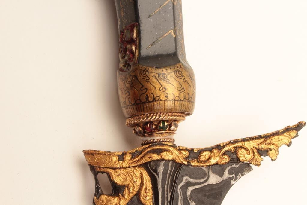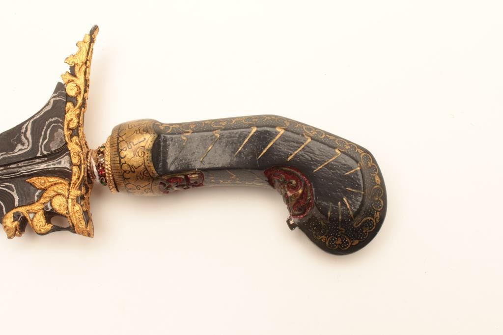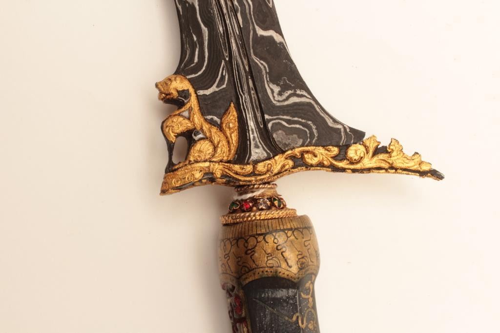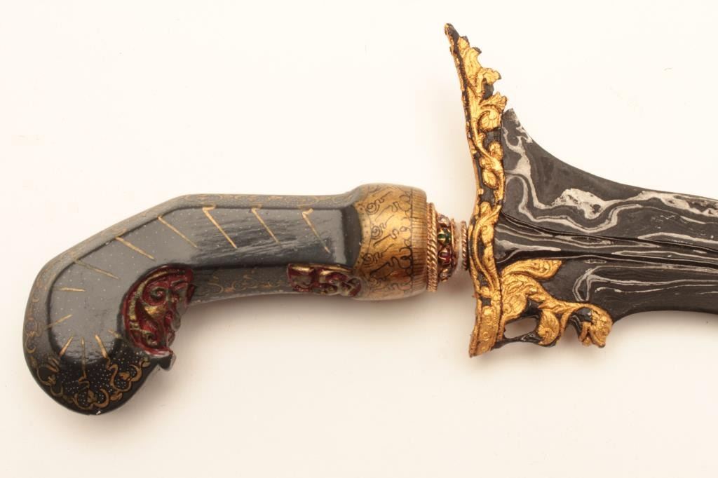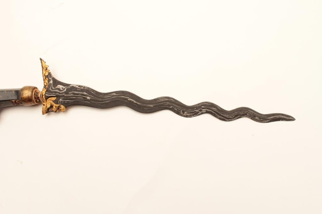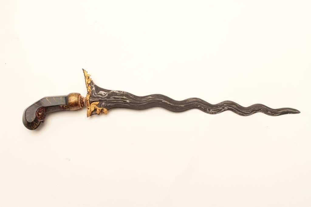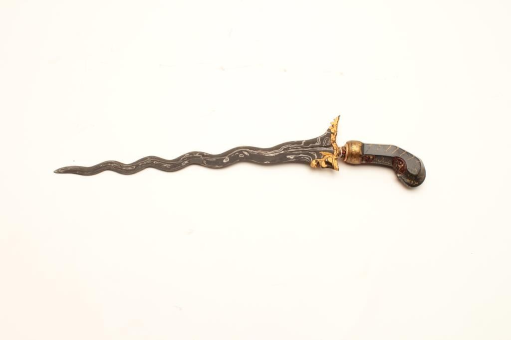 Kris with meteorite steel blade, no scabbard, gold inlay, painted and carved grip. Est.: $175-$350.