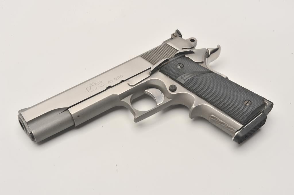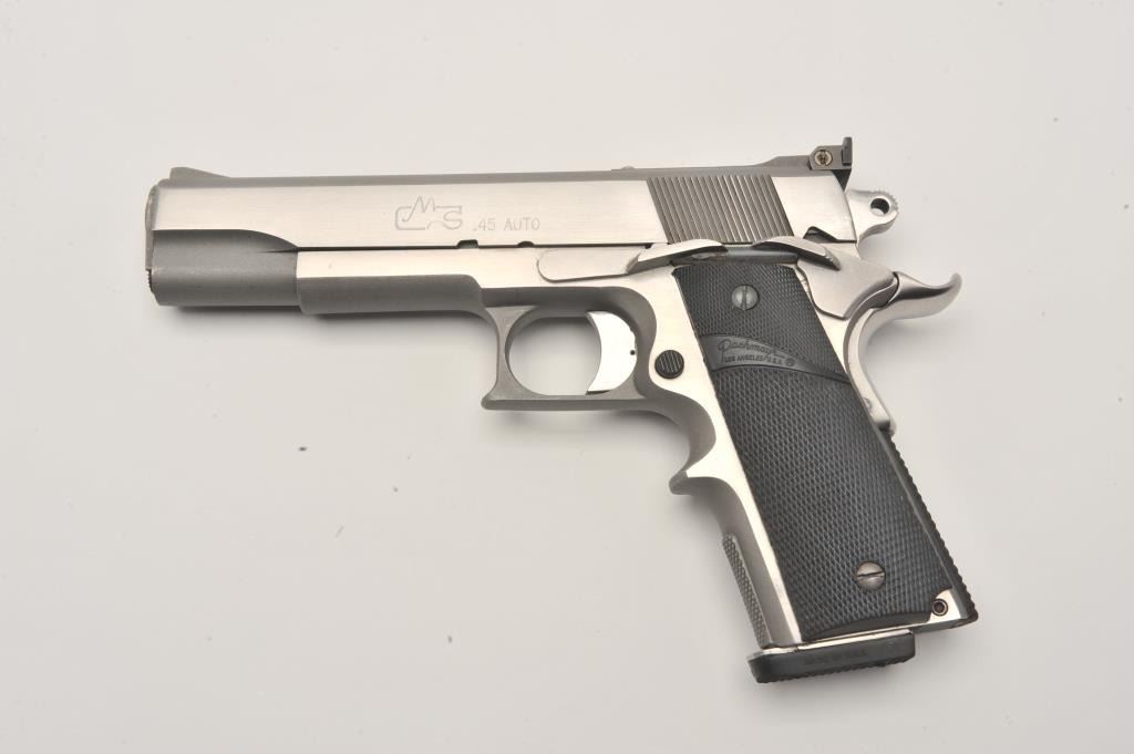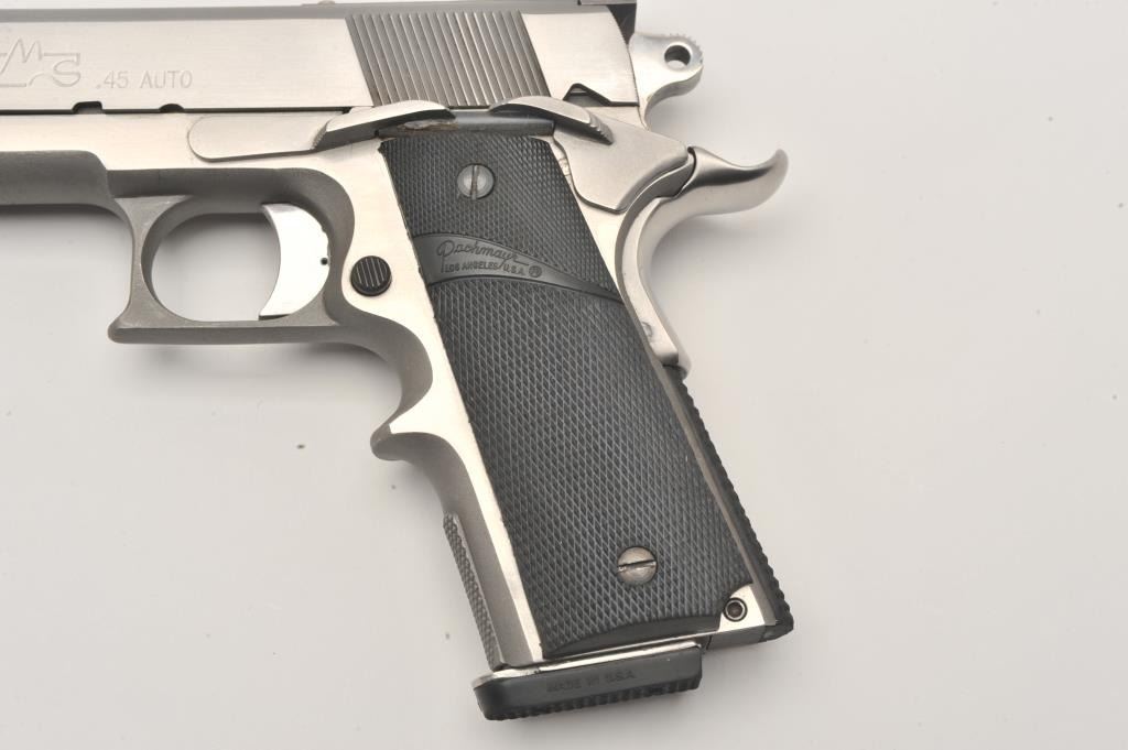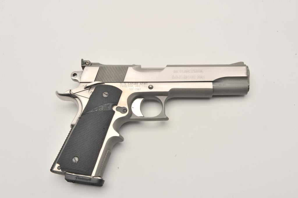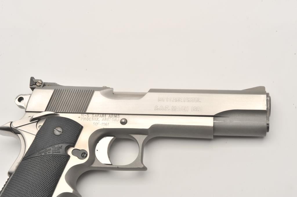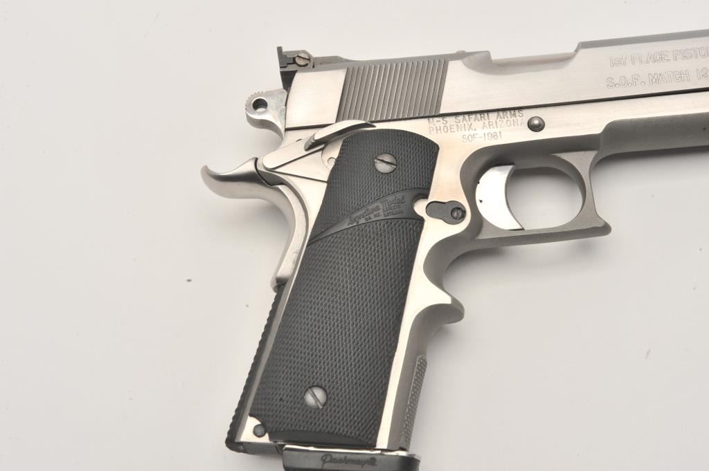 Safari Arms custom 1911 style semi-automatic pistol, .45 Auto caliber, Serial #SOF-1981. The pistol is in fine overall condition with a 5” barrel with an adjustable rear sight. The pistol retains nearly all of its polished Lot Title stainless finish with small mars and edge wear noted. The slide is marked, “1st PLACE PISTOL S.O.F. MATCH 1981”. The checkered rubber Pachmayr combat grips are in very good condition. The front strap is knurled at Lot Title the base and stepped to provide greater control. The pistol features one correct Pachmayr magazine with a rubber bumper. The bore is very good, the action crisp and markings are sharp on this custom 1911 style Lot Title pistol. Est.: $600-$1,200. (Modern).