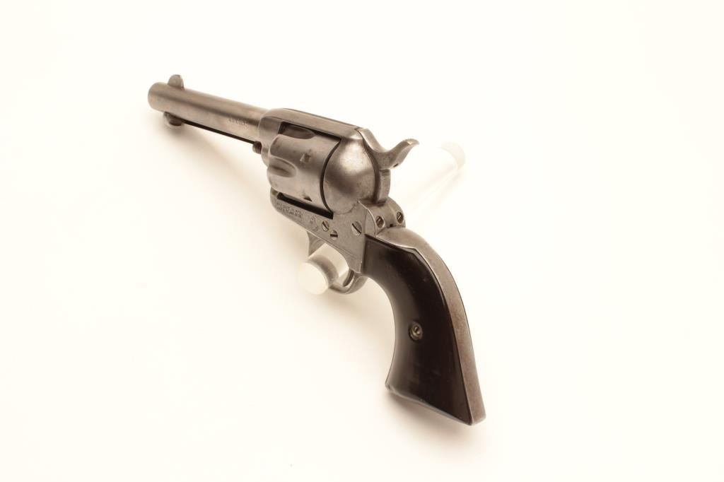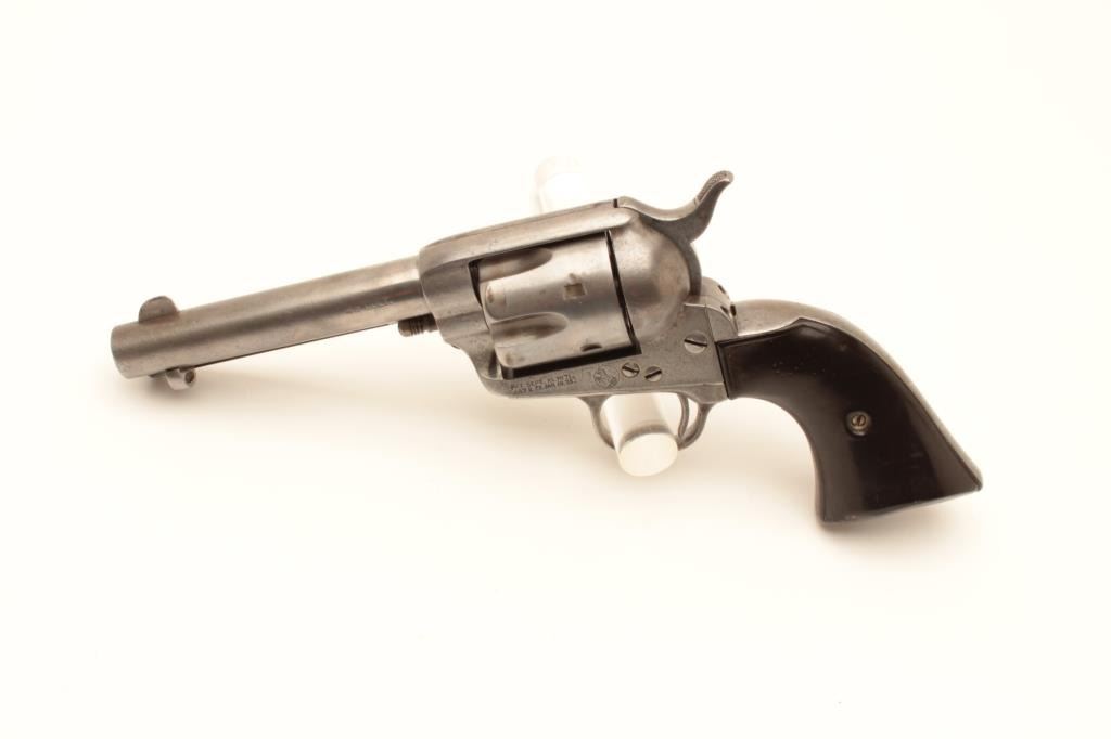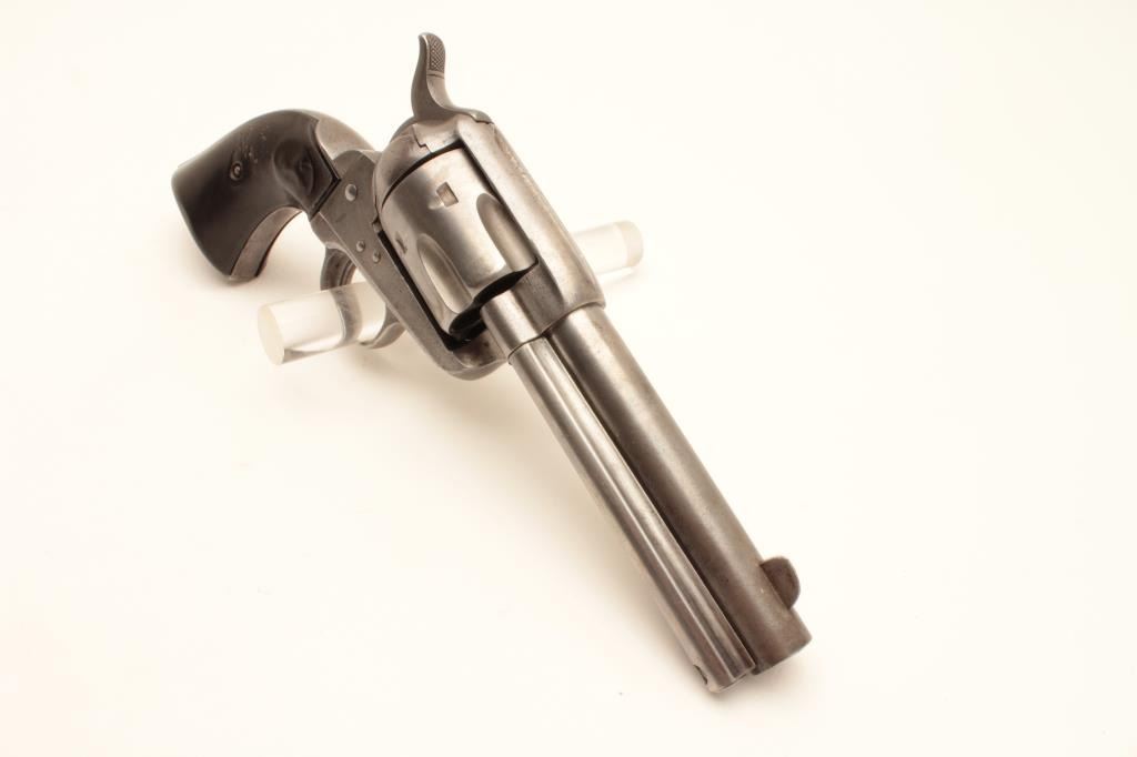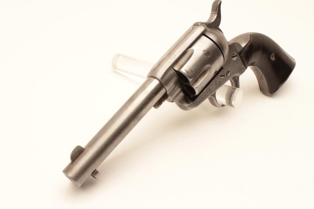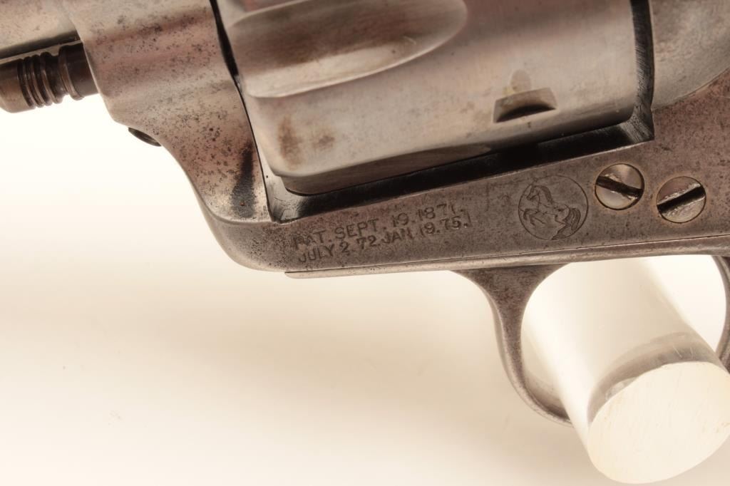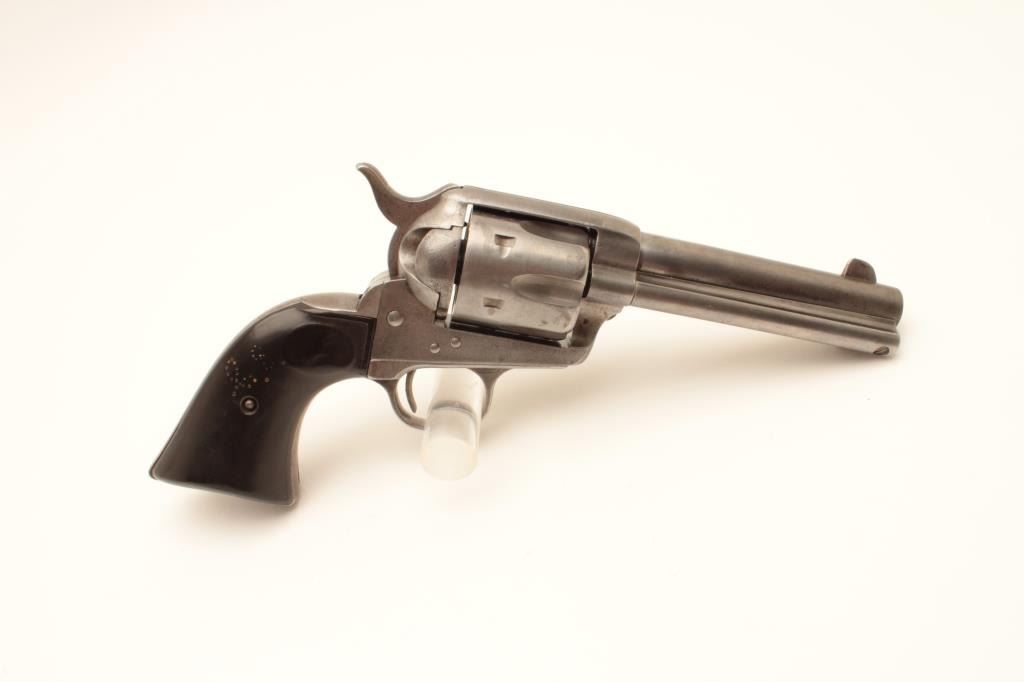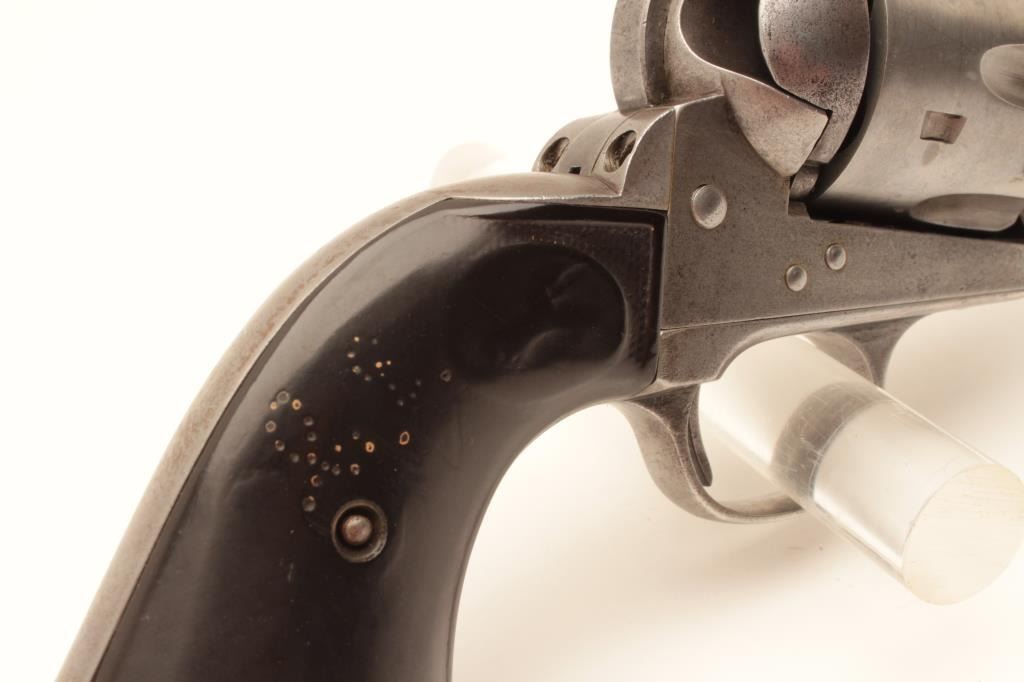 Colt 1st Generation SAA revolver, .45 caliber, Serial #150176. The pistol is in good overall condition with 4 ¾” barrel. The metal surfaces have been lightly cleaned and gone to a silver patina with the barrel Lot Title address still partially visible. The caliber marking is still visible and there is some light pinprick pitting along the barrel. The action functions well at the time of description with all matching visible serial Lot Title numbers. The hard rubber grips are all but smooth from wear with some old initials carved into them. The grips fit well despite being so worn. The bore is good, the action functions and the markings are legible on Lot Title this nice old, black powder frame Colt SAA. The lot includes an extra cylinder. Est.: $1,000-$2,000. (Antique).