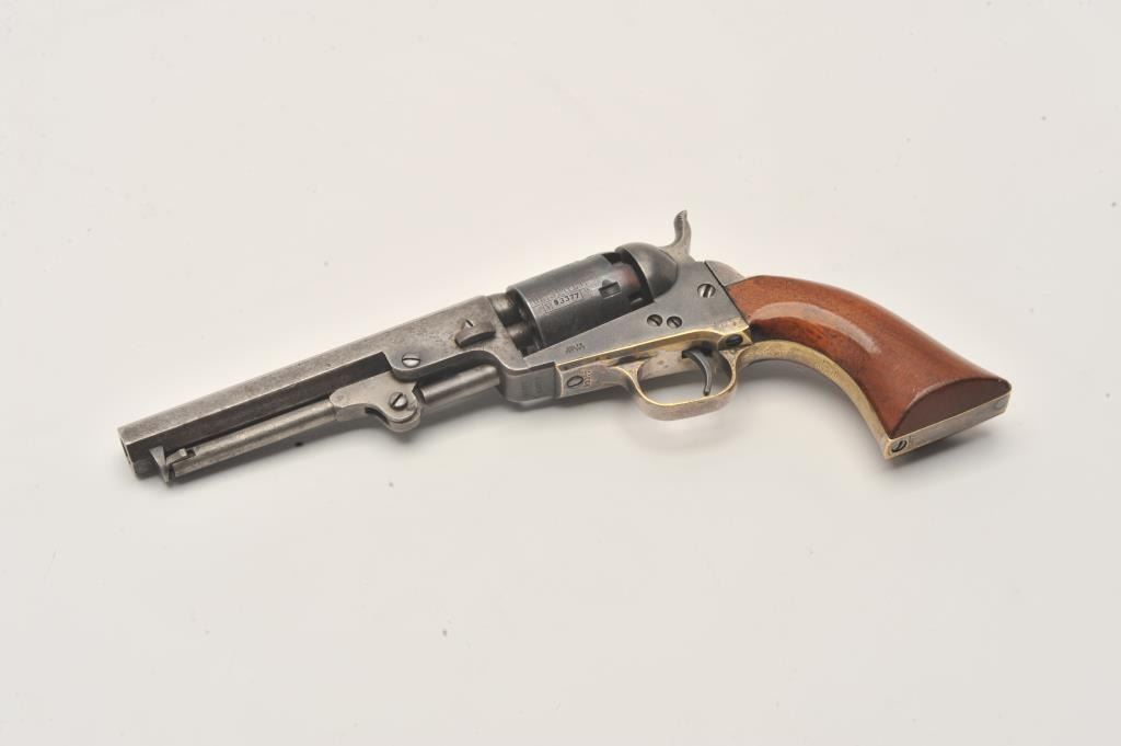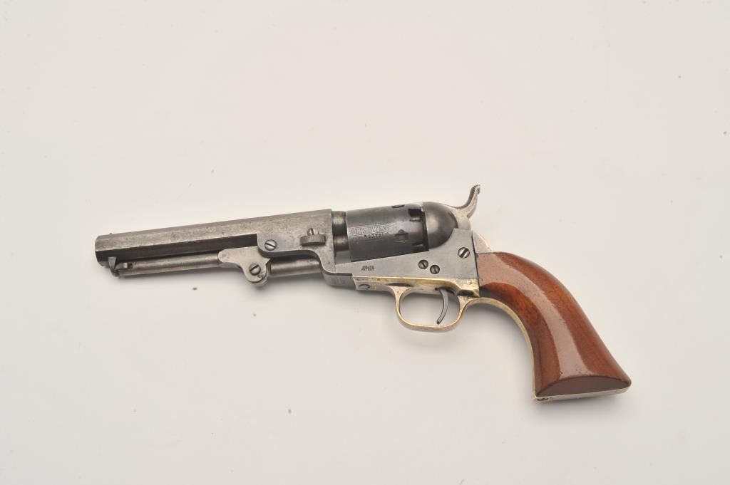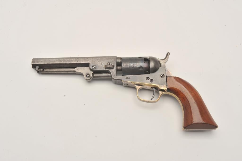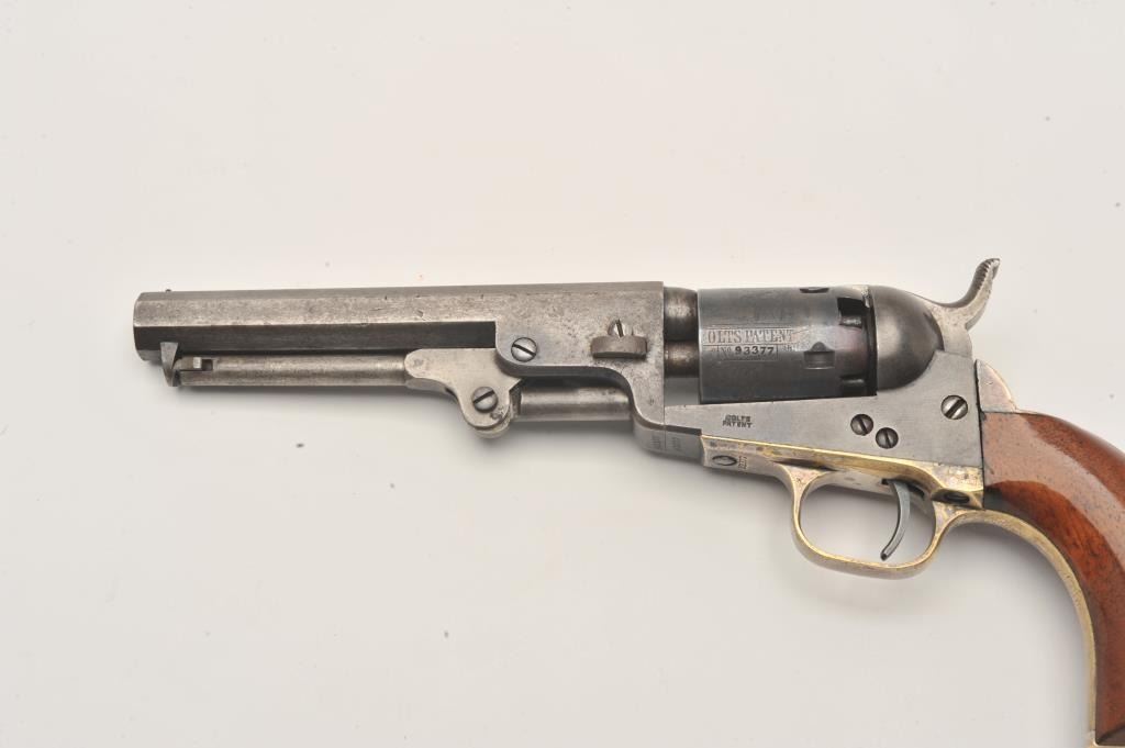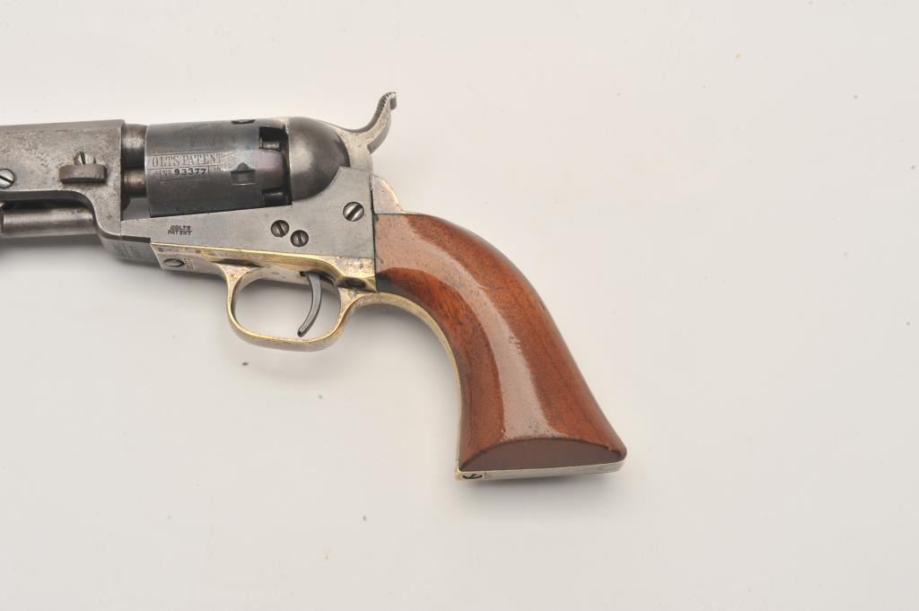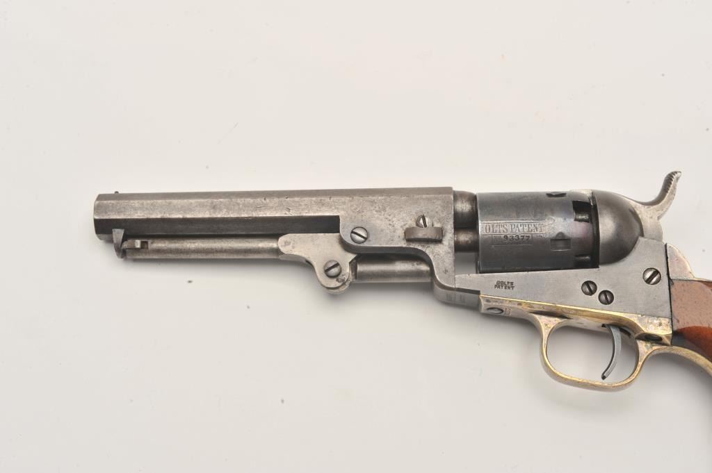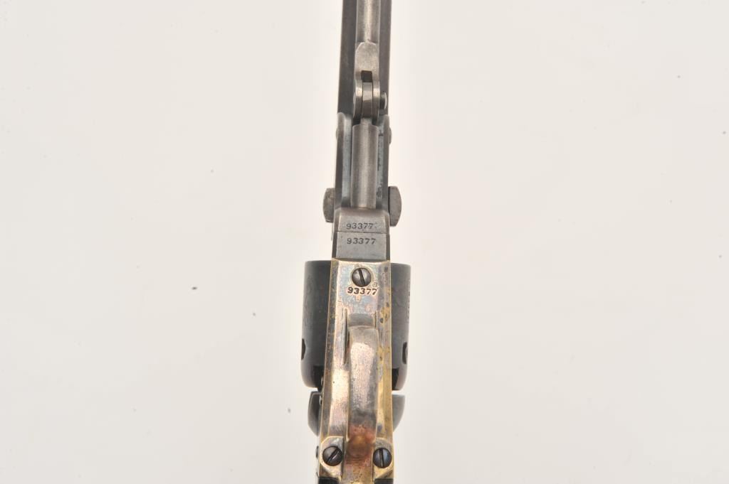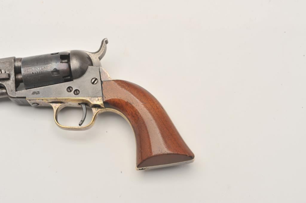 Colt 1849 Pocket percussion revolver, .31 caliber, Serial #93377. The pistol is in very good overall condition with a 5” octagon barrel. The barrel has gone to a grey patina with sharp edges and numerous small Lot Title dents and mars from carry and use. The barrel address is sharp. The frame shows old, toned case hardening while the cylinder shows significant blue finish, nearly the entire scene and all of the safety pins are Lot Title intact. The smooth wood grips are in fine condition with small mars and handling marks. The brass straps retain approximately 40-50% of their original silver finish. All visible serial numbers are matching and the Lot Title action is very good. According to the consignor the pistol was originally in the DuPont collection and is really a nice, example of Colt’s 49 Pocket. Est.: $700-$1,400. (Antique).
