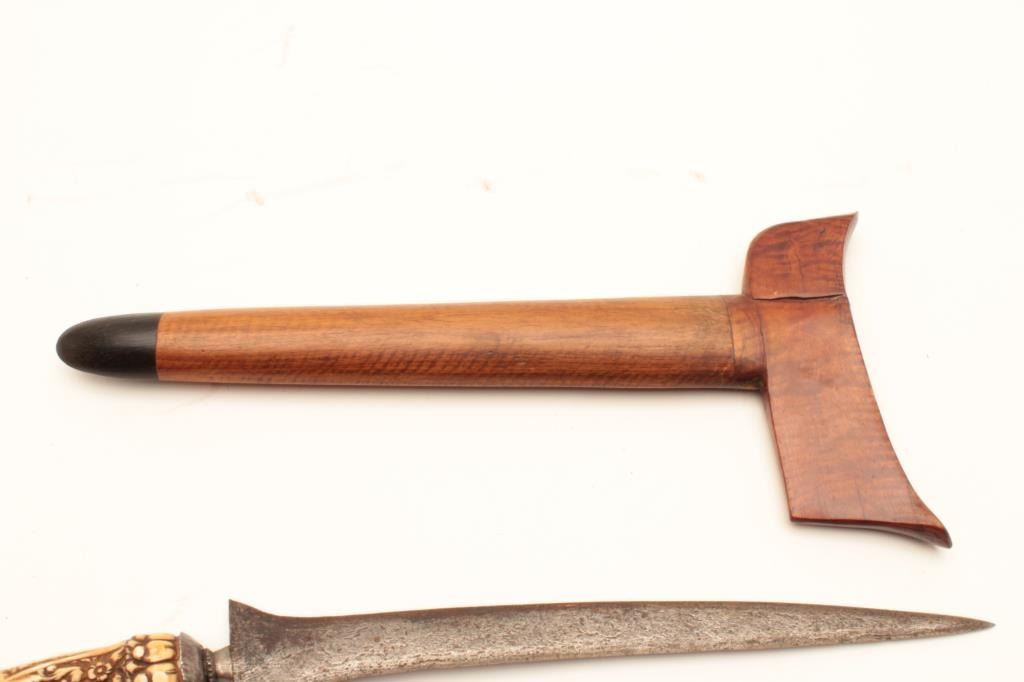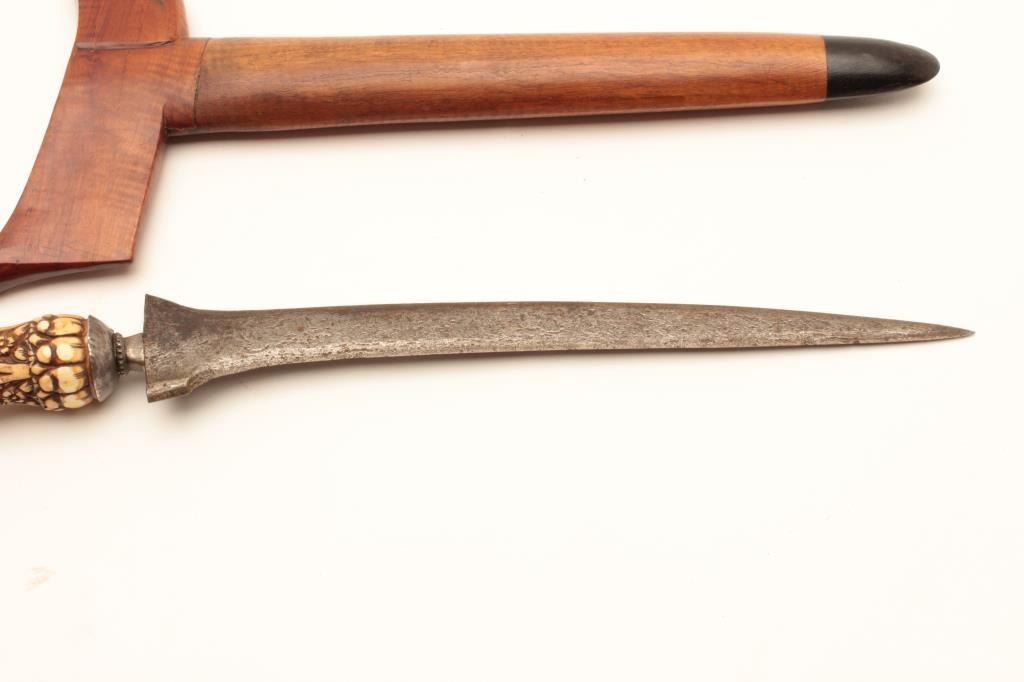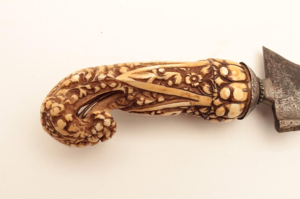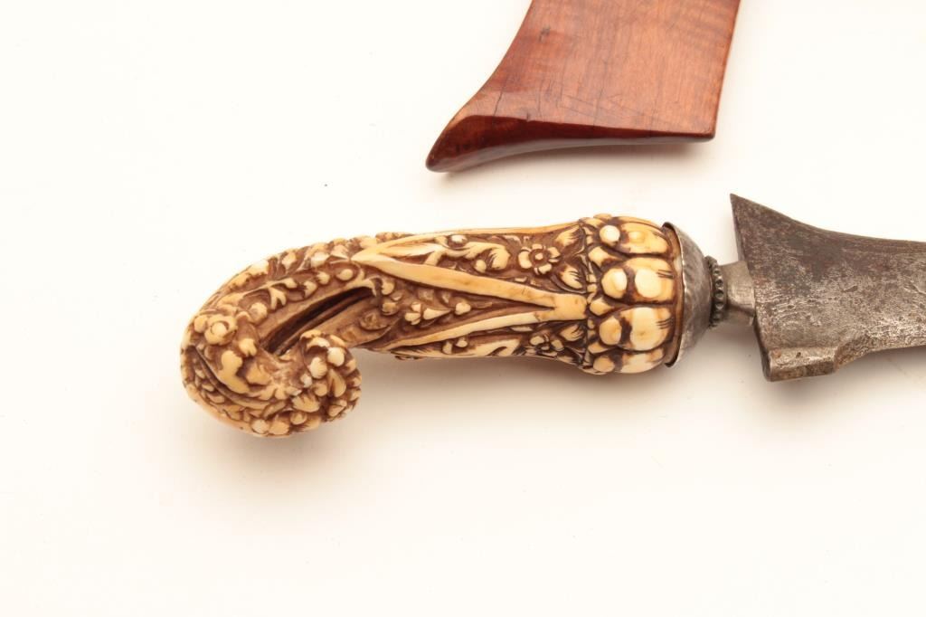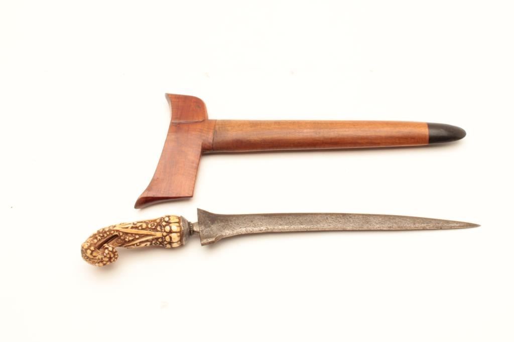 Kris with meteorite steel blade and carved grip; wood scabbard, ca. 1900 or earlier. Est.: $175-$350.