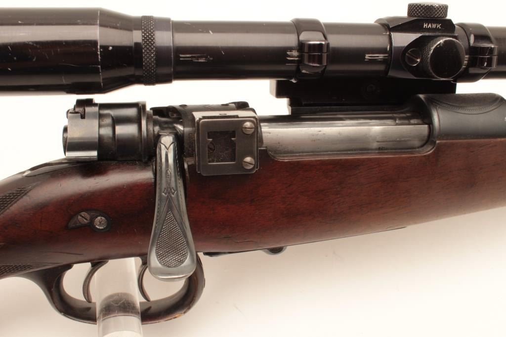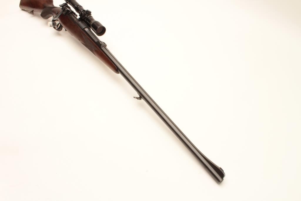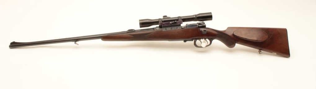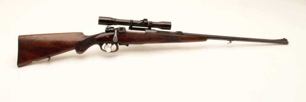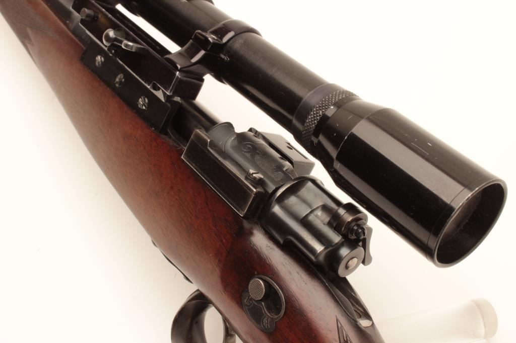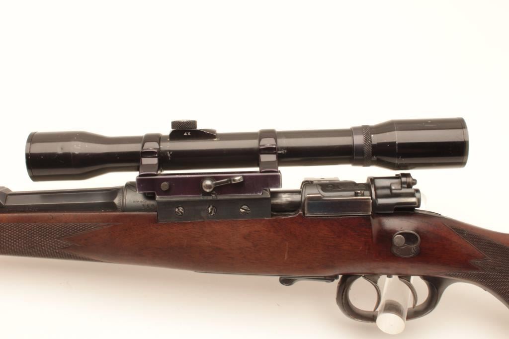 Pre-War European classic bolt action sporterized rifle by Karl Kormes, Leipzig, Germany; 8mm caliber, S/N 350; G&H side mounted 4XUnertl scope with crisp optics, Mannlicher style spoon bolt handle, double Lot Title triggers (working at time of description), side safety, quality hand made; quick release floor plate, checkered wood stock; horn trigger guard and butt plate. (C&R). Est.: $900-$1,800.