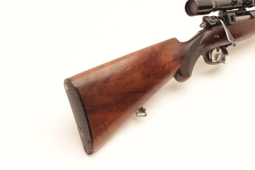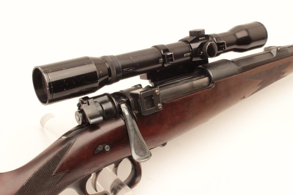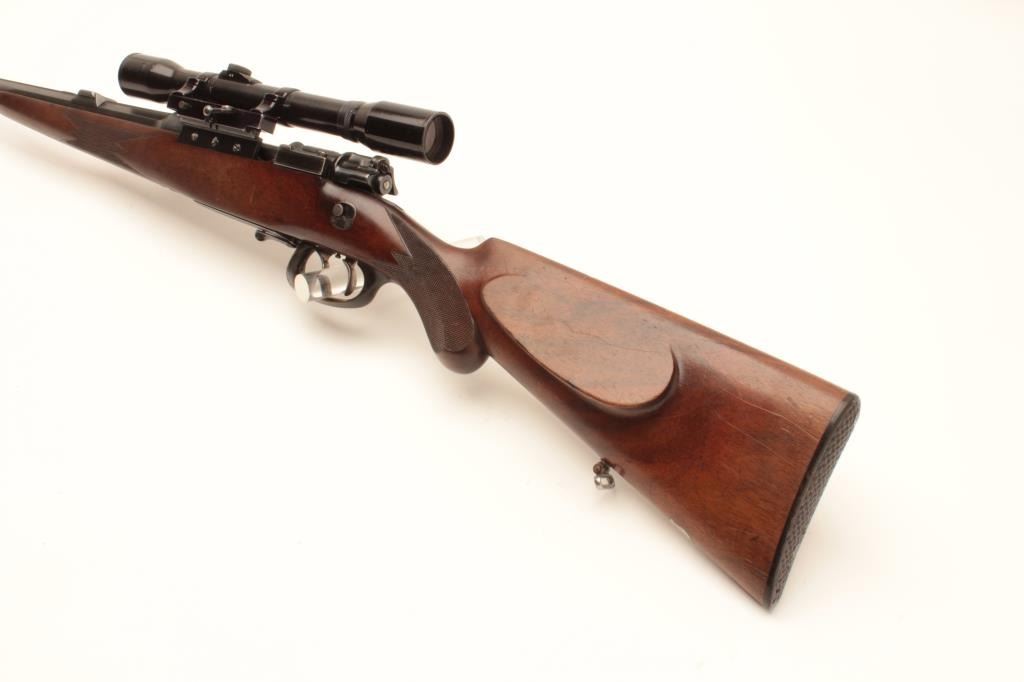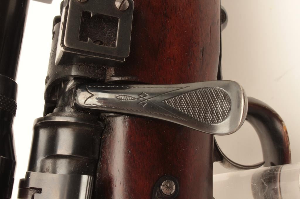 Pre-War European classic bolt action sporterized rifle by Karl Kormes, Leipzig, Germany; 8mm caliber, S/N 350; G&H side mounted 4XUnertl scope with crisp optics, Mannlicher style spoon bolt handle, double Lot Title triggers (working at time of description), side safety, quality hand made; quick release floor plate, checkered wood stock; horn trigger guard and butt plate. (C&R). Est.: $900-$1,800.