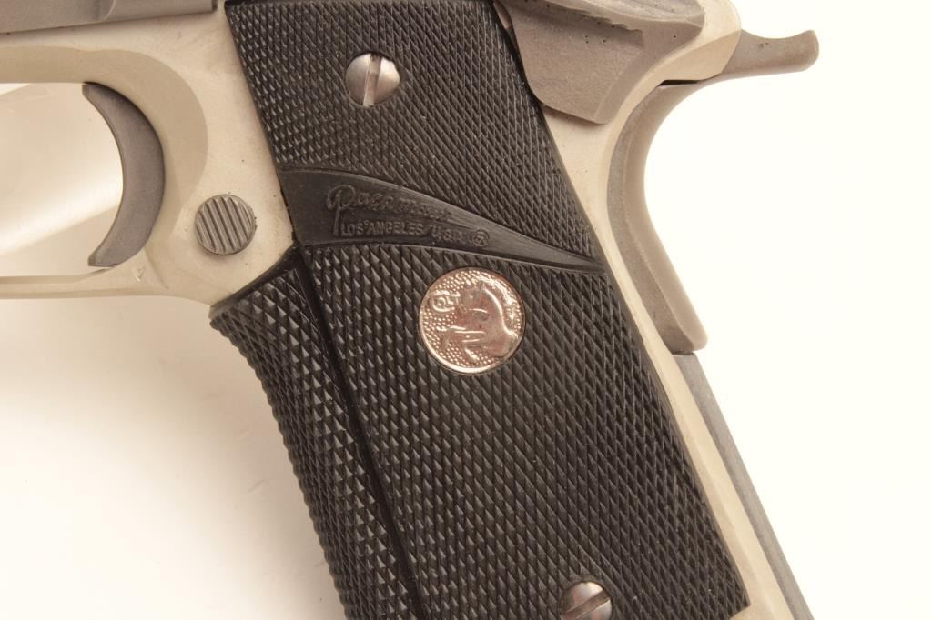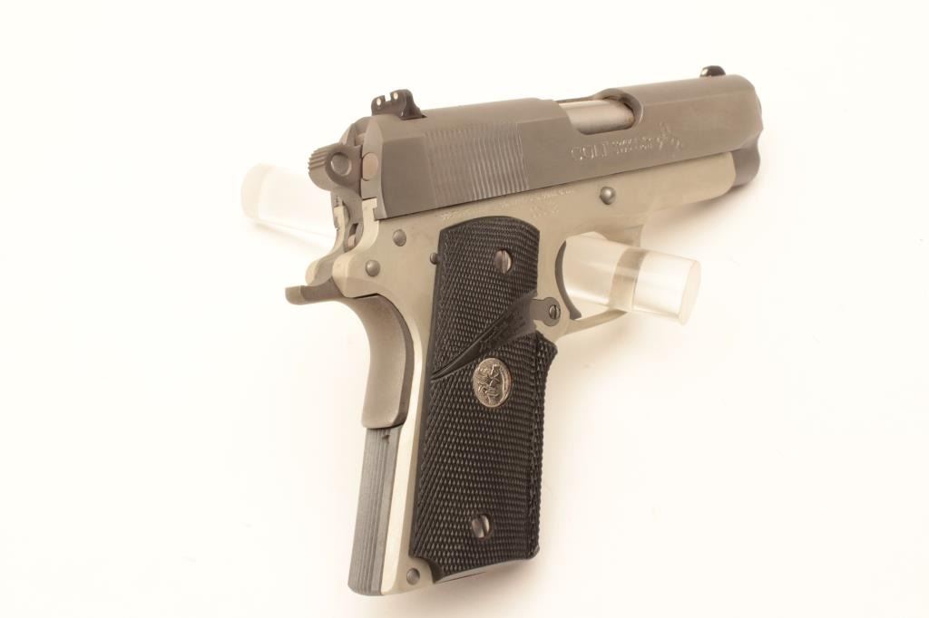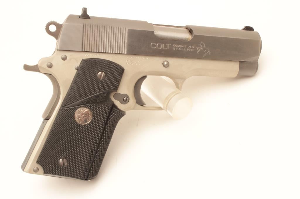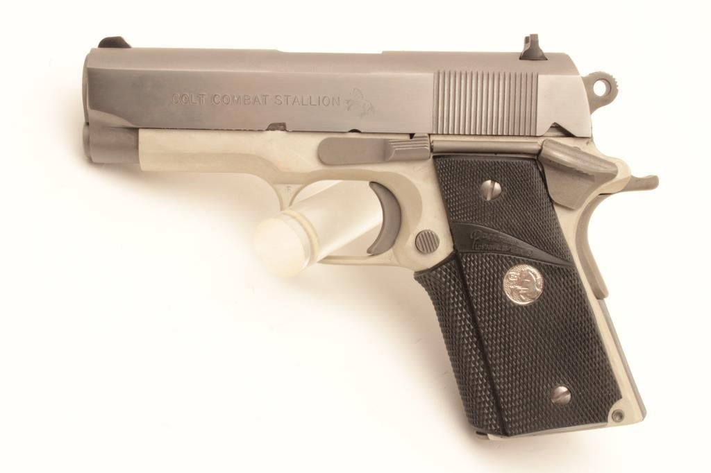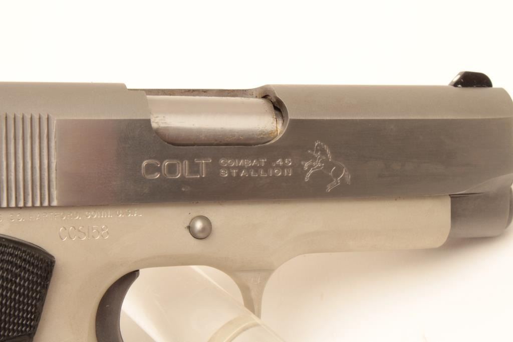 Colt Combat Stallion semi-automatic pistol, .45 ACP caliber, Serial #CCS158. This limited production lightweight officer’s model features a 3 ½” barrel with a matte stainless finish on an alloy frame and Lot Title polished stainless finish on the slide, marked Colt Combat Stallion. The grips are checkered rubber Pachmayr with silver Colt medallions. The pistol comes in the black, plastic Colt factory case with a stainless Lot Title officer’s size magazine and a full size stainless magazine. Extremely limited in production, the pistol is as new in the case and factory cardboard box with all associated packaging materials. Est.: $1,000-$2,000. Lot Title (Modern).